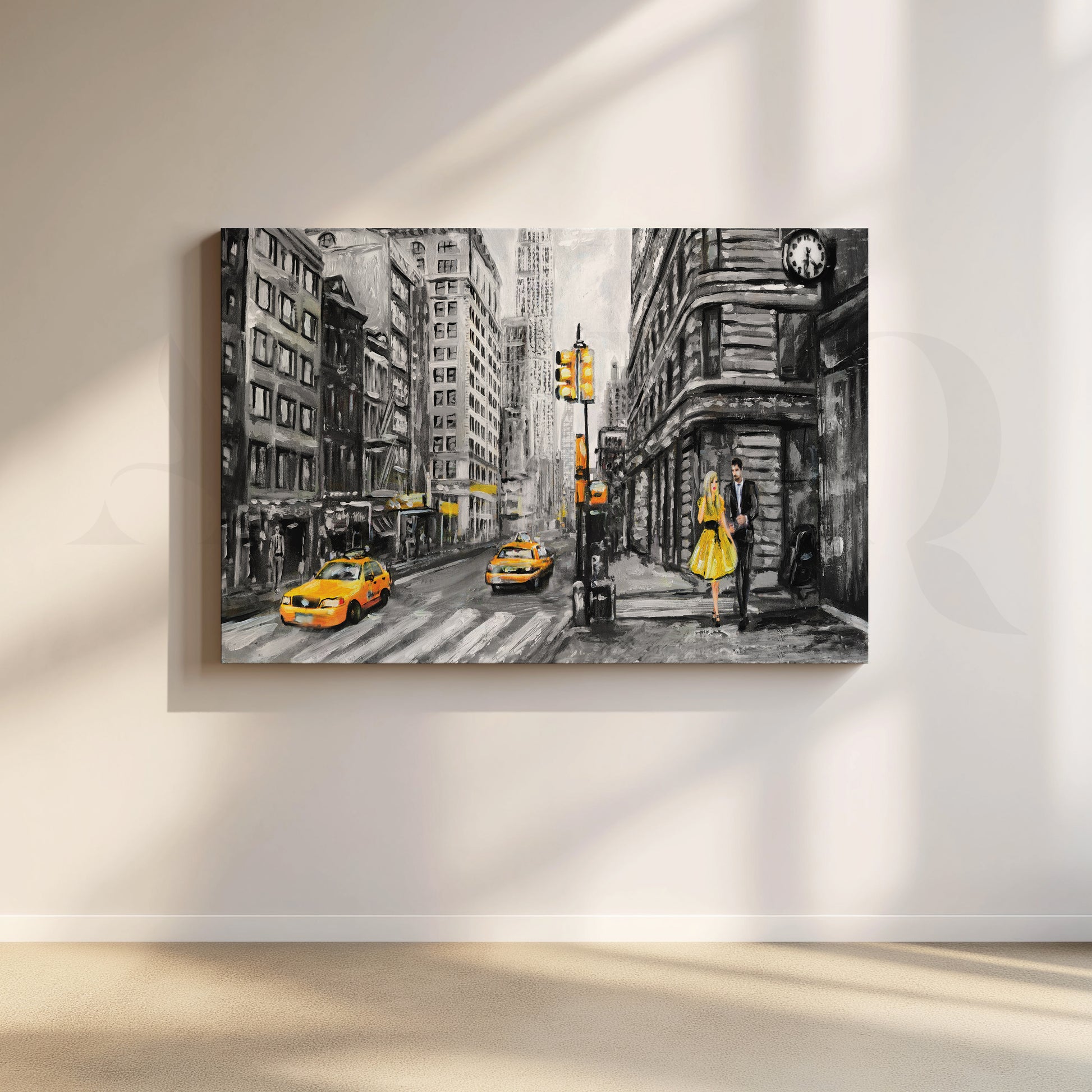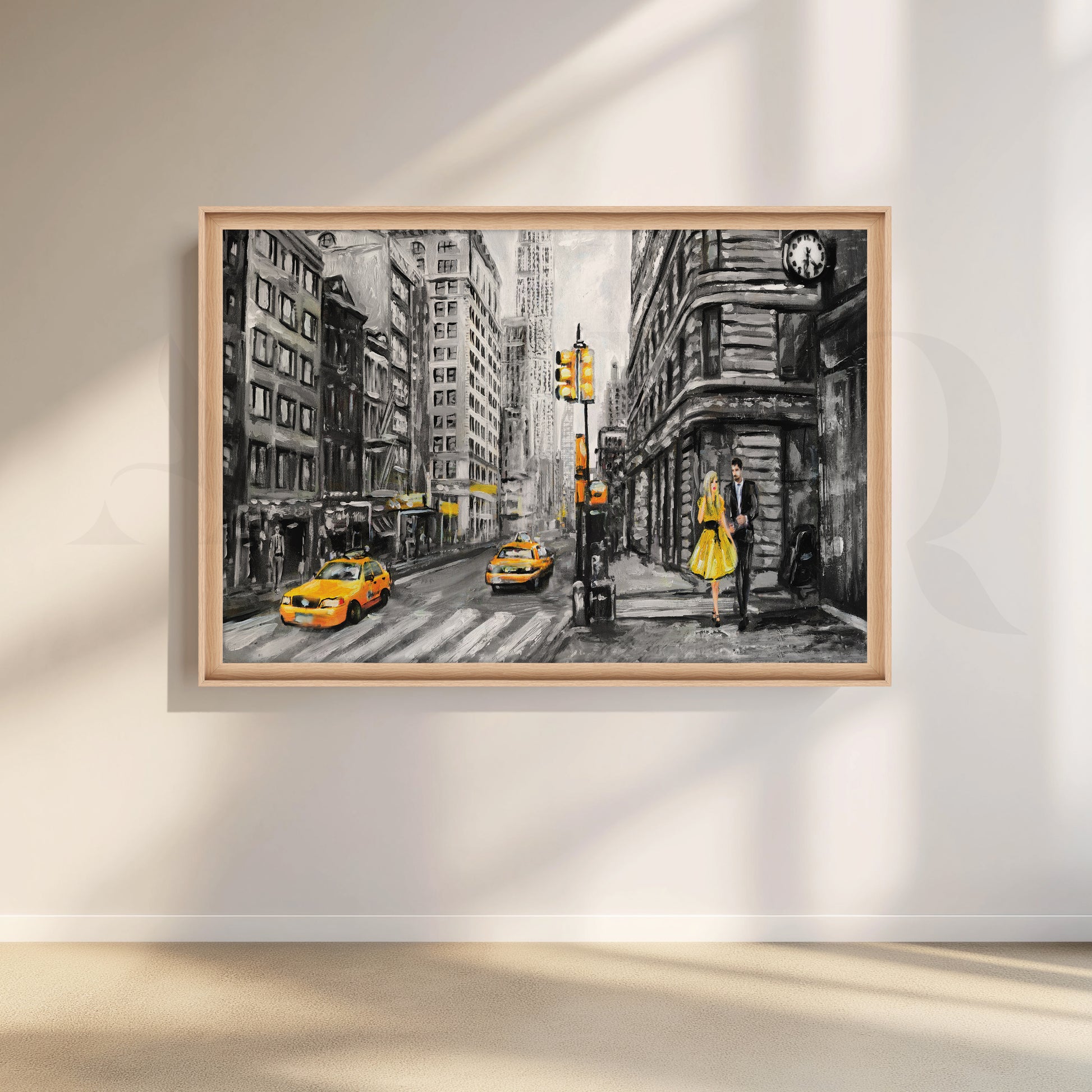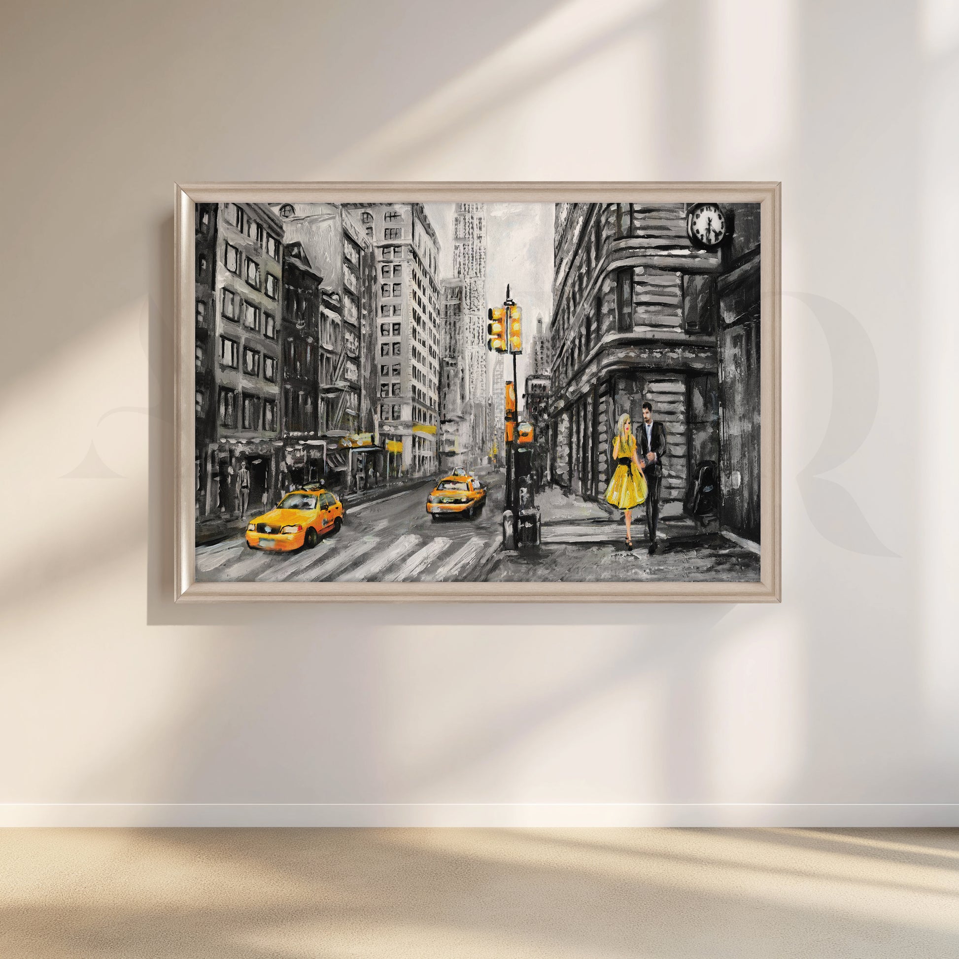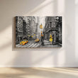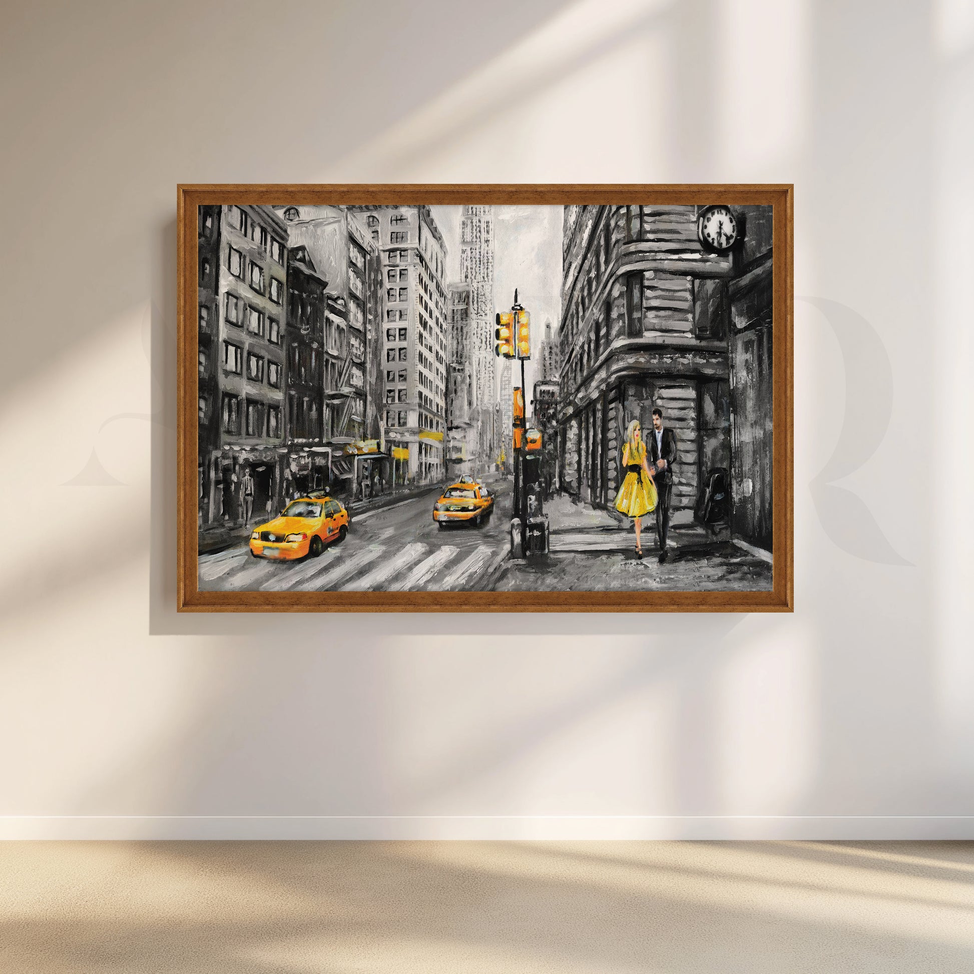 Bring the charm of New York into your home with this stunning black and white framed painting. The sweeping artwork depicts a busy Manhattan street corner, filled with yellow cabs and pedestrians. This piece is a great conversation starter and would be the perfect addition to any living room, bedroom, or office.