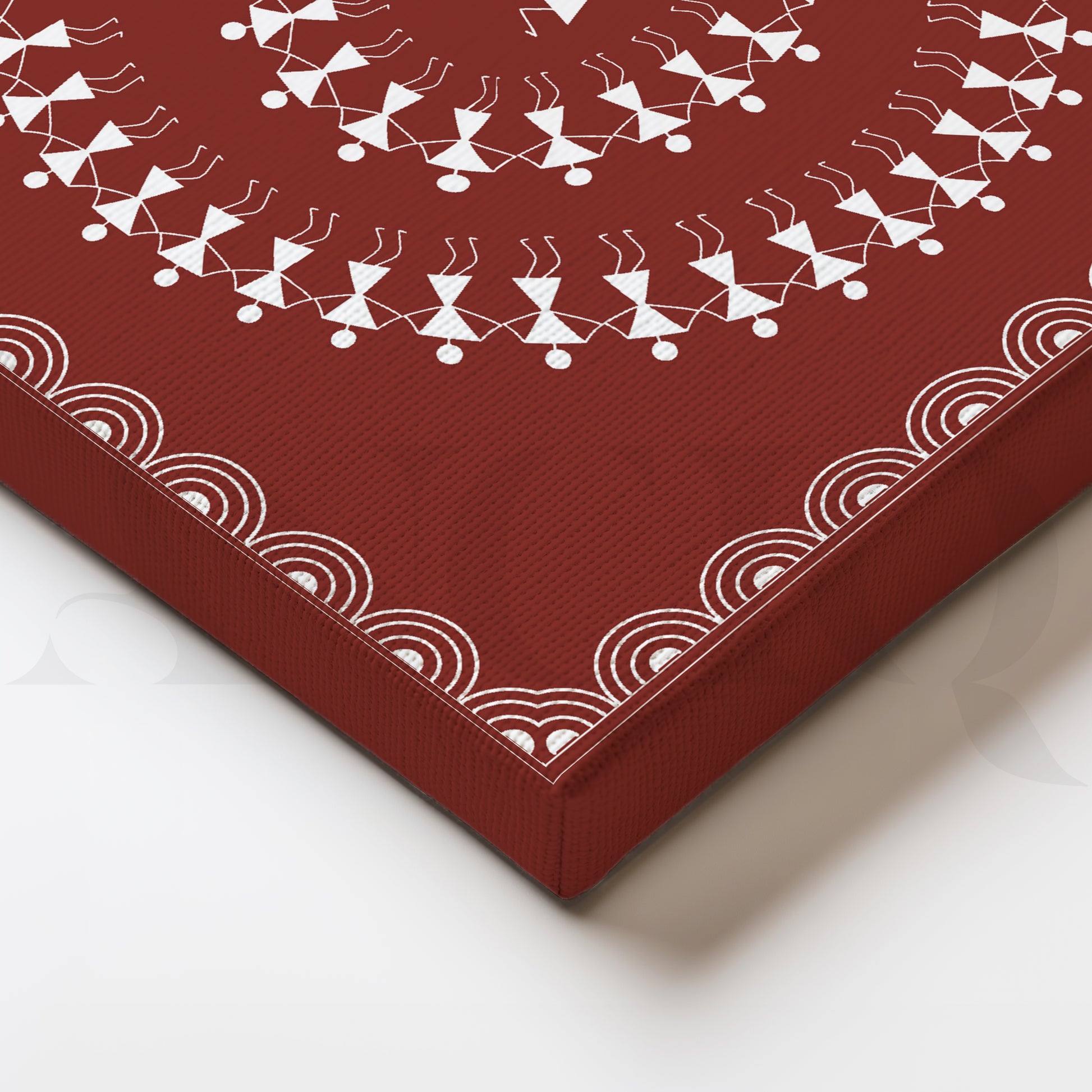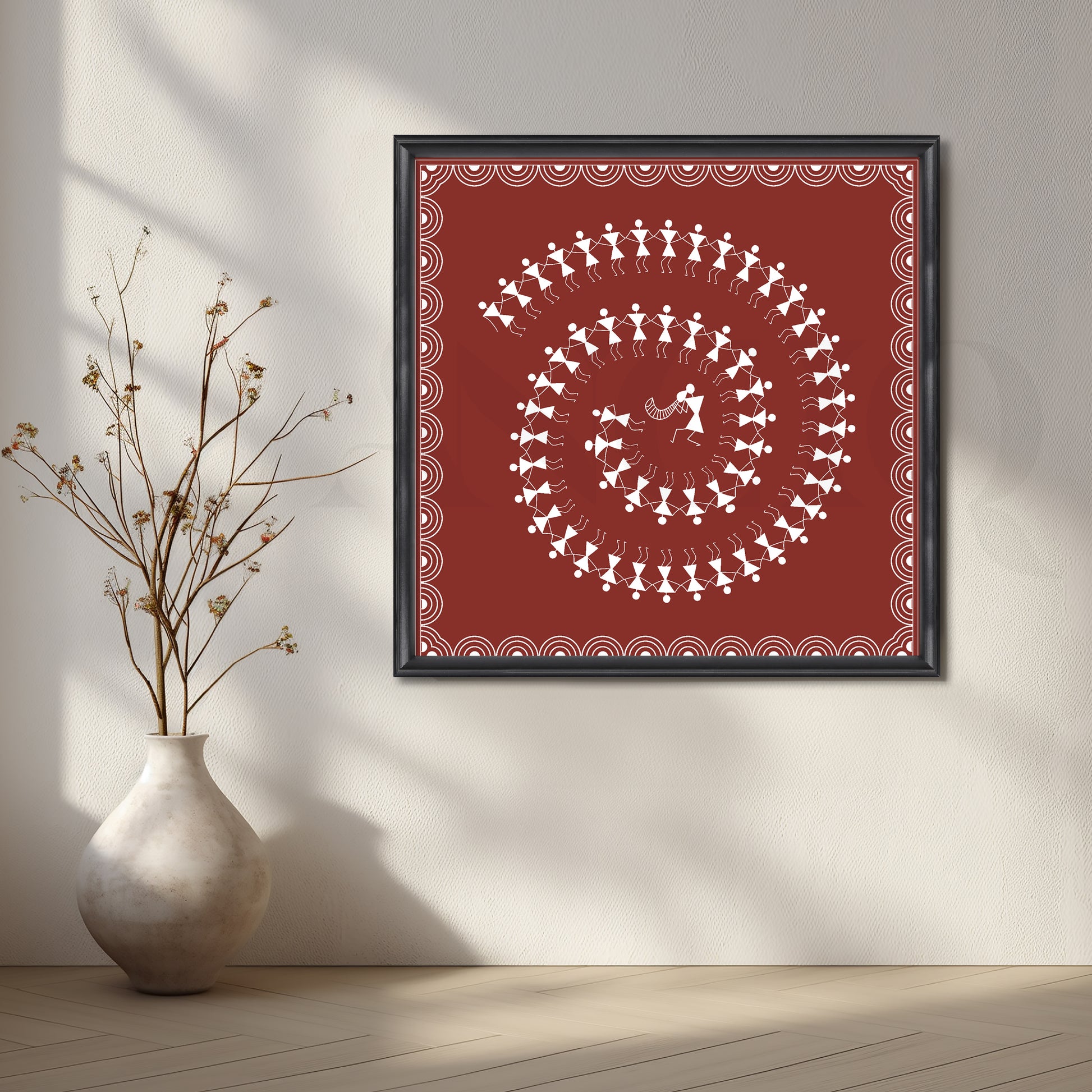 Authentic flair: The red background and white figures evoke the traditional materials used in Warli art - mud walls and rice paste paint.
