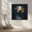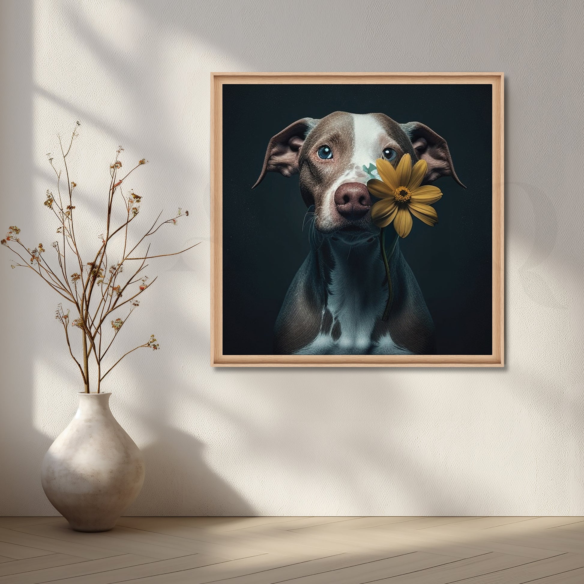 Bring sunshine into your home with this charming painting! A playful pupr proudly carries a bright yellow flower in its mouth. Captured in canvas, this piece is sure to add joy and warmth to any room.