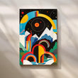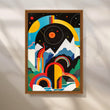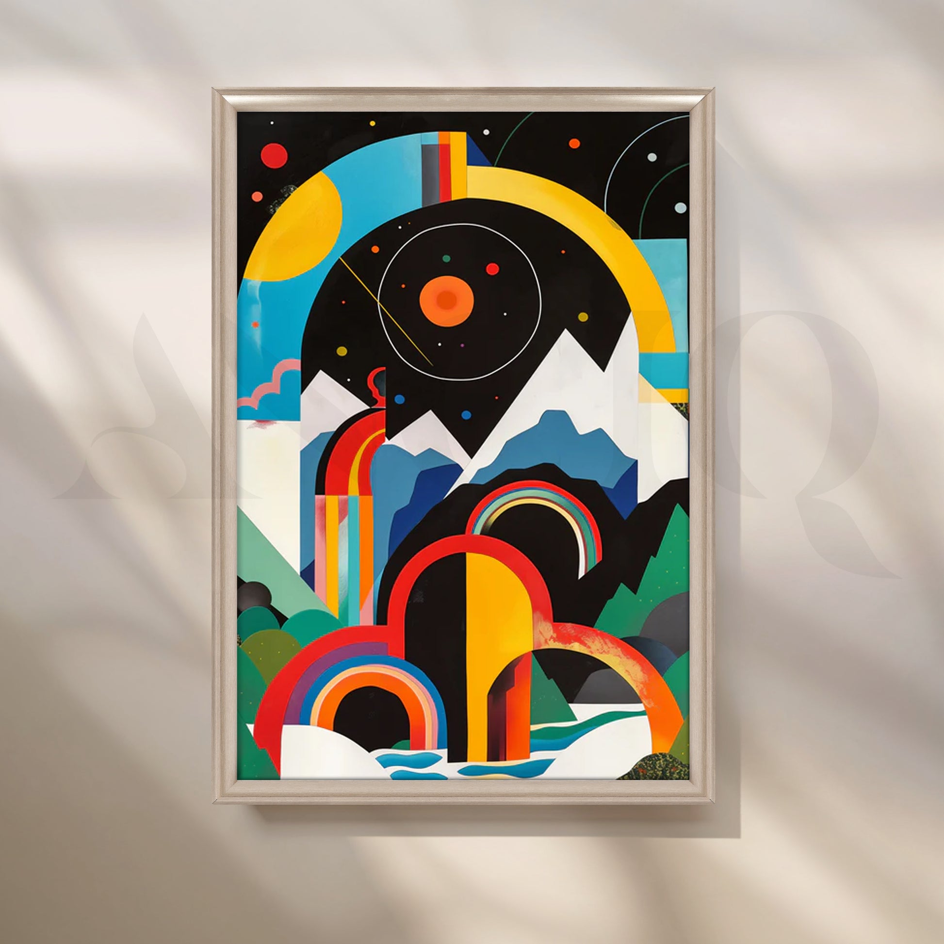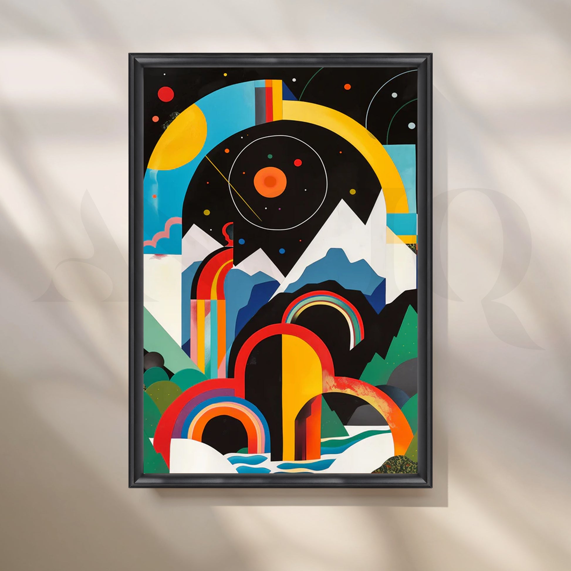 Striking geometric landscape of rainbow arches, cascading stripes and white mountain peaks beneath a midnight sky of planets and orbital rings. Bold Bauhaus shapes in saffron, teal, cobalt and coral create a modern, mid-century vibe—perfect statement art for a living room, office or entryway. Keywords: geometric wall art, abstract rainbow canvas, Bauhaus poster, mid-century modern décor, cosmic landscape painting, colorful shapes artwork, black background art print, modern living room wall decor, Scandinavian style canvas.
