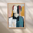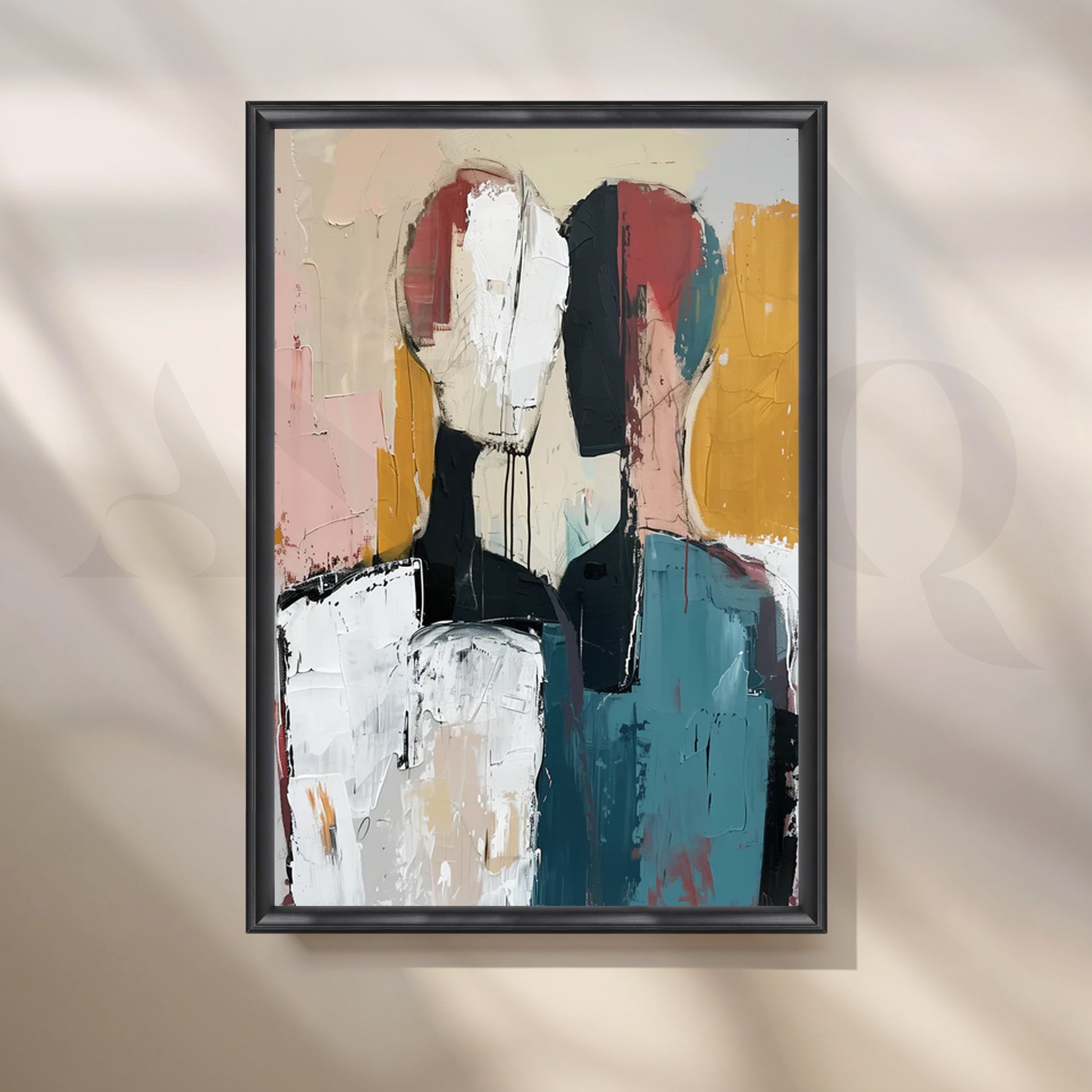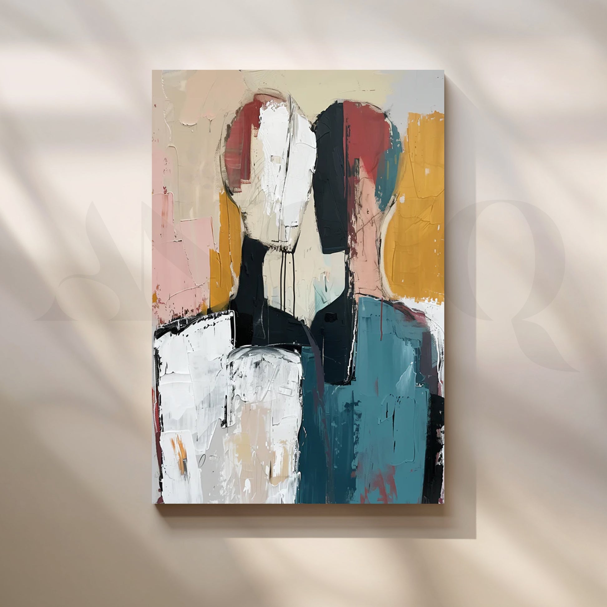 “Muted Companions” is an abstract canvas painting of two faceless figures built with bold palette-knife strokes in teal, mustard, blush, charcoal and ivory. The textured layers, drips and soft neutrals create a serene yet striking focal point—perfect modern wall art for a large living room, open-plan dining area, or minimalist entryway. Style this contemporary canvas over a sofa or console to introduce gallery-inspired texture and warmth to your décor. Ideal for shoppers searching for abstract canvas painting, large living room art, minimalist wall décor, modern abstract figure art, and neutral boho décor.