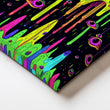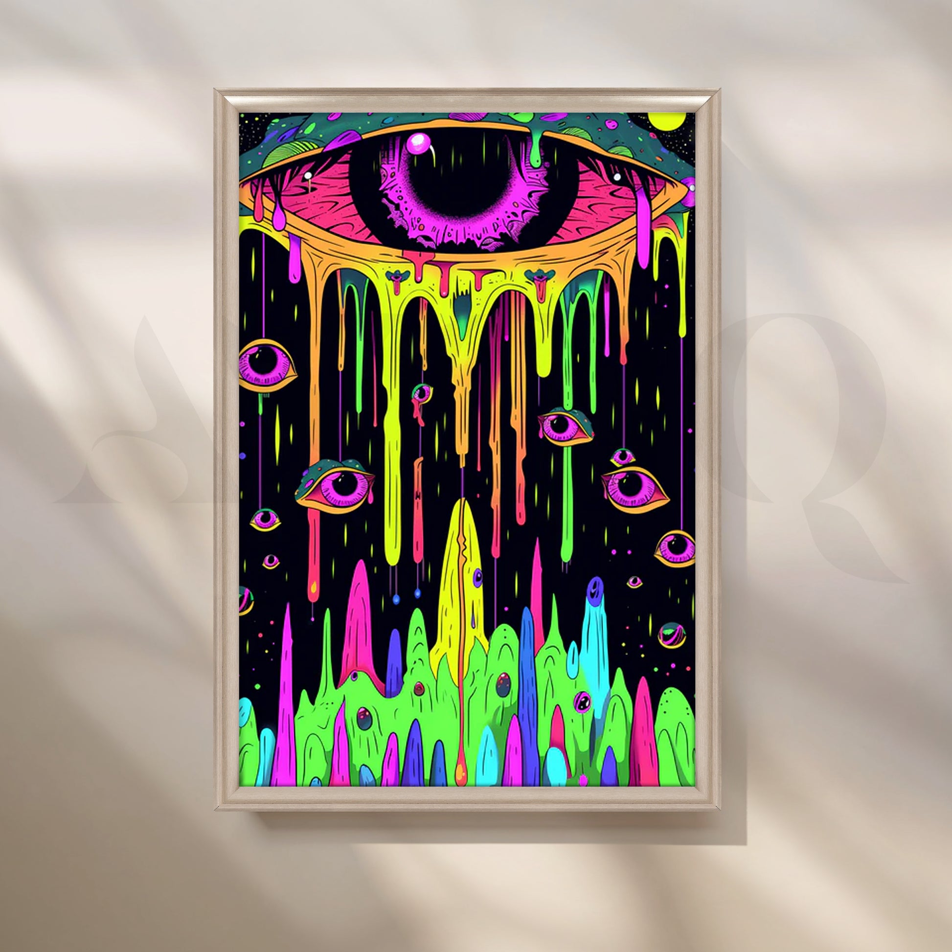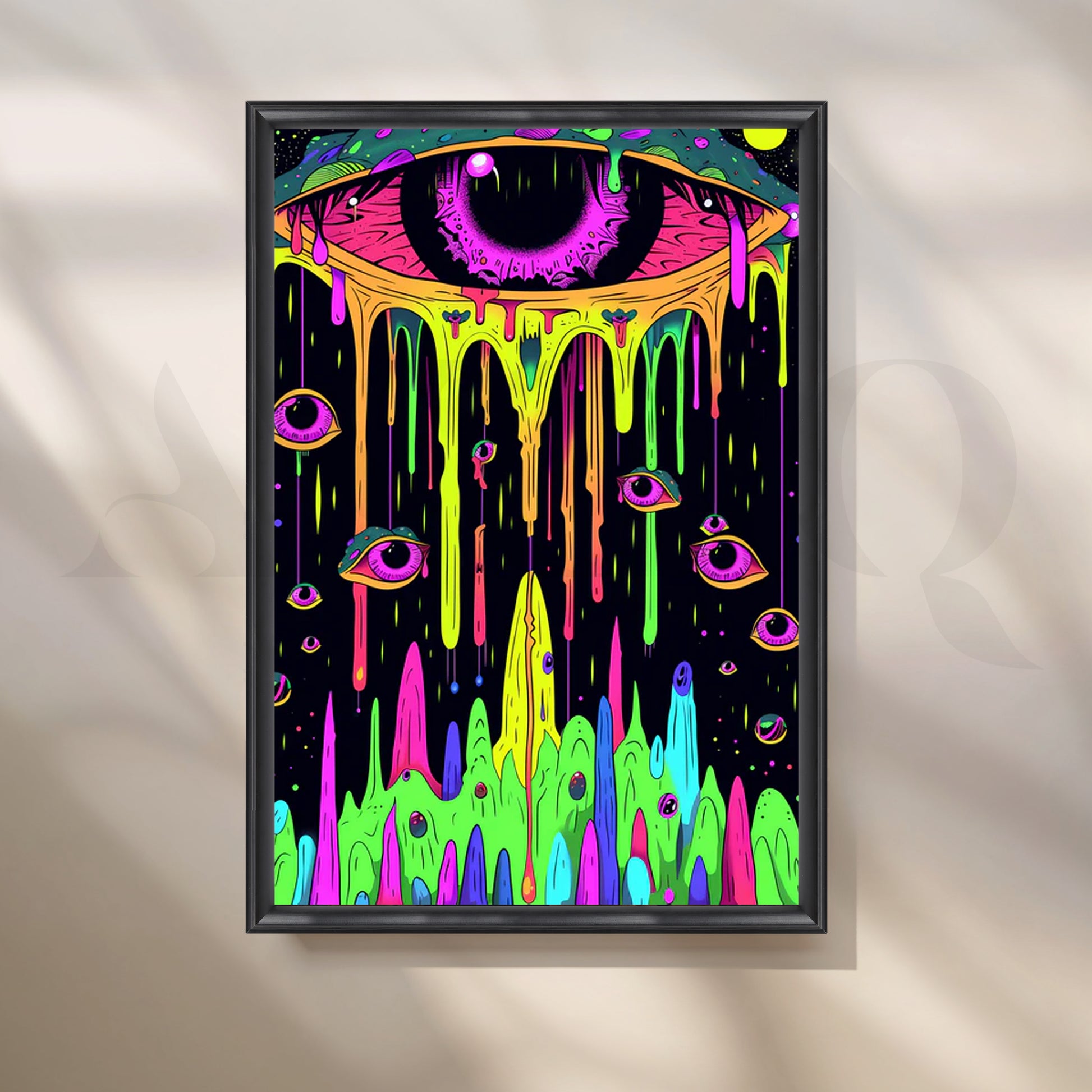Pop-art meets surrealism in this neon eye artwork—electric pinks, limes, cyans, and yellows streaming like liquid light over a deep black background. Perfect for a music studio, dorm, or gaming setup, this modern wall art injects high-contrast color and edgy street-art attitude. Use as bold accent décor, gallery wall centerpiece, or large canvas painting to energize contemporary spaces that crave vibrant, psychedelic art.