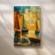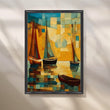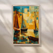 This abstract canvas artwork features sailboats reflected on water in warm golden, teal, and amber blocks, inspired by cubist coastal art. Bold colours and geometric shapes make it perfect as living room wall art, dining room décor, or office canvas painting for anyone searching for modern nautical abstract wall art.