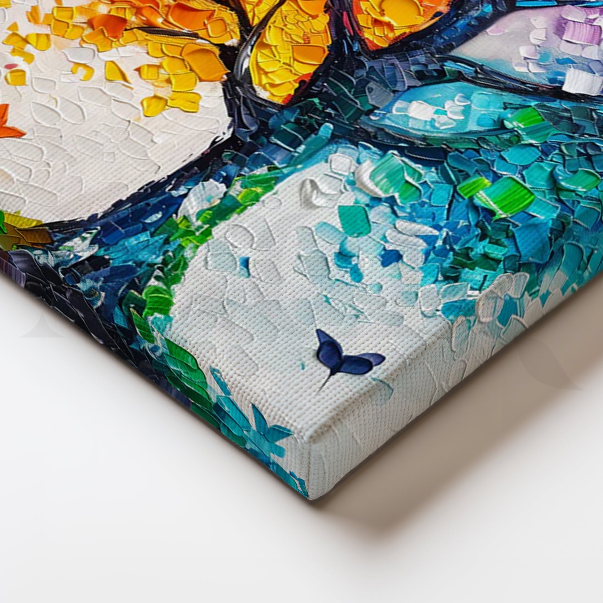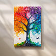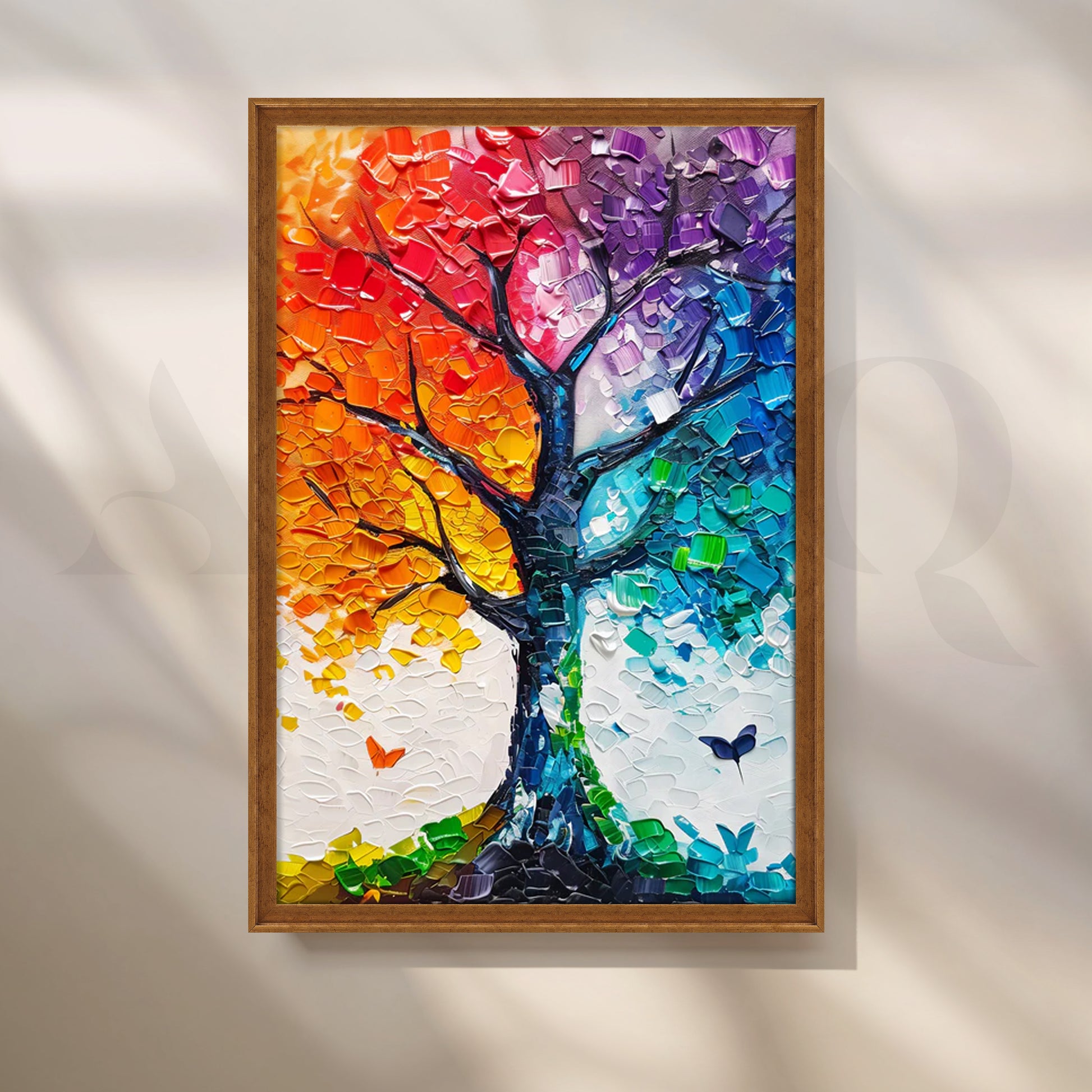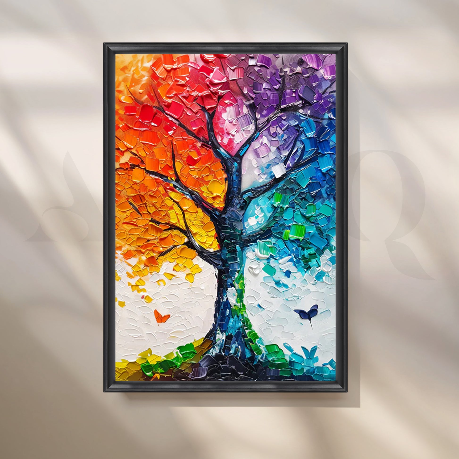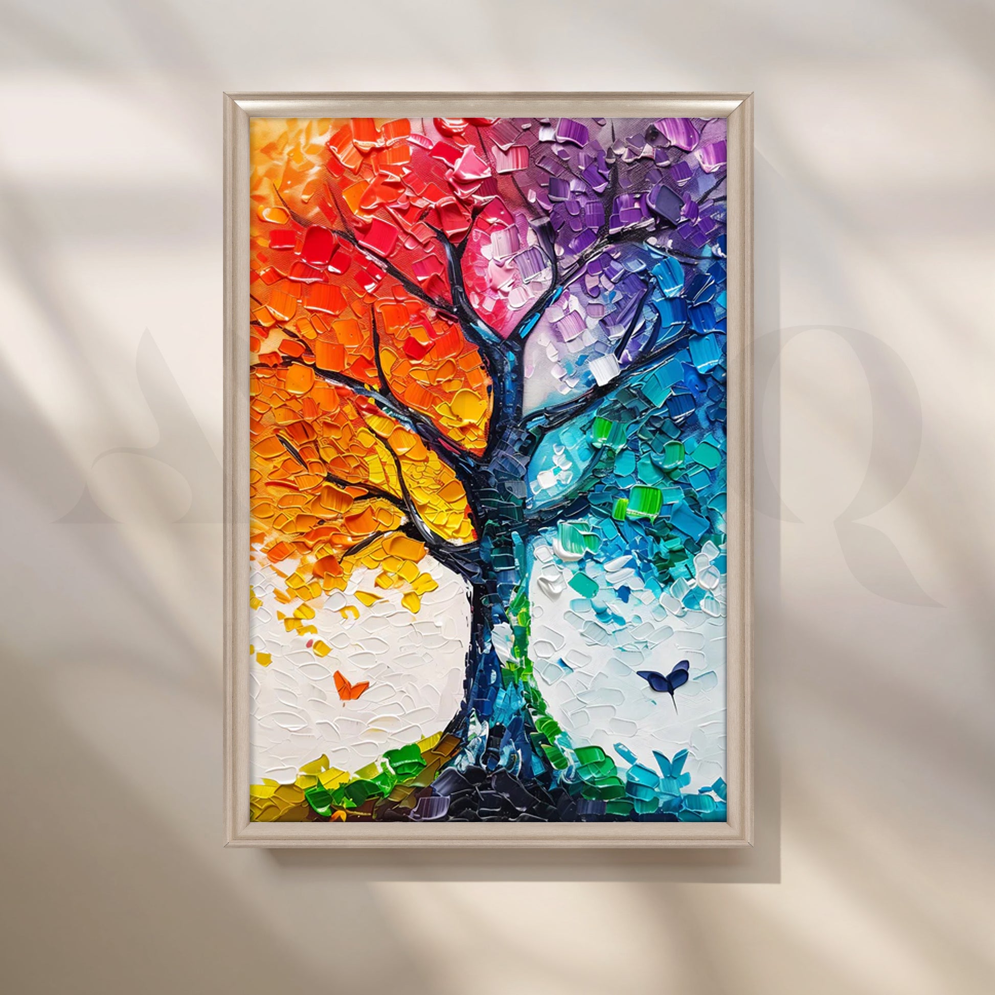 A dazzling rainbow tree rendered in chunky palette-knife strokes—warm reds and oranges blending into violets, teals and aqua on a crisp white ground, with delicate butterflies for movement. The thick impasto texture catches light beautifully, creating a 3D effect that lifts modern interiors. Perfect statement art above a sofa, console or entryway. Keywords: colorful tree wall art, rainbow canvas painting, palette knife textured art, abstract nature artwork, vibrant living room décor, modern impasto painting, large wall art for home, multicolor tree canvas.