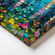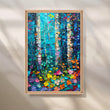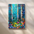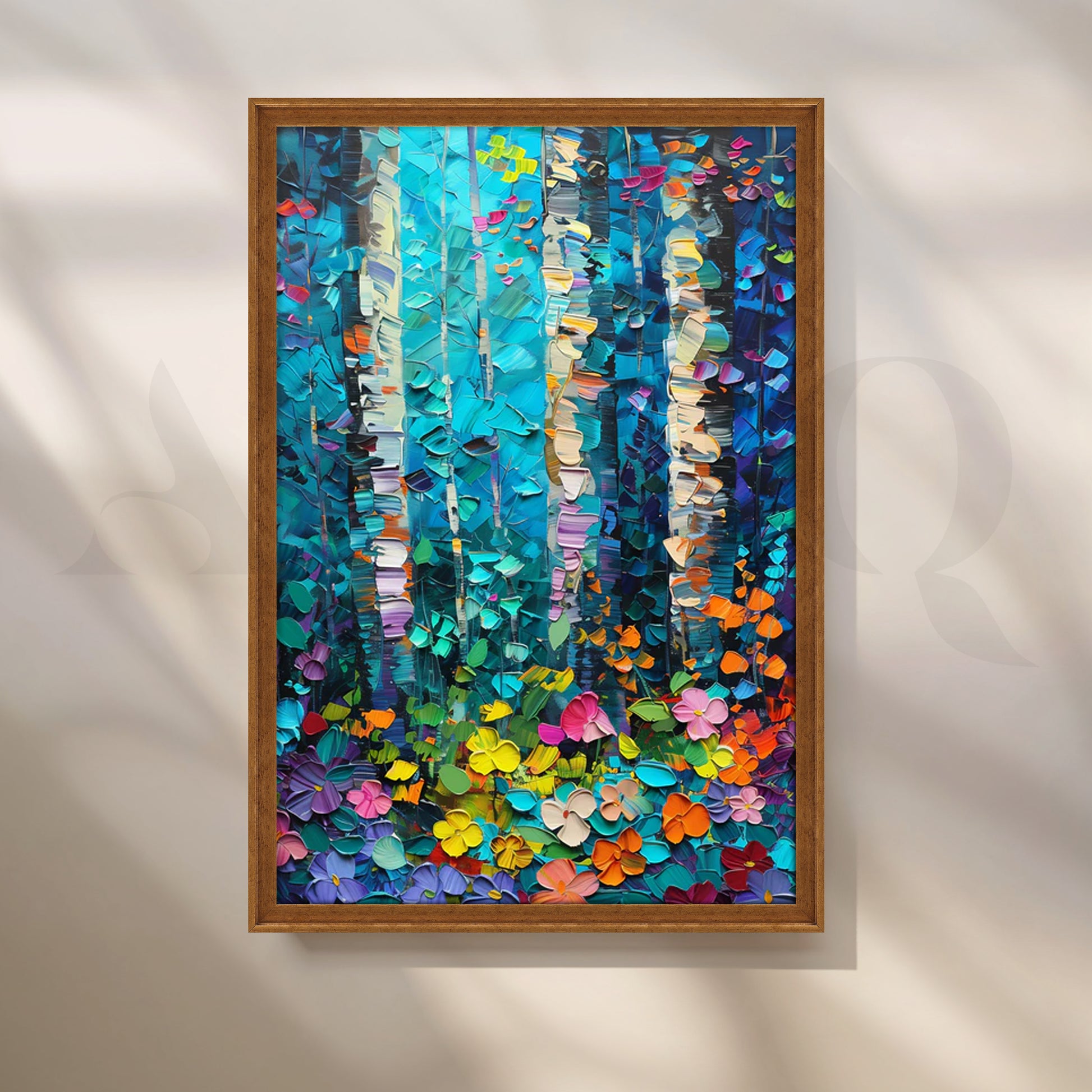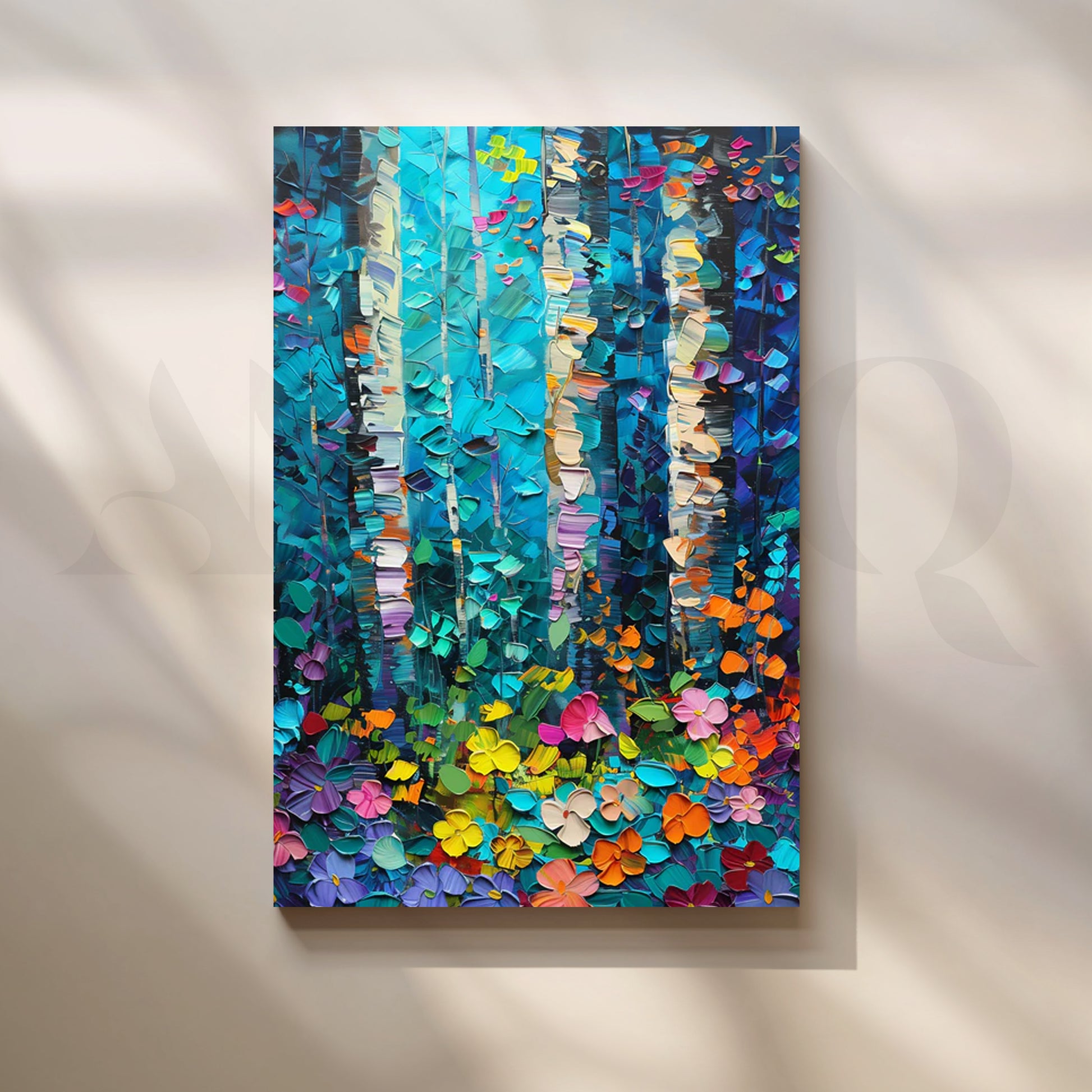 Lush palette-knife landscape of shimmering birch trees rising through a teal blue forest, grounded by a carpet of rainbow florals. Thick impasto texture catches the light for a vibrant 3D effect—perfect statement wall art above a sofa or console. Keywords: birch tree wall art, impasto canvas painting, textured abstract forest, teal blue landscape art, colorful flower artwork, palette knife décor, large living room canvas, modern nature painting.