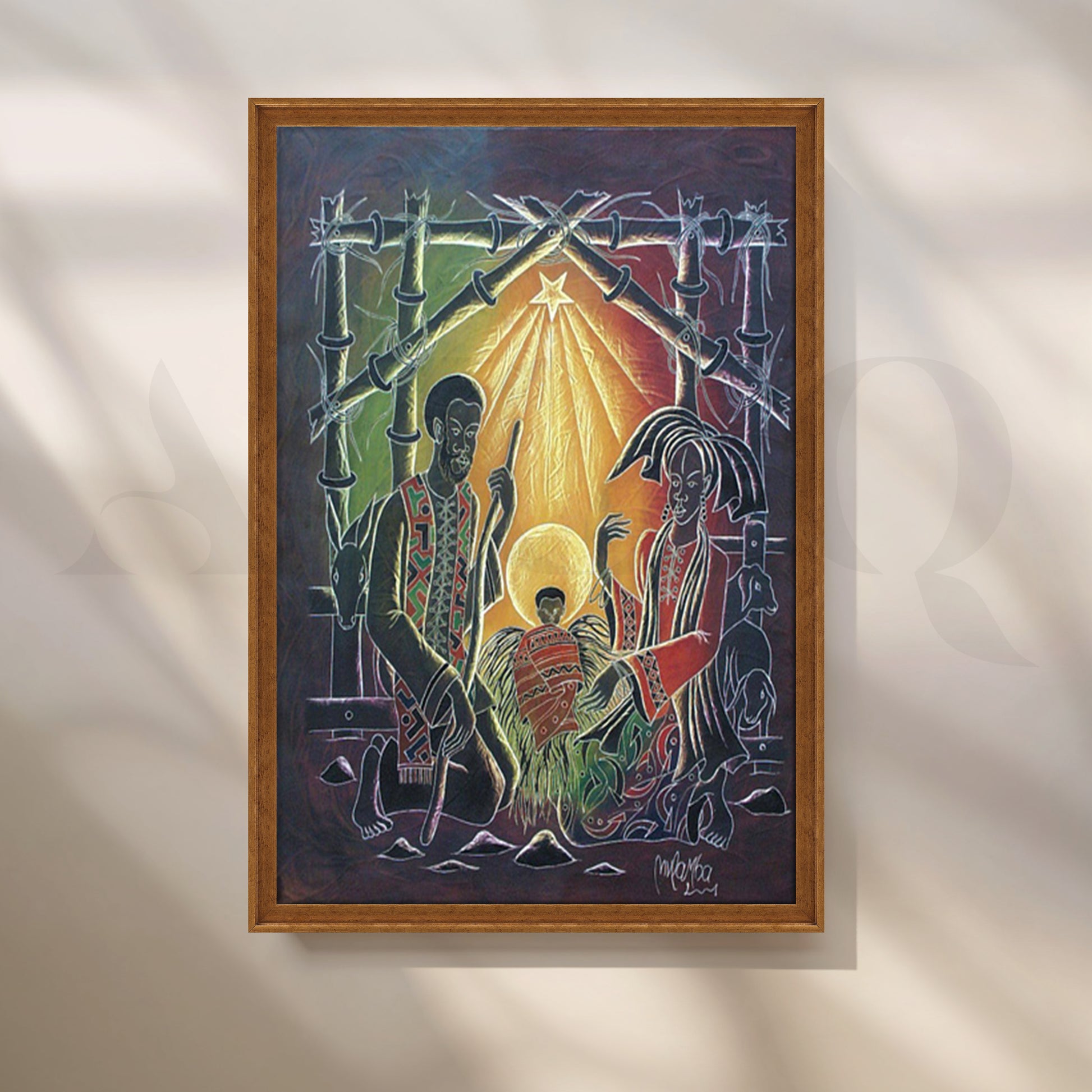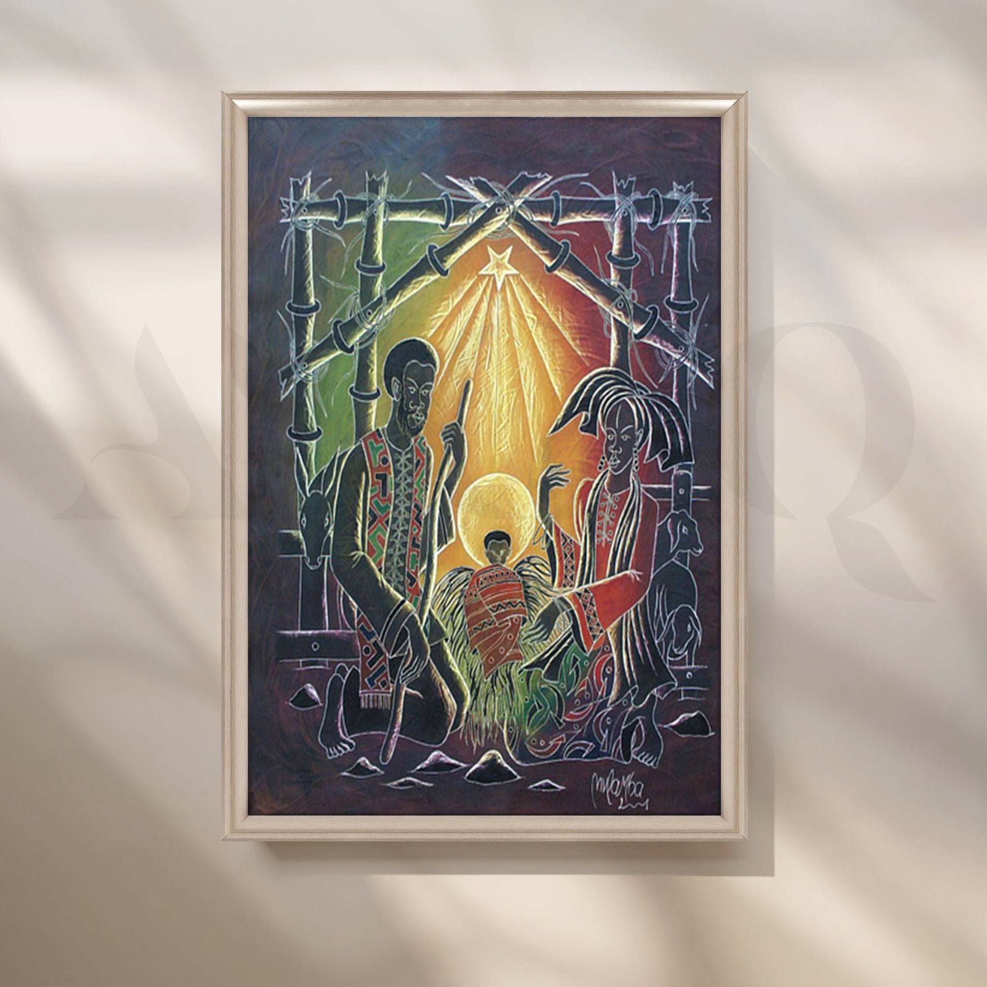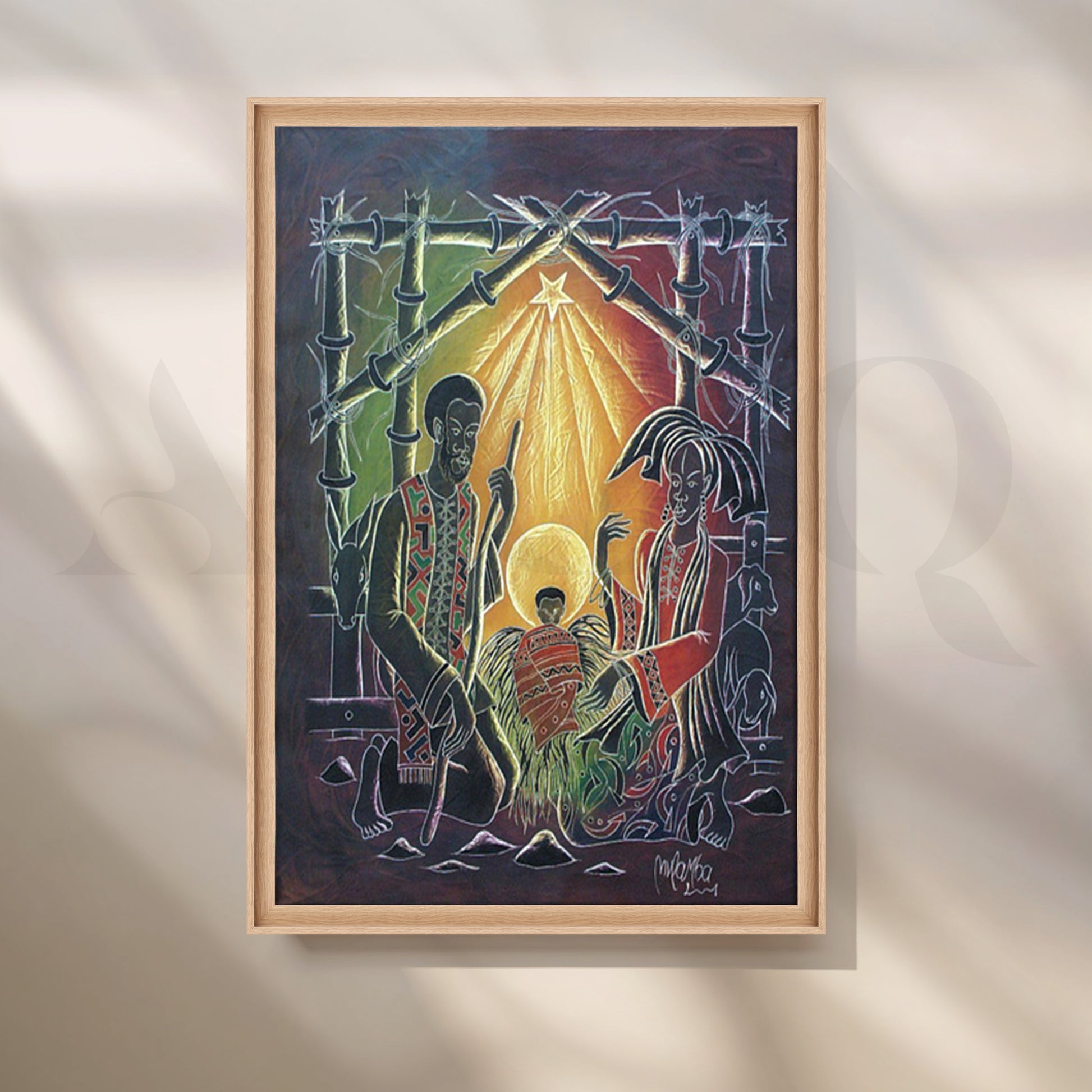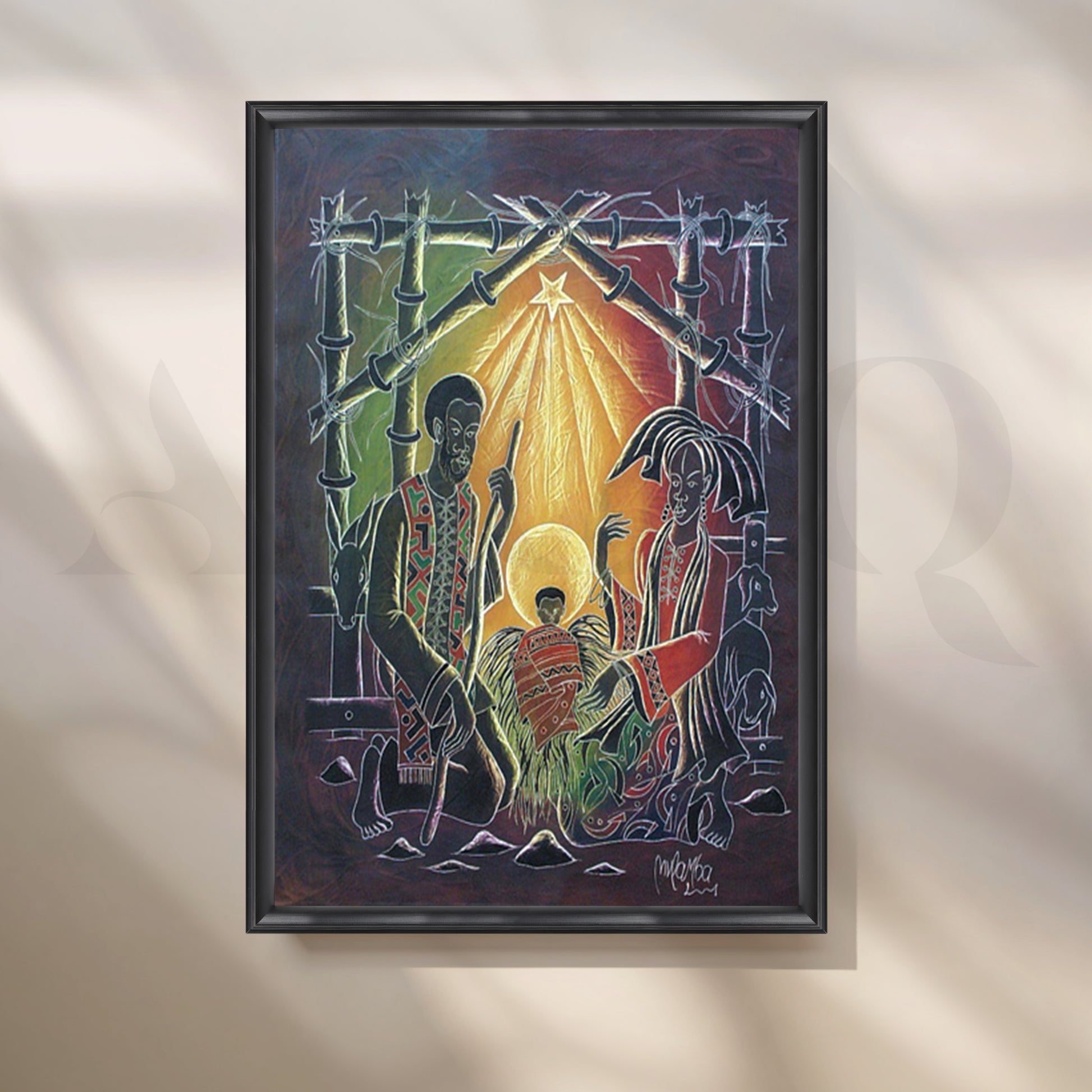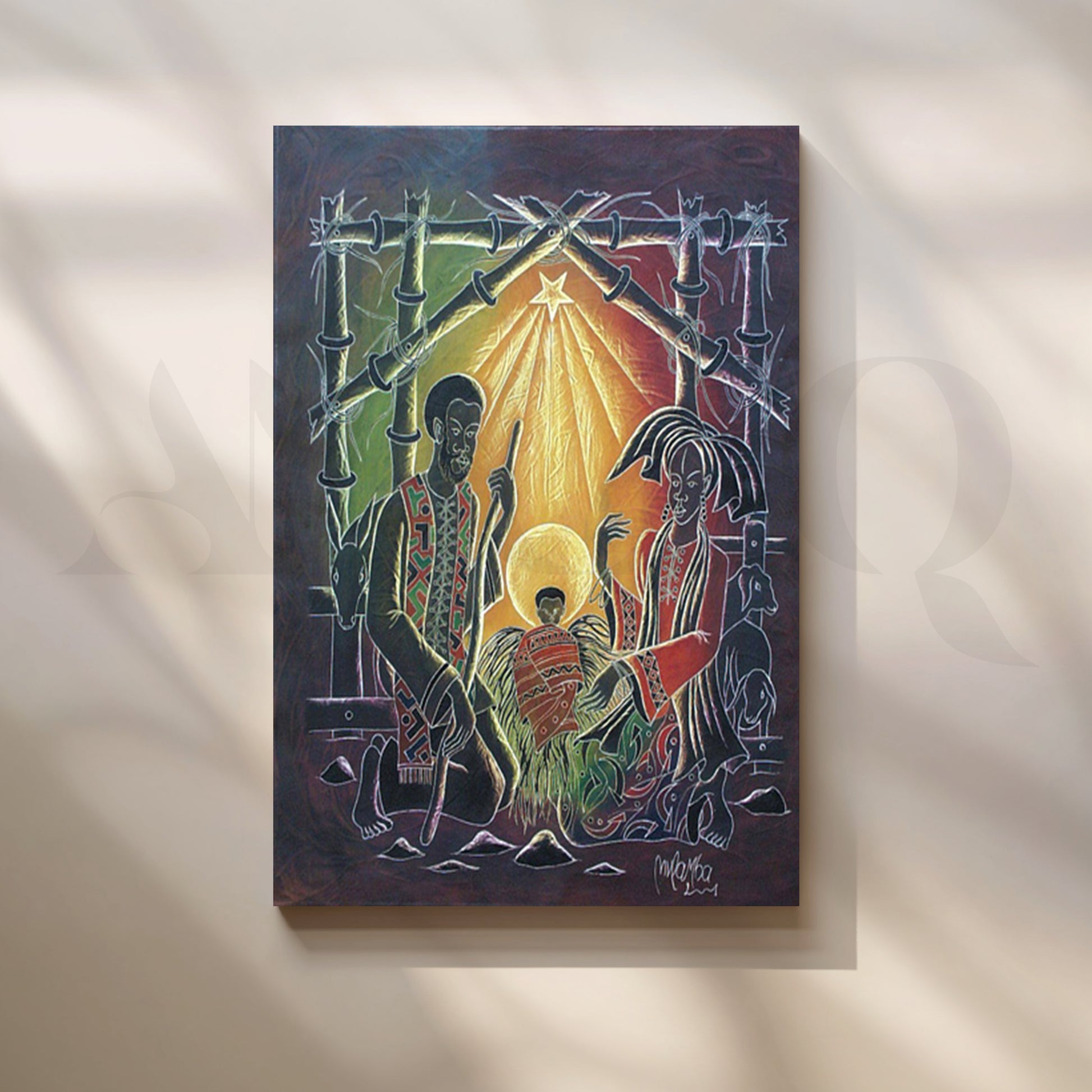 This canvas artwork showcases a radiant nativity scene reimagined in African folk style. Illuminated halos, expressive figures, and symbolic detailing create a spiritually uplifting composition. Perfect for festive décor or faith-themed spaces, it brings culture, hope, and serenity into the home with rich textures and meaningful storytelling.