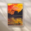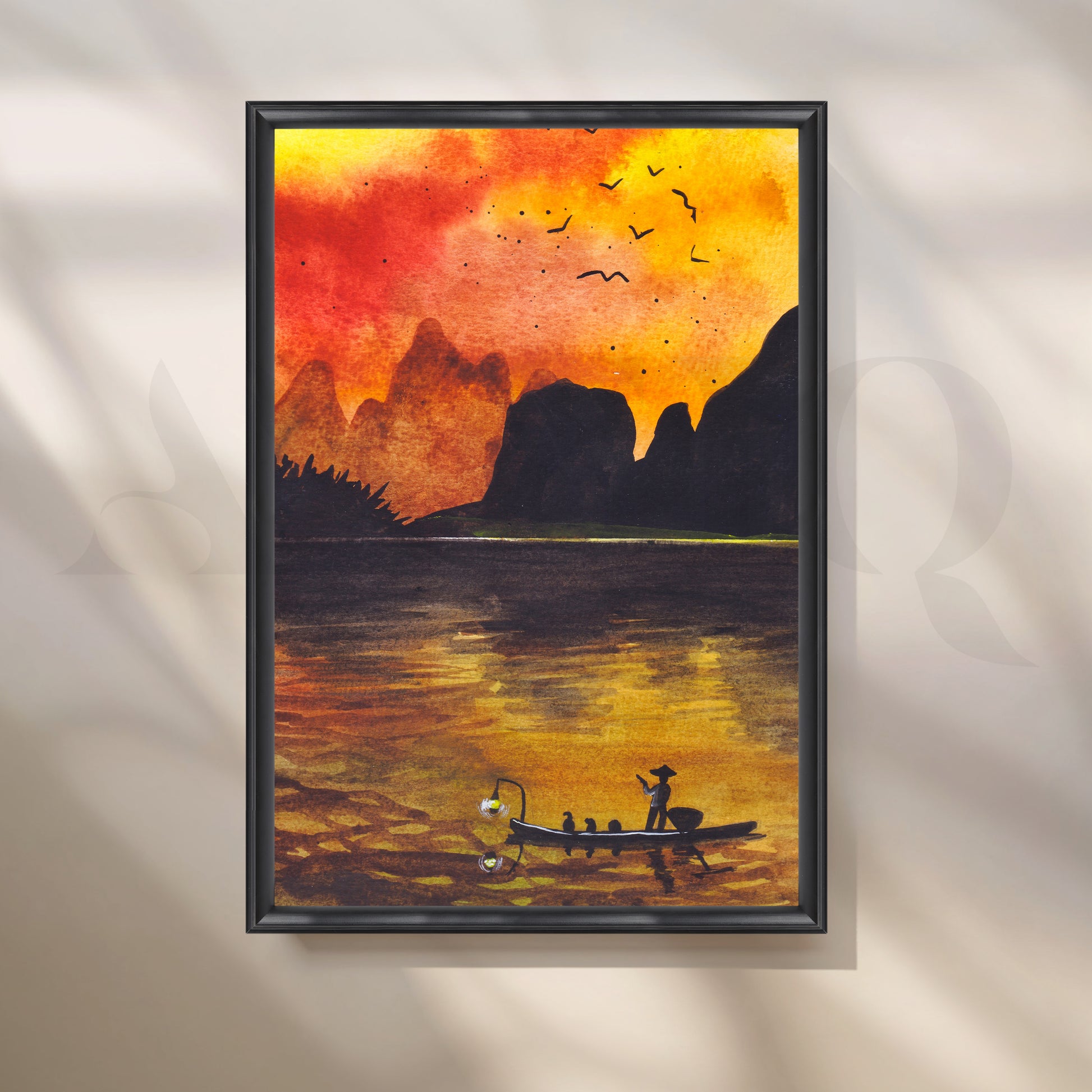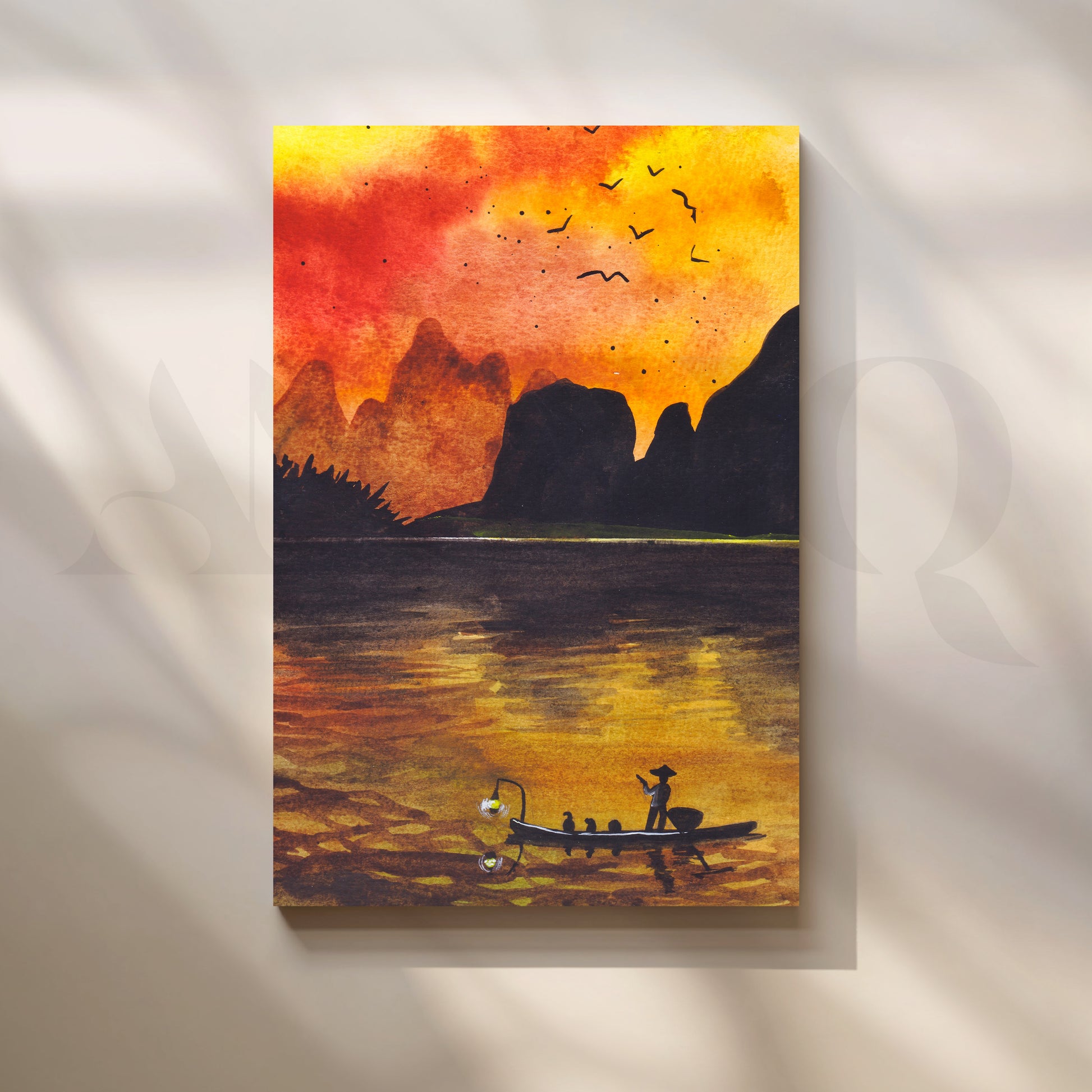 Anciq ‘Amber Horizon’ Canvas Artwork for Bedroom features a lone fisherman under a vivid orange and yellow sky, with dramatic silhouettes of hills and birds in flight. The warm tones radiate tranquility and solitude—perfect for bedrooms, creative corners, or compact urban homes.
