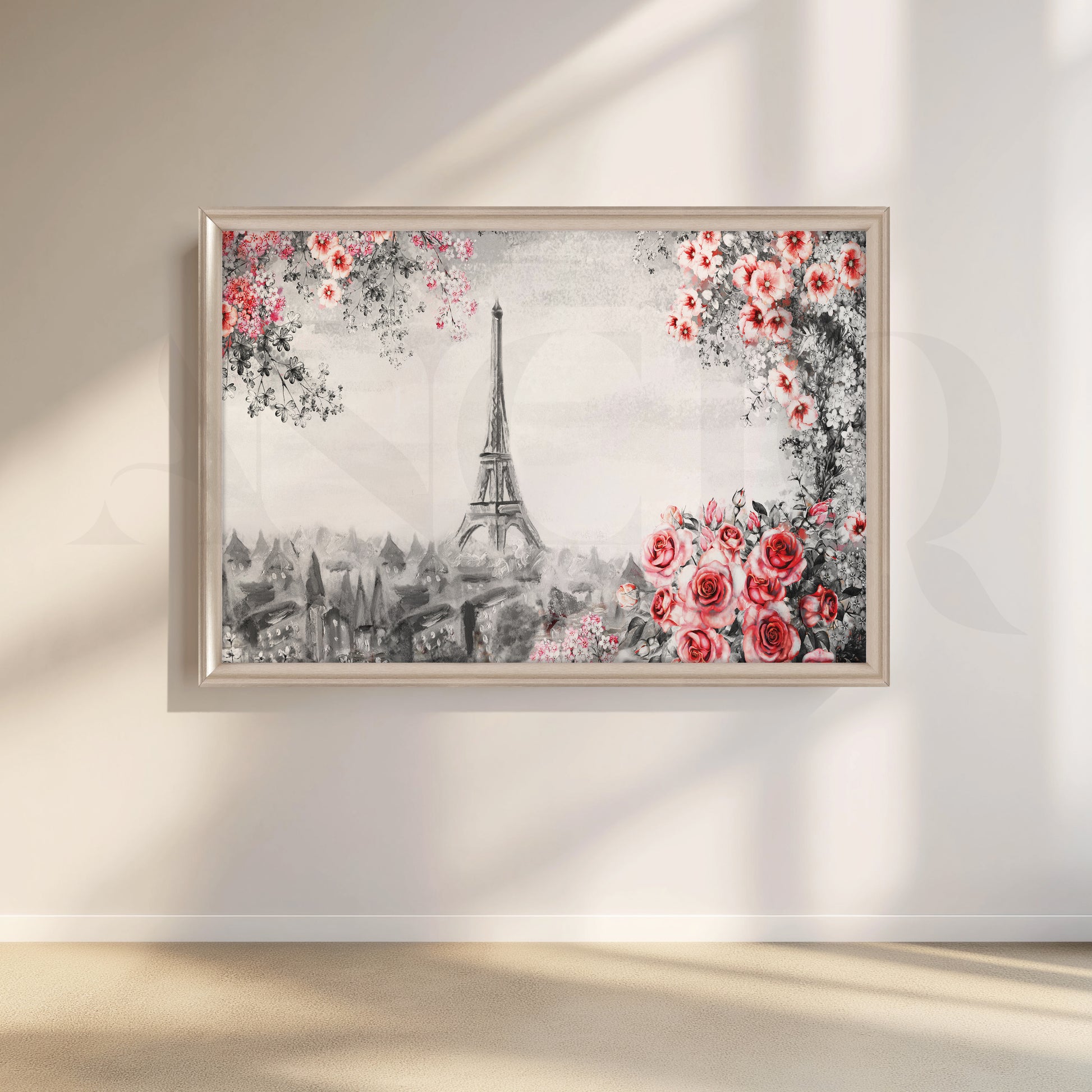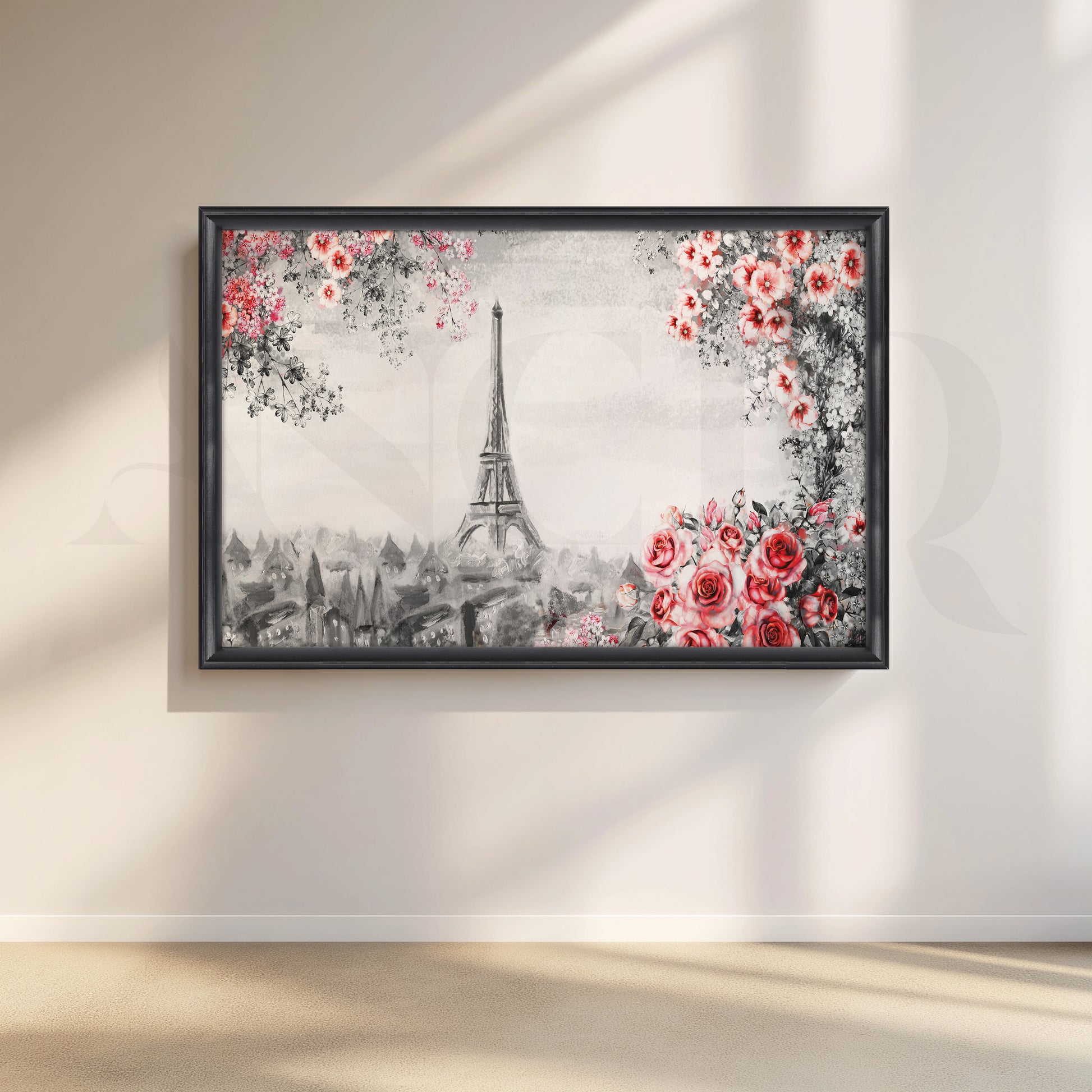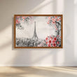 This black and white canvas painting reflects the Eiffel Tower in Paris, France. A red rose sits on the front porch, and leafy green vines climb the porch. The Eiffel Tower is the centerpiece of the composition, and the black and white color scheme gives the art a timeless feel of elegance. This canvas print would be a perfect addition to any home décor, especially in the living room or bedroom.