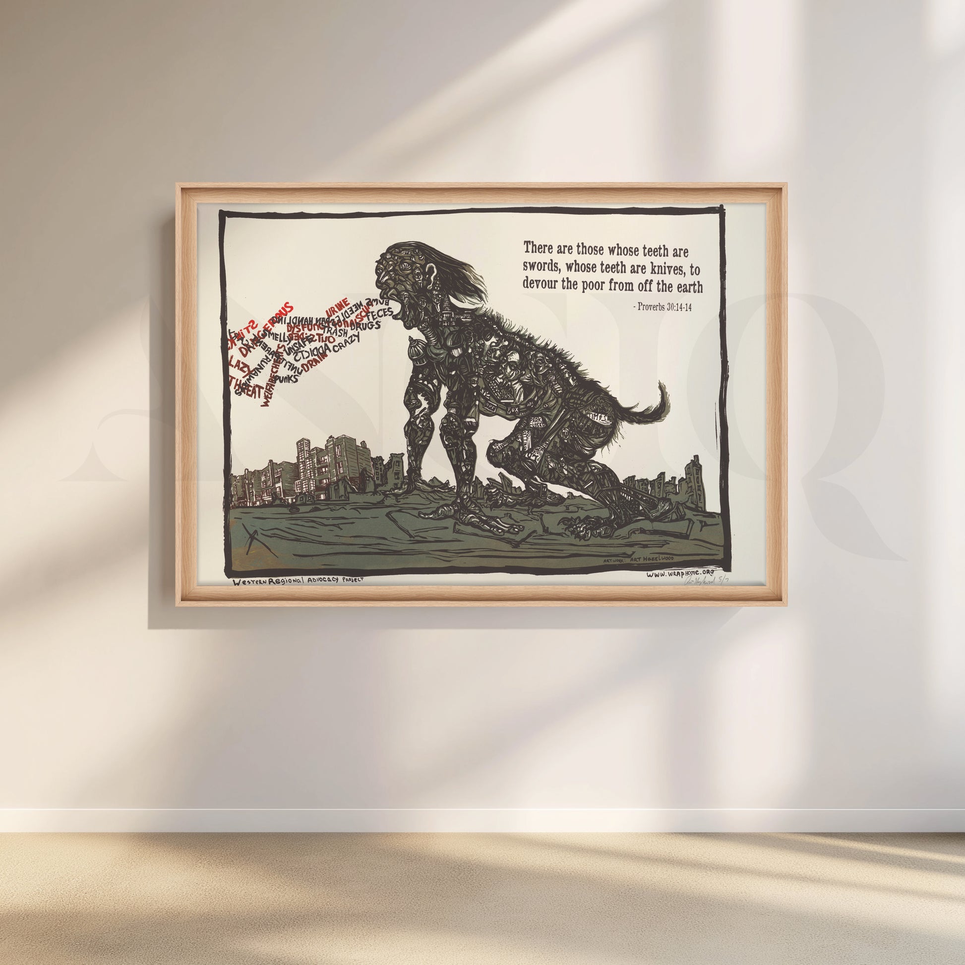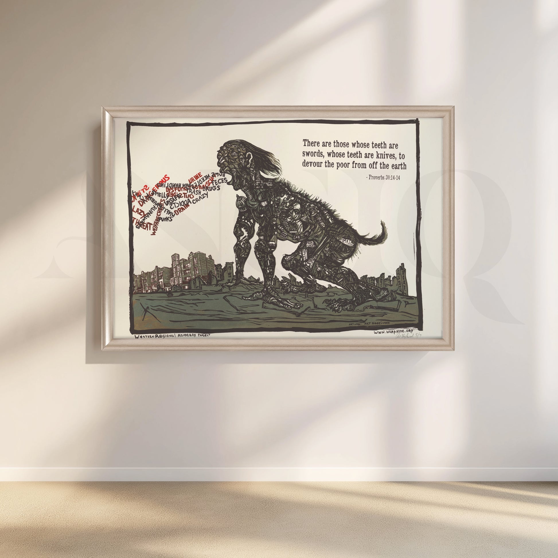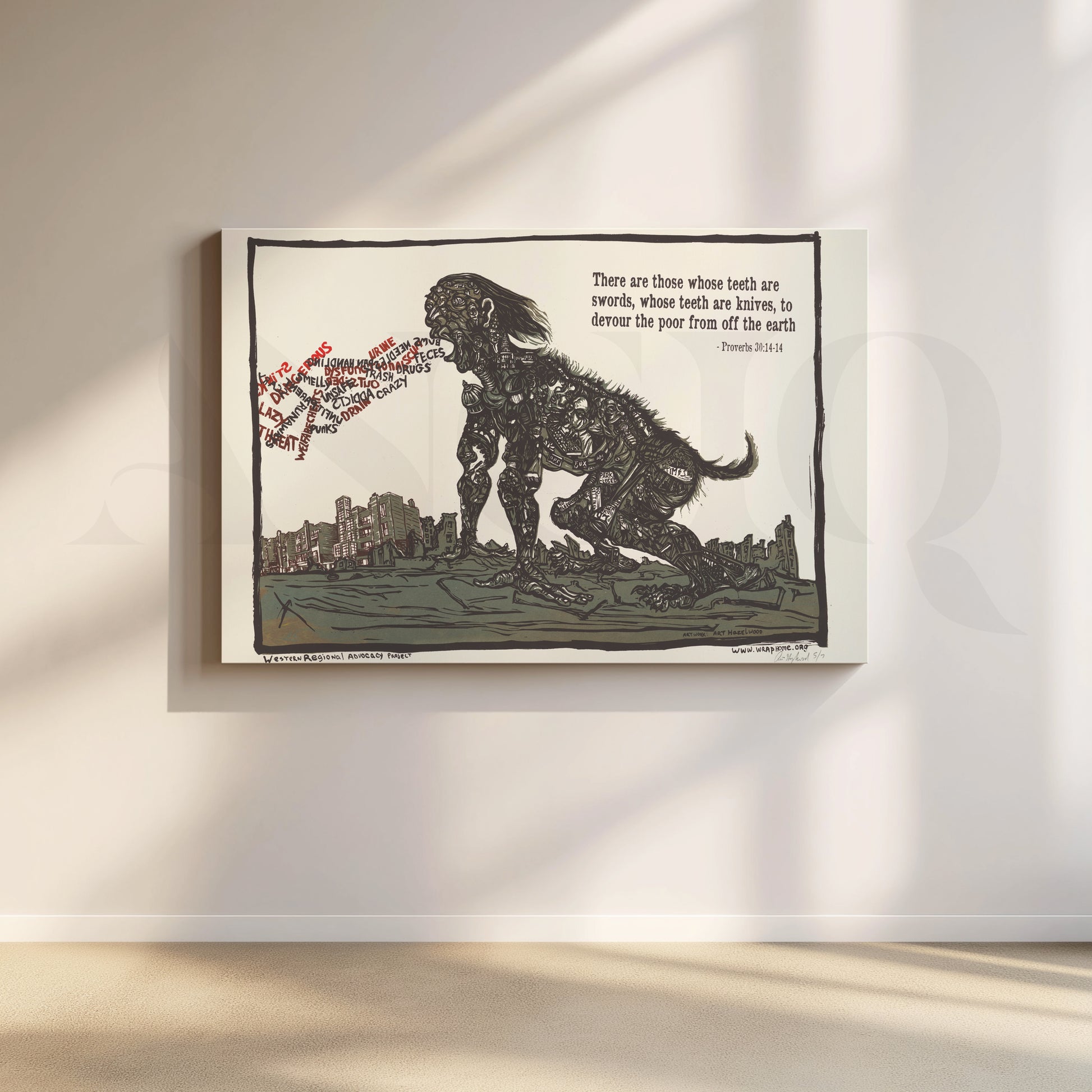 Anciq ‘Devour the Poor’ Canvas Artwork illustrates a dark, beast-like figure with biblical references and modern social critique. Suitable for bold interiors, gallery setups, or thematic art collections, this piece challenges viewers to reflect on power, poverty, and corruption.