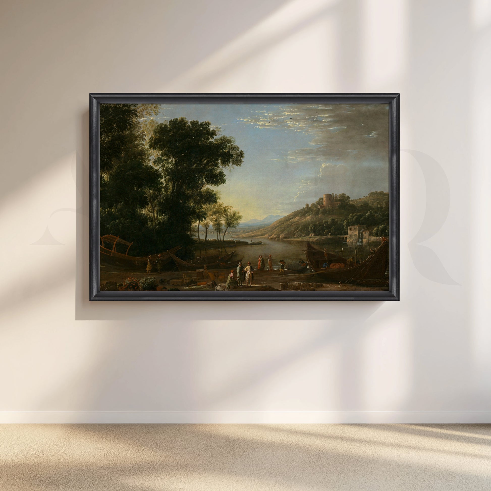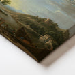 Romantic seascape of tall ships at sunset, soft gold skies, and classical architecture—an elegant vintage wall art piece that warms gatherings and conversation. Ideal as dining room canvas art, coastal wall décor, or office reception artwork, this museum-inspired classic landscape canvas delivers mood, history, and refined texture while pairing beautifully with neutral palettes and dark woods.