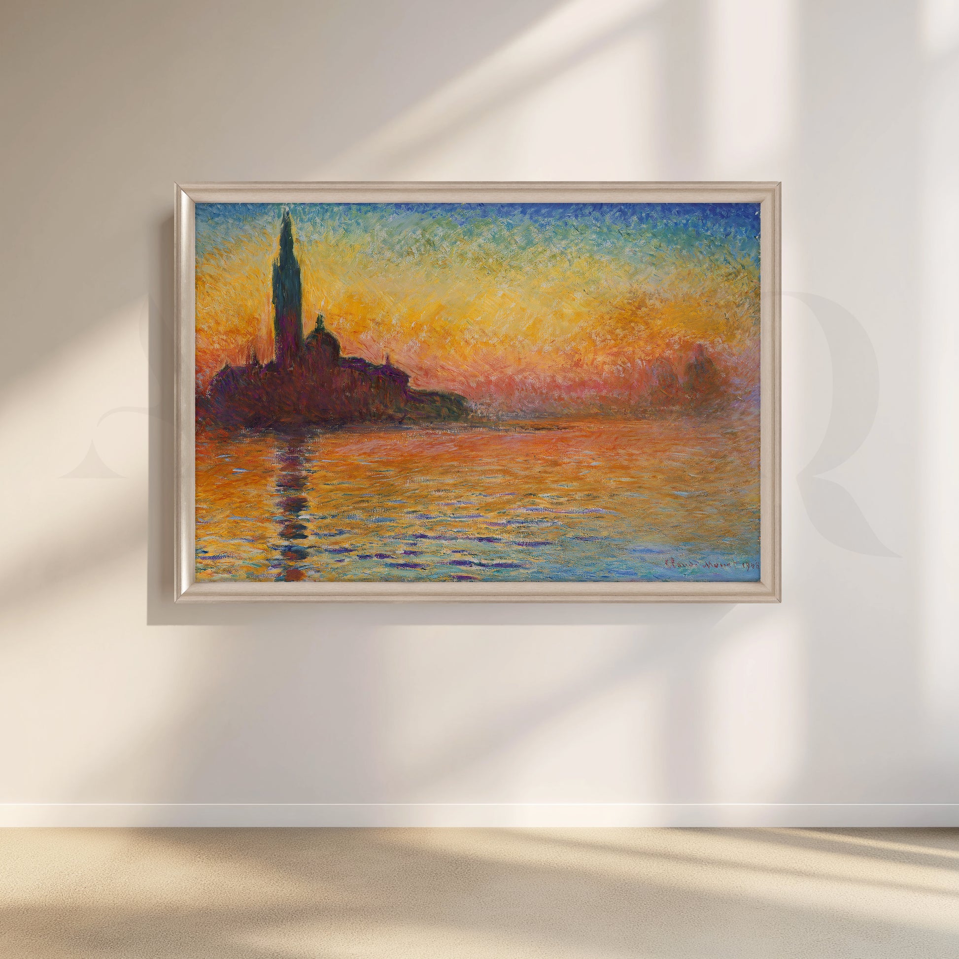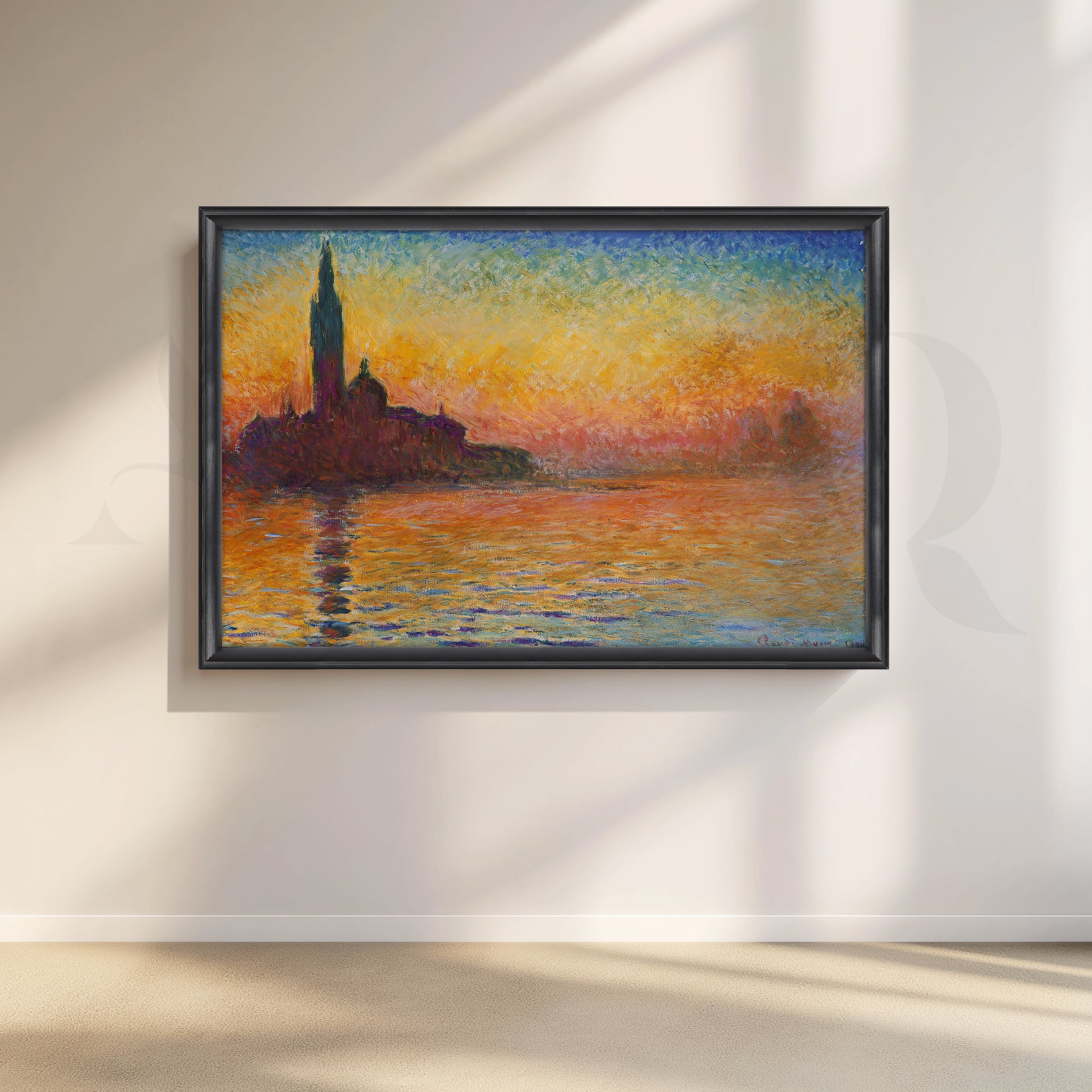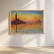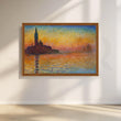 Saturated oranges, ambers, and cobalt blues melt across a tranquil lagoon as Venice silhouettes at dusk—romantic Impressionist color that turns your dining room into golden hour. This seascape canvas painting doubles as modern wall art and coastal décor, casting a warm, flattering glow for gatherings. Printed on gallery-wrapped canvas, it’s ideal as large living room art or entryway statement décor, pairing beautifully with wood tones, brass accents, and soft linens for a sophisticated, travel-inspired finish.