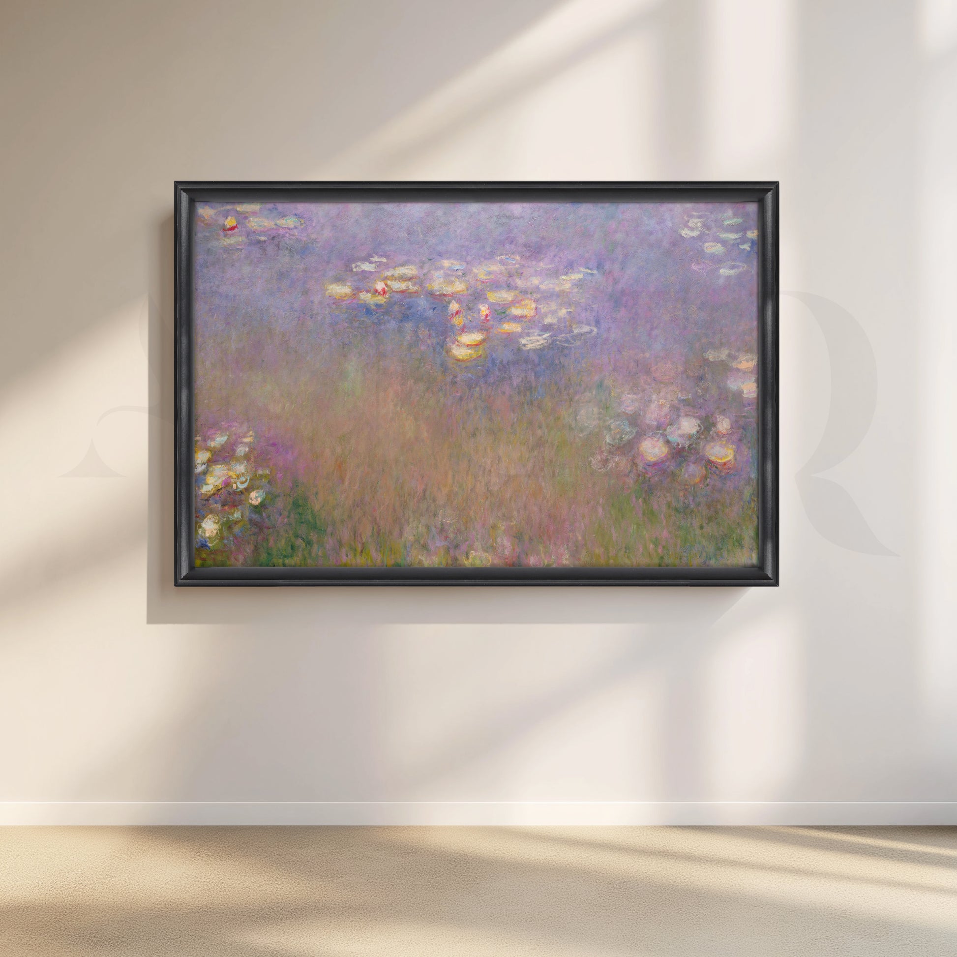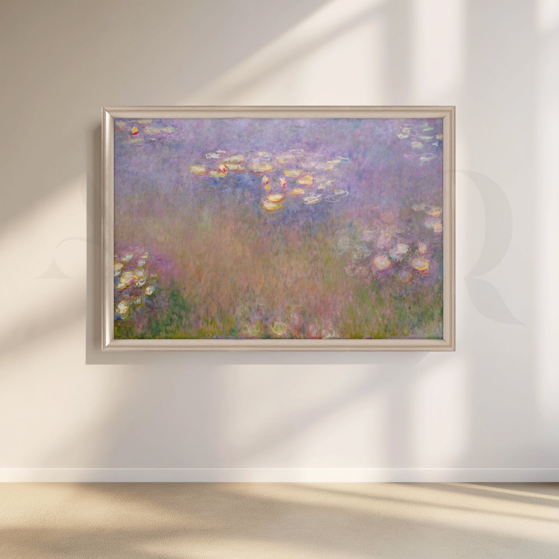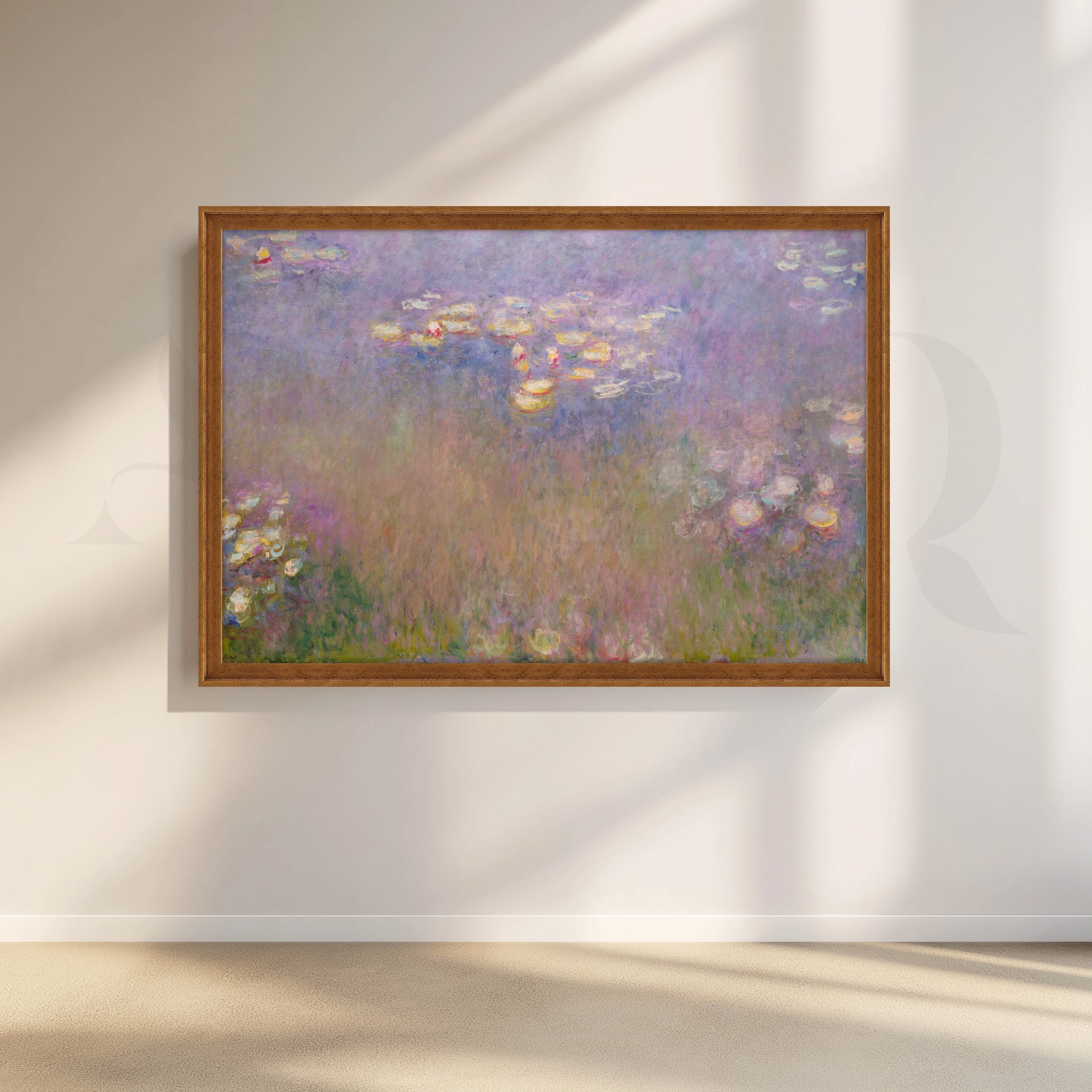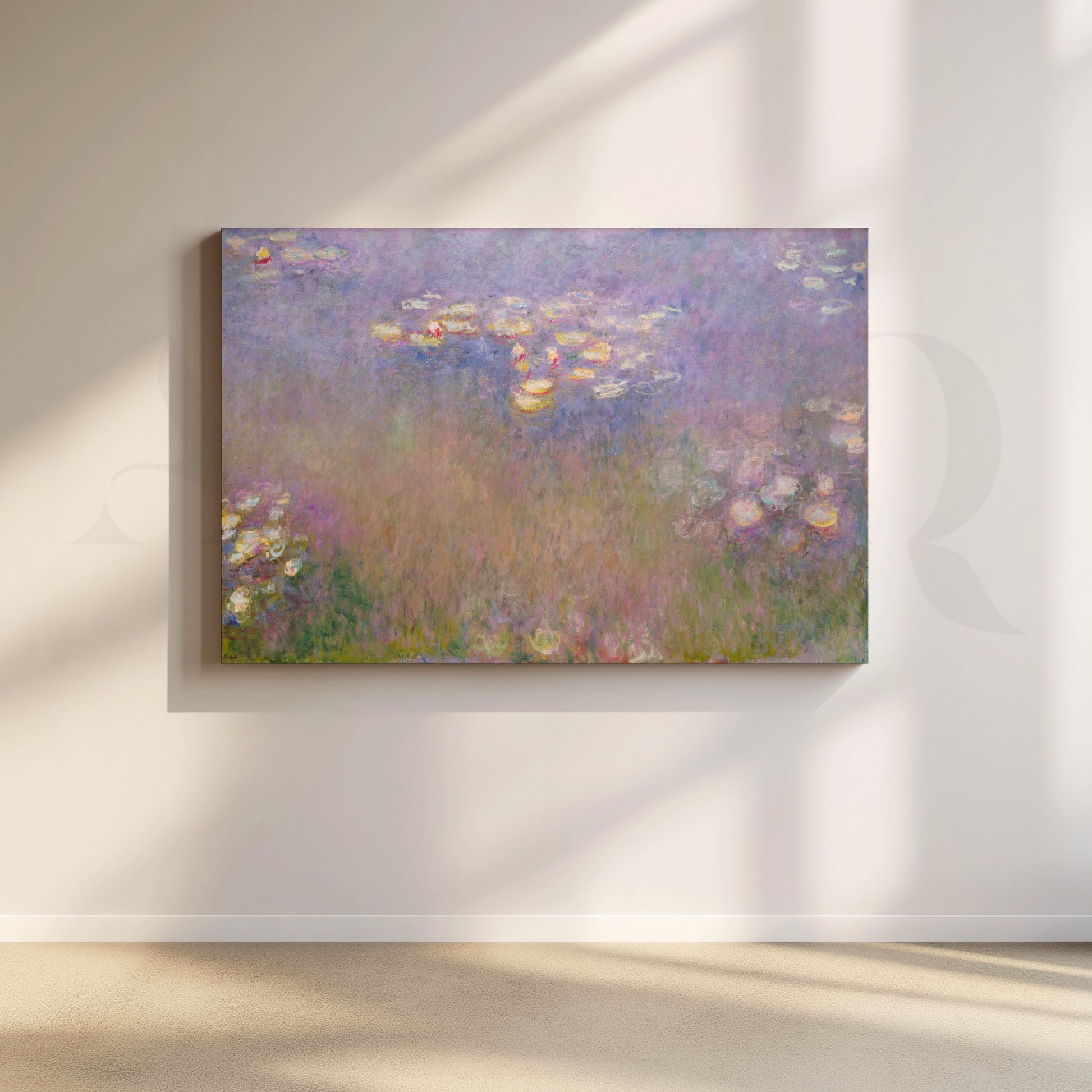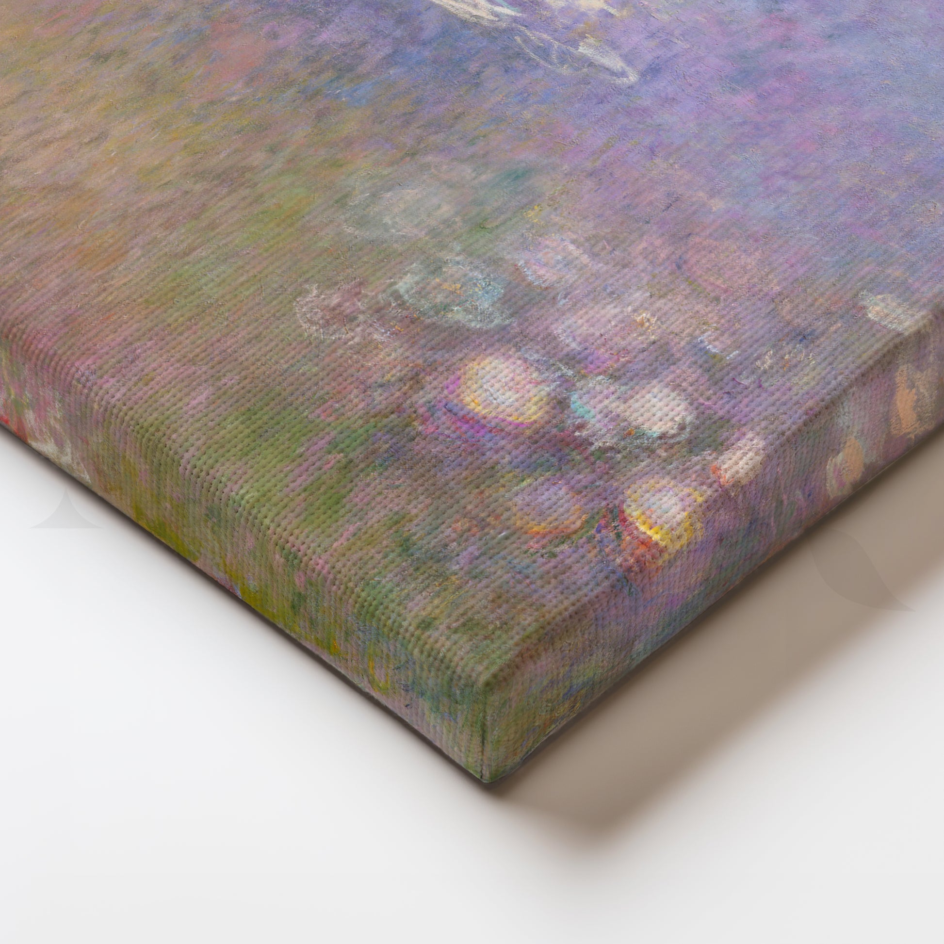 A dreamy field of lilac, blush, and pearly highlights drifts across Monet’s iconic pond, perfect for restful bedroom wall art. The soft pastels and diffused light make this abstract impressionist canvas ideal for boho bedroom décor, calming nursery accents, or a serene modern wall art moment over a sofa. Museum-style texture and subtle color shifts deliver upscale large canvas art for tranquil interiors.