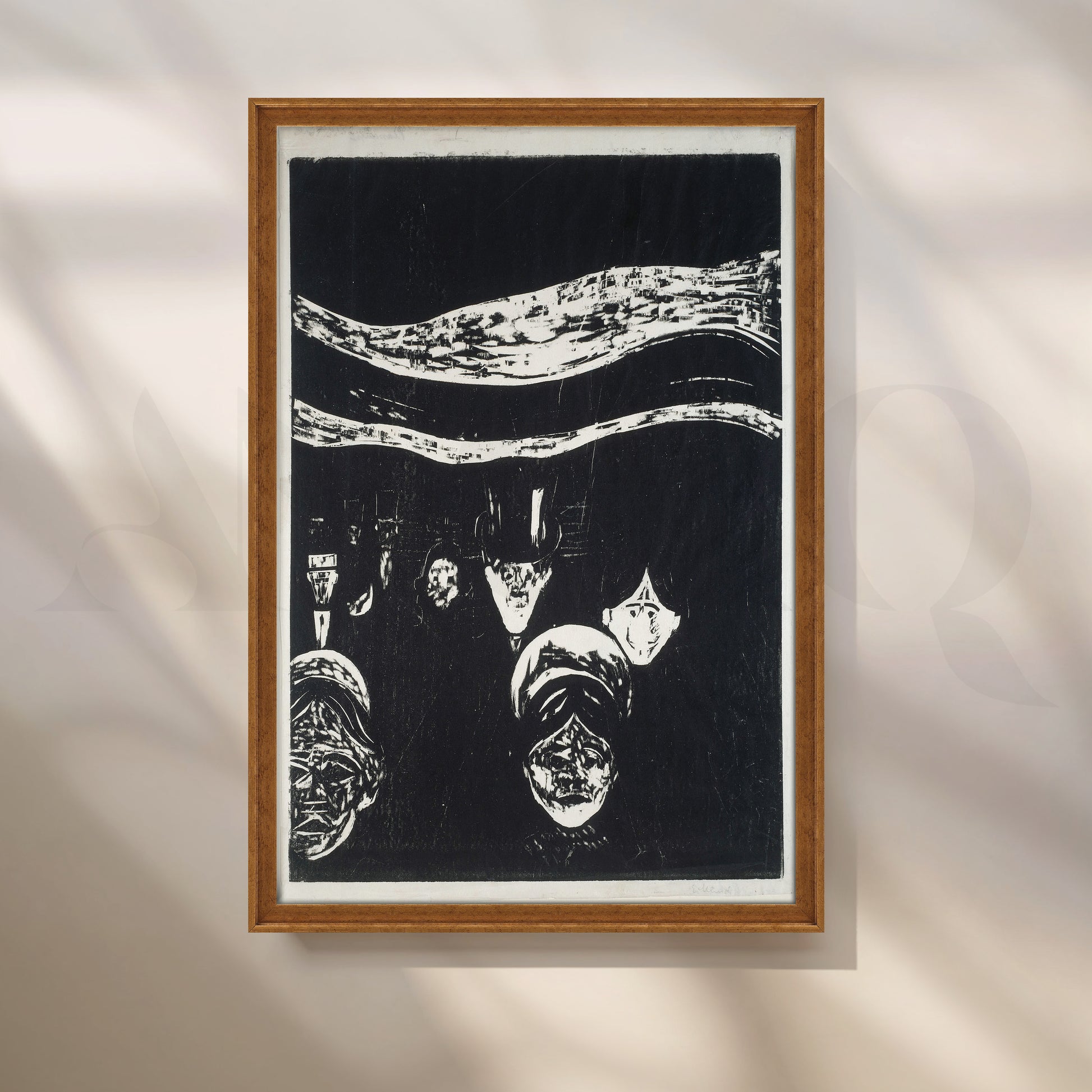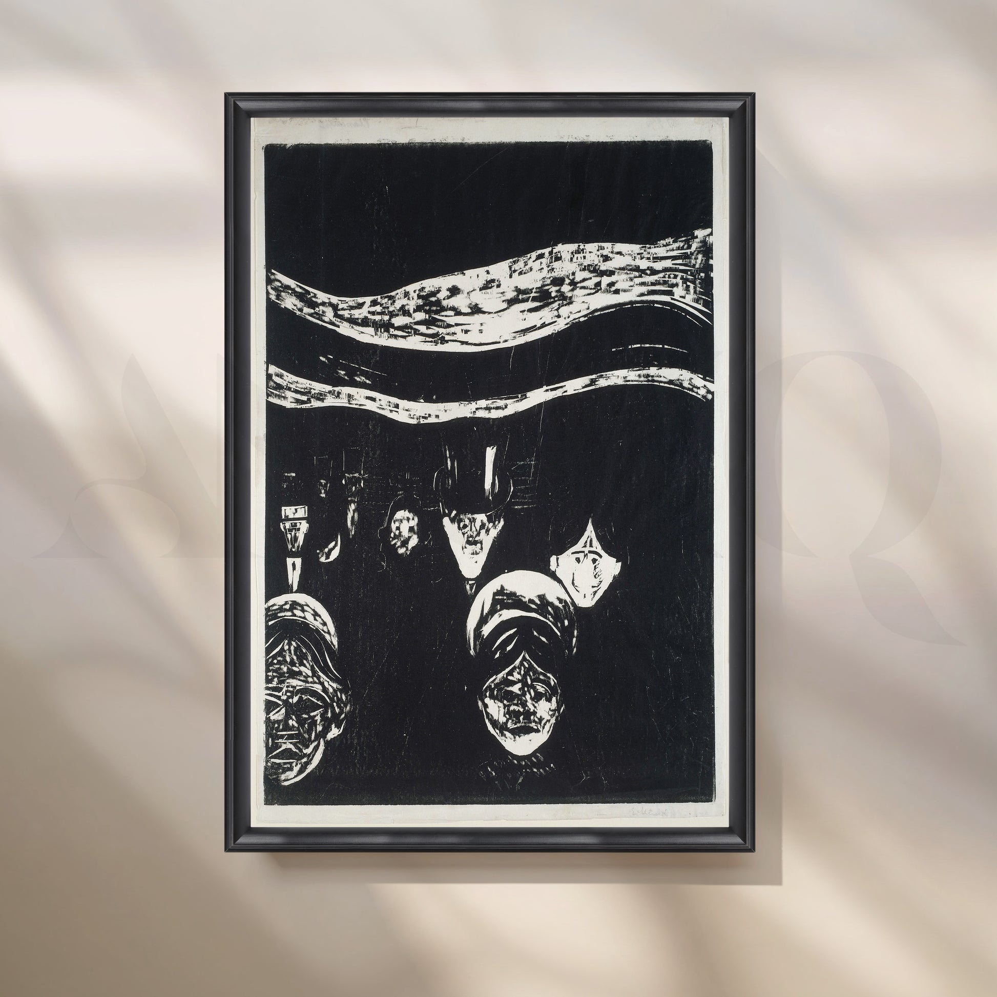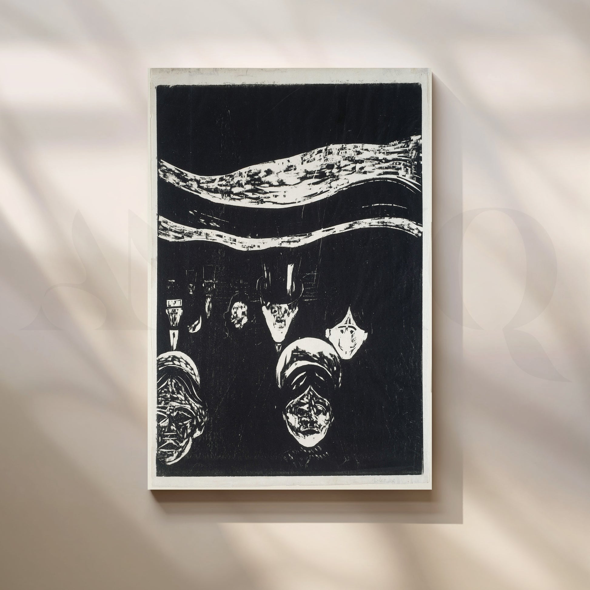 A striking black-and-white expressionist woodcut scene with flowing river lines and masked figures, this modern wall art adds dramatic contrast and gallery style to any space. Perfect as large living room art or above-sofa décor, the monochrome palette suits minimalist interiors, moody office décor, and Scandi gallery walls seeking bold conversation pieces.