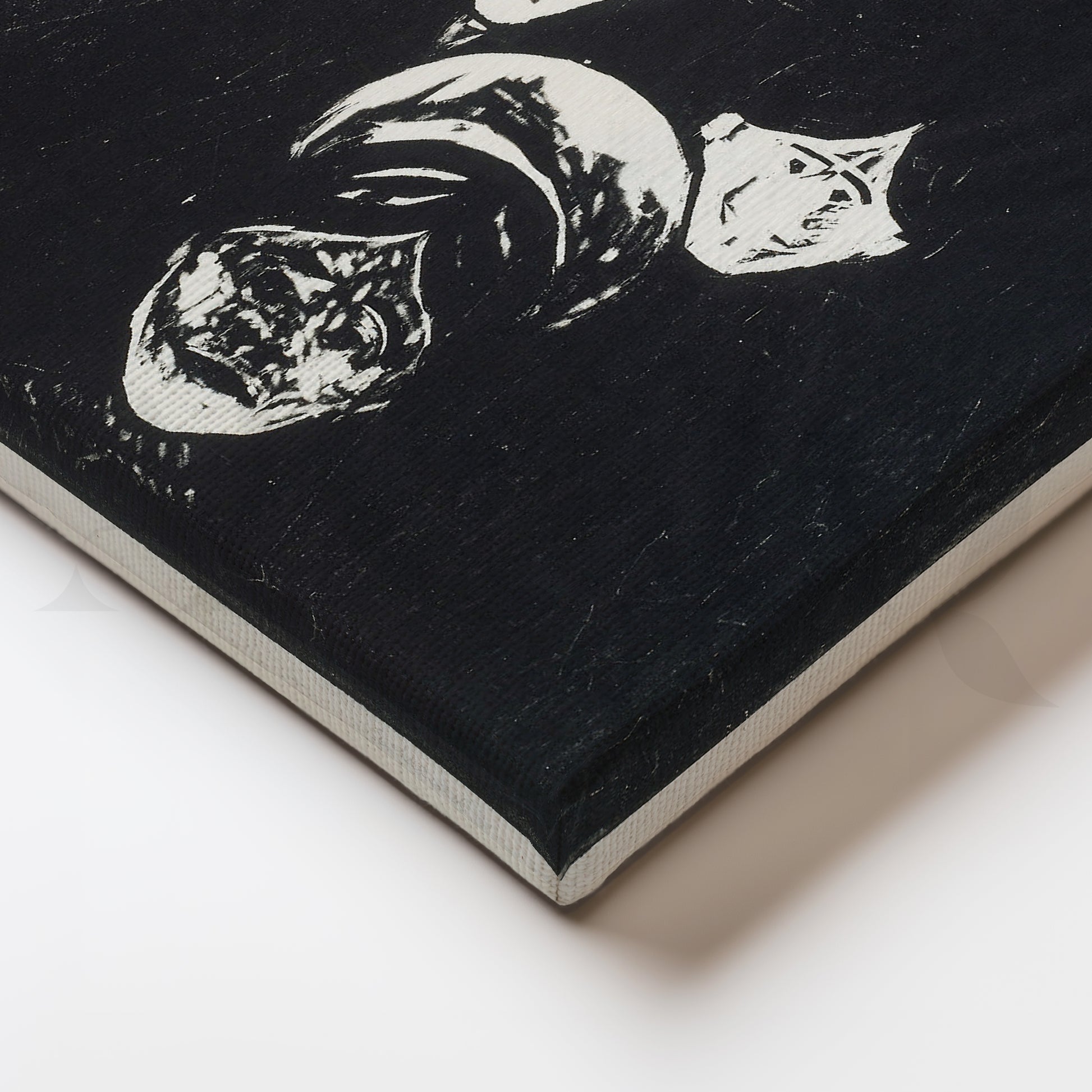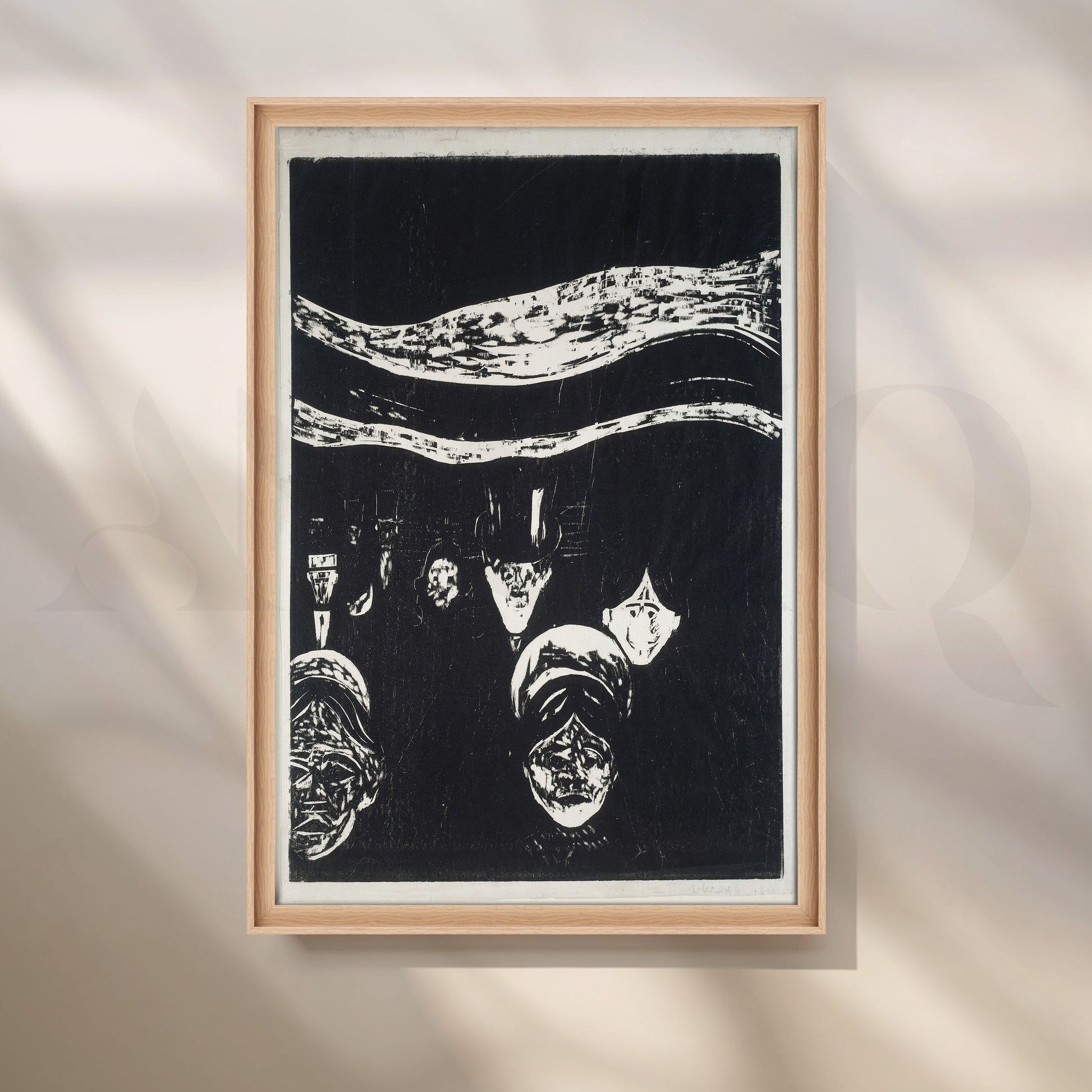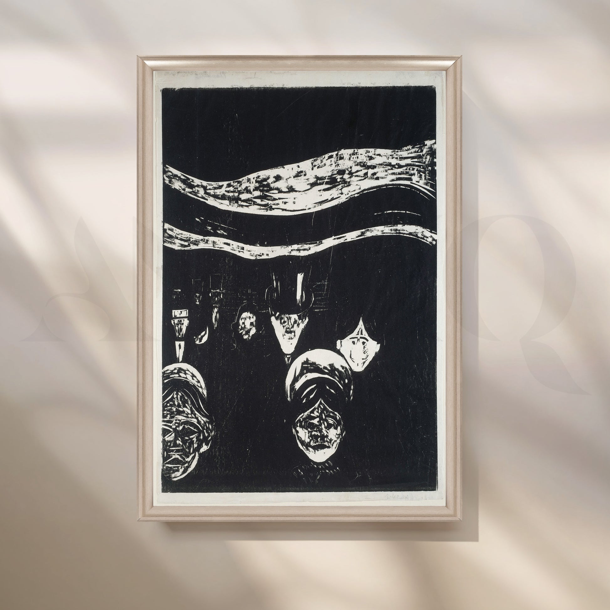 A striking black-and-white expressionist woodcut scene with flowing river lines and masked figures, this modern wall art adds dramatic contrast and gallery style to any space. Perfect as large living room art or above-sofa décor, the monochrome palette suits minimalist interiors, moody office décor, and Scandi gallery walls seeking bold conversation pieces.