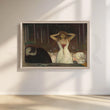 Earthy greens, umber, and soft cream surround a dreamlike figure in a woodland clearing, creating a calm, romantic mood. This expressionist canvas painting brings boho bedroom décor vibes and serene, modern wall art energy to reading nooks and primary suites, pairing beautifully with natural wood, linen textures, and warm ambient lighting.