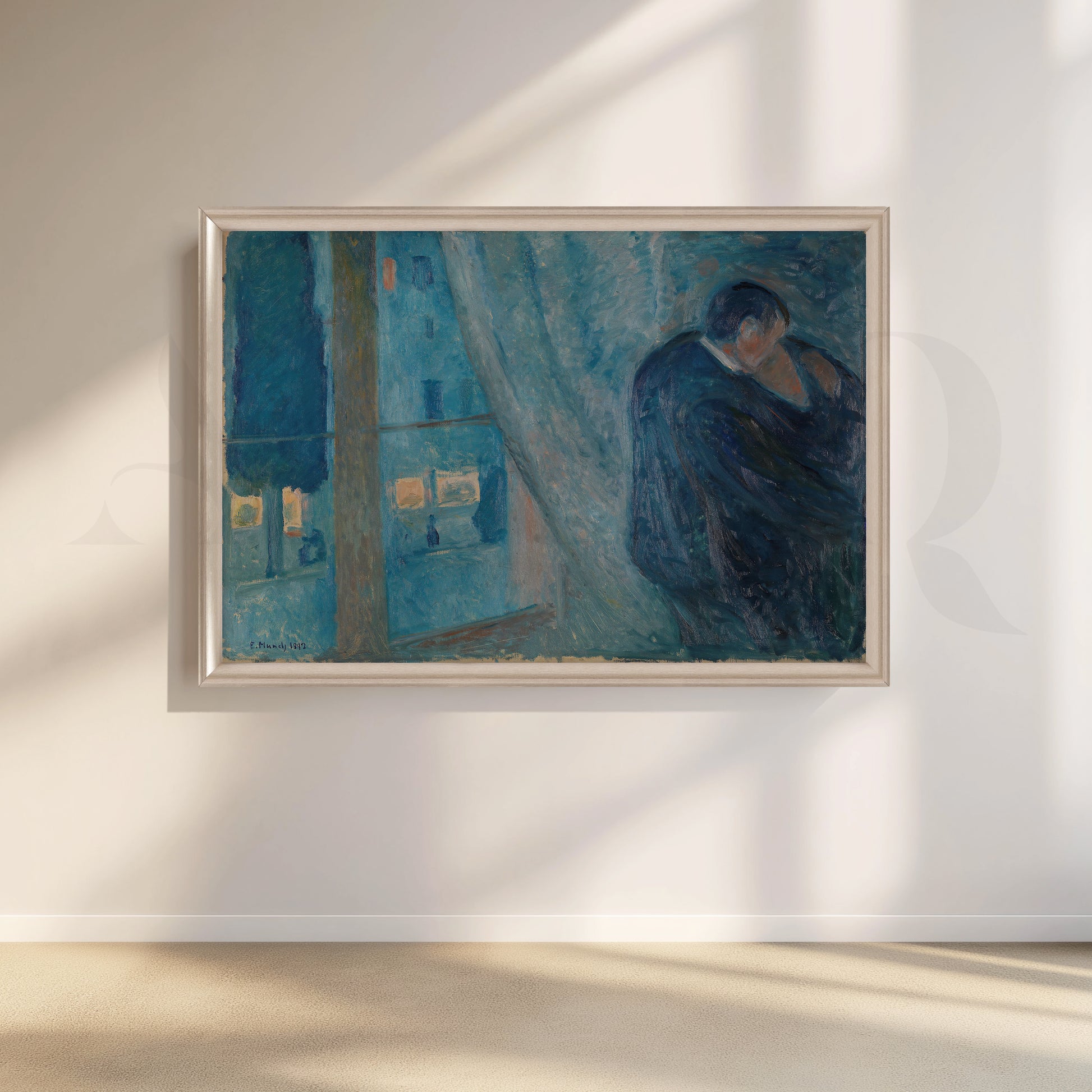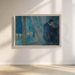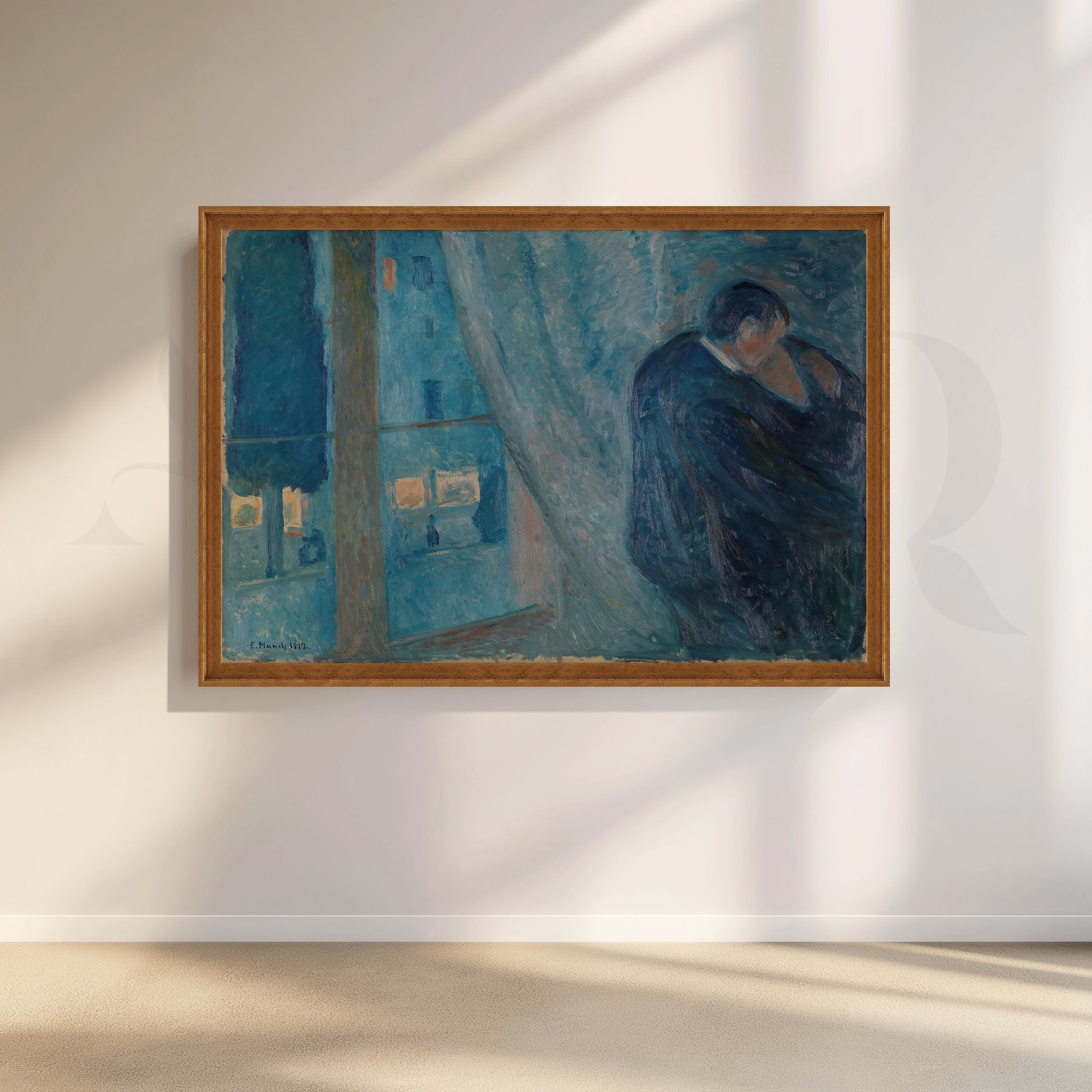 Soft midnight blues and sea-glass teals bathe two lovers in Munch’s atmospheric The Kiss by the Window. This expressive, romantic canvas brings quiet intimacy to bedrooms, reading nooks, and minimalist apartments. A museum-quality expressionist canvas painting, it layers modern wall art appeal with timeless Scandinavian mood—ideal as large bedroom art, cozy office décor, or a soothing centerpiece for contemporary interiors.