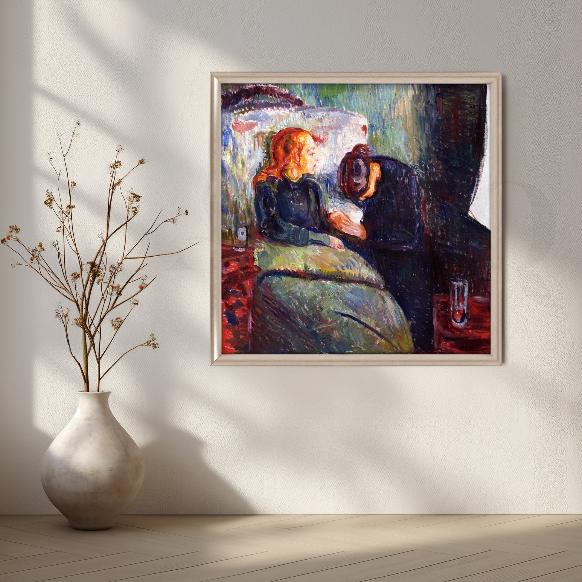 Rendered in rich reds, charcoal blacks, and mossy greens, this expressive Munch scene captures tenderness and reflection at a bedside. The painterly texture and moody palette add depth to studies, libraries, and contemplative corners. A museum-style expressionist canvas painting, it complements modern wall art collections, eclectic interiors, and refined gallery walls seeking meaningful, emotive large living room art.