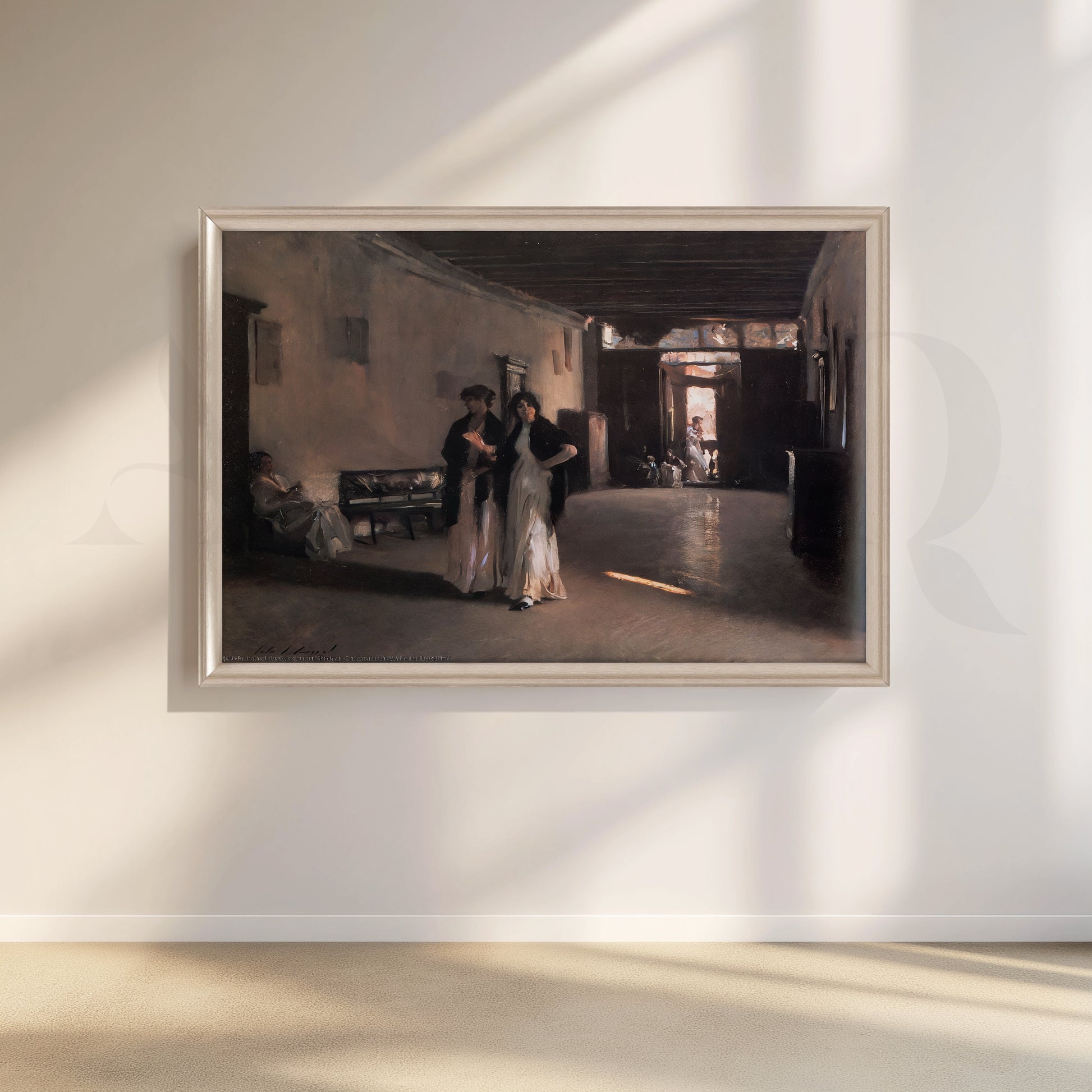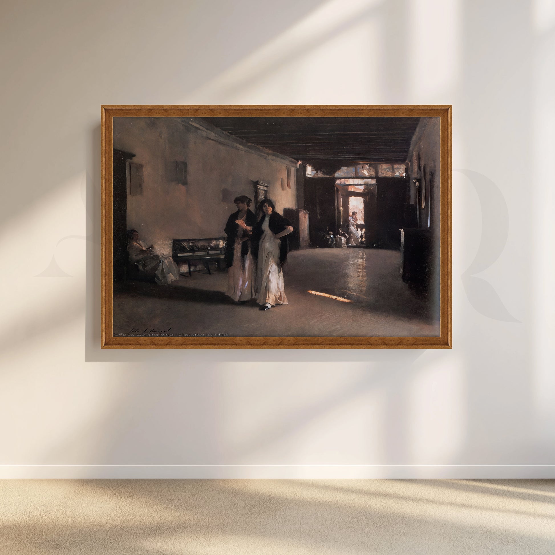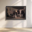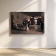 Earthy plaster walls, long corridor light, and elegant figures in black shawls give this canvas a cinematic, old-world ambiance. Its warm neutrals and dramatic depth make it perfect for entryways, corridors, or a moody study. Add character with classic wall art that complements Mediterranean, rustic, or eclectic interiors—ideal as vintage canvas décor, hallway artwork, or office wall art.