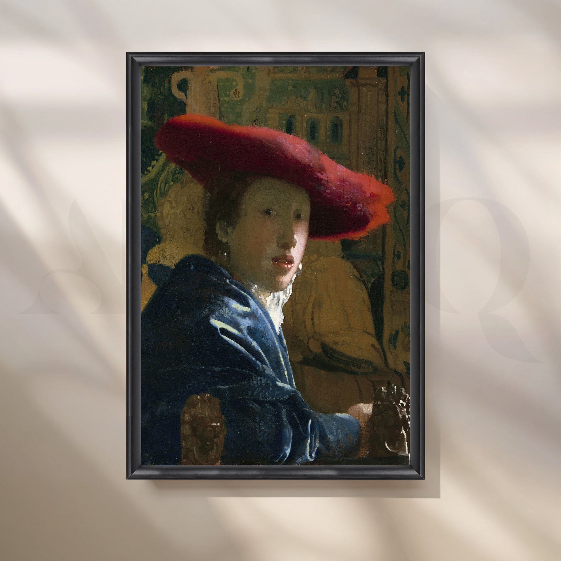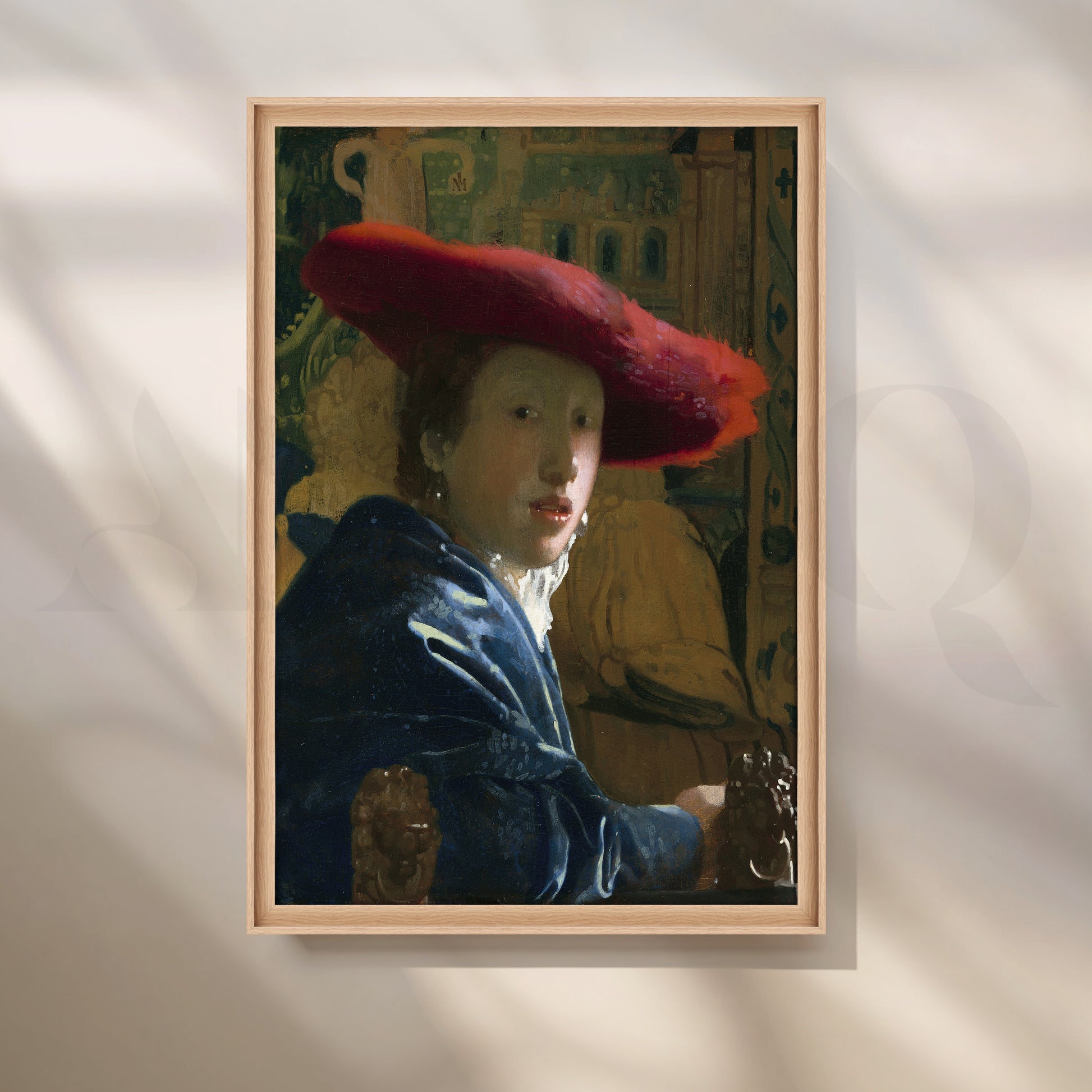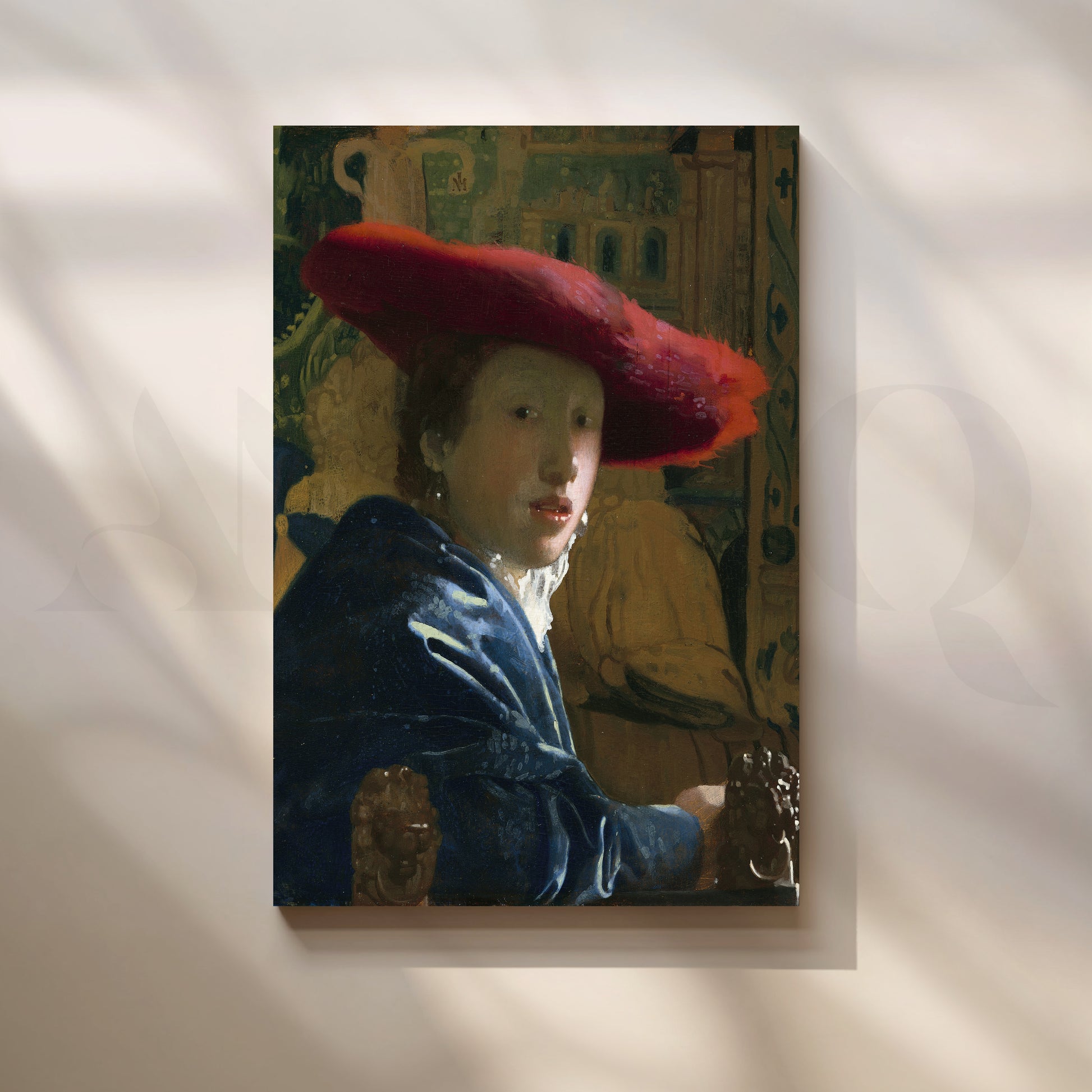 Vermeer’s luminous Girl with a Red Hat arrives as a statement canvas—rich crimson, deep cobalt, and warm skin tones glowing against a moody background. Ideal as bold accent wall art in a lounge, dining room, or office, this classic canvas painting elevates eclectic, vintage, or modern interiors. Use as large wall décor, museum reproduction art, or a focal point in sophisticated living room design.