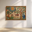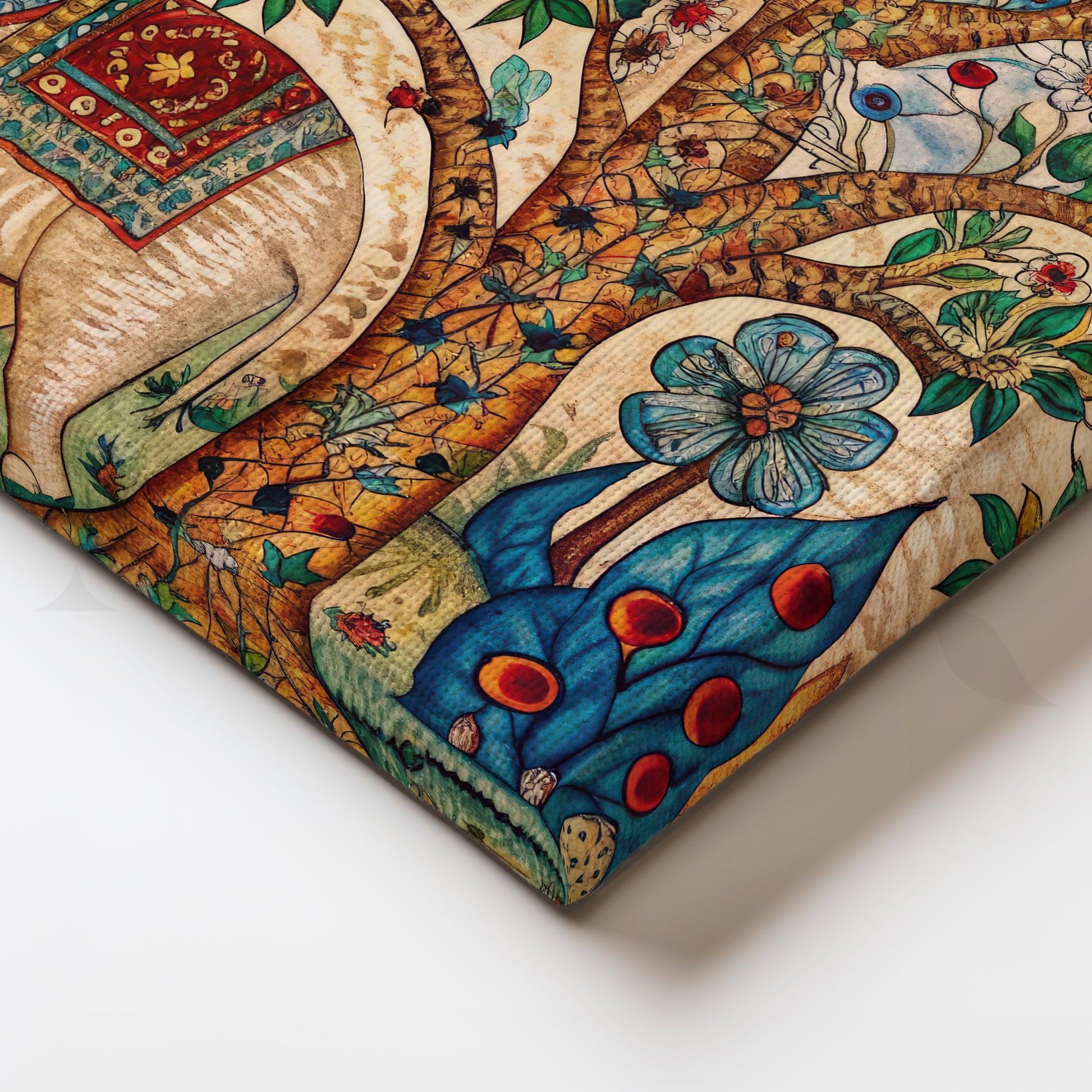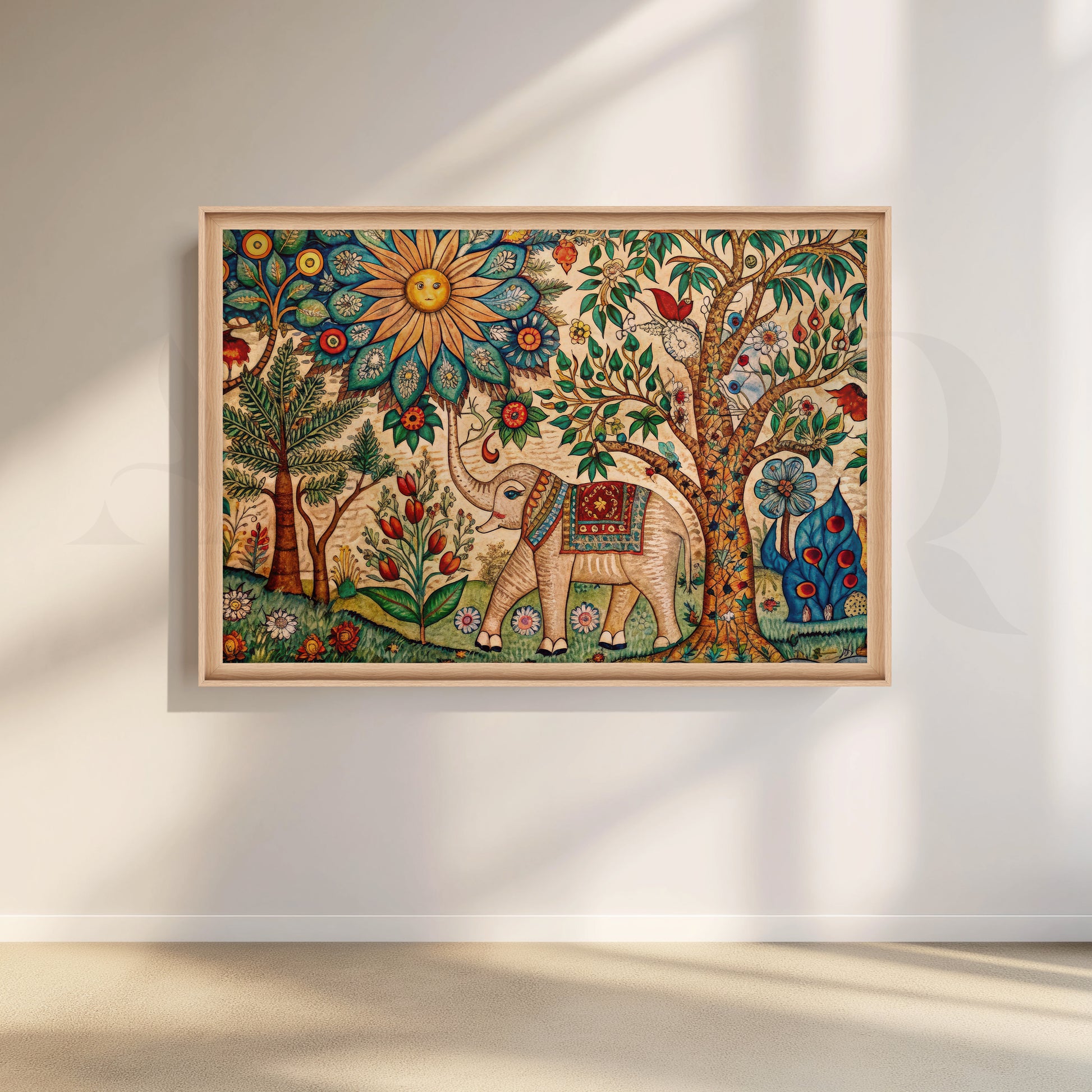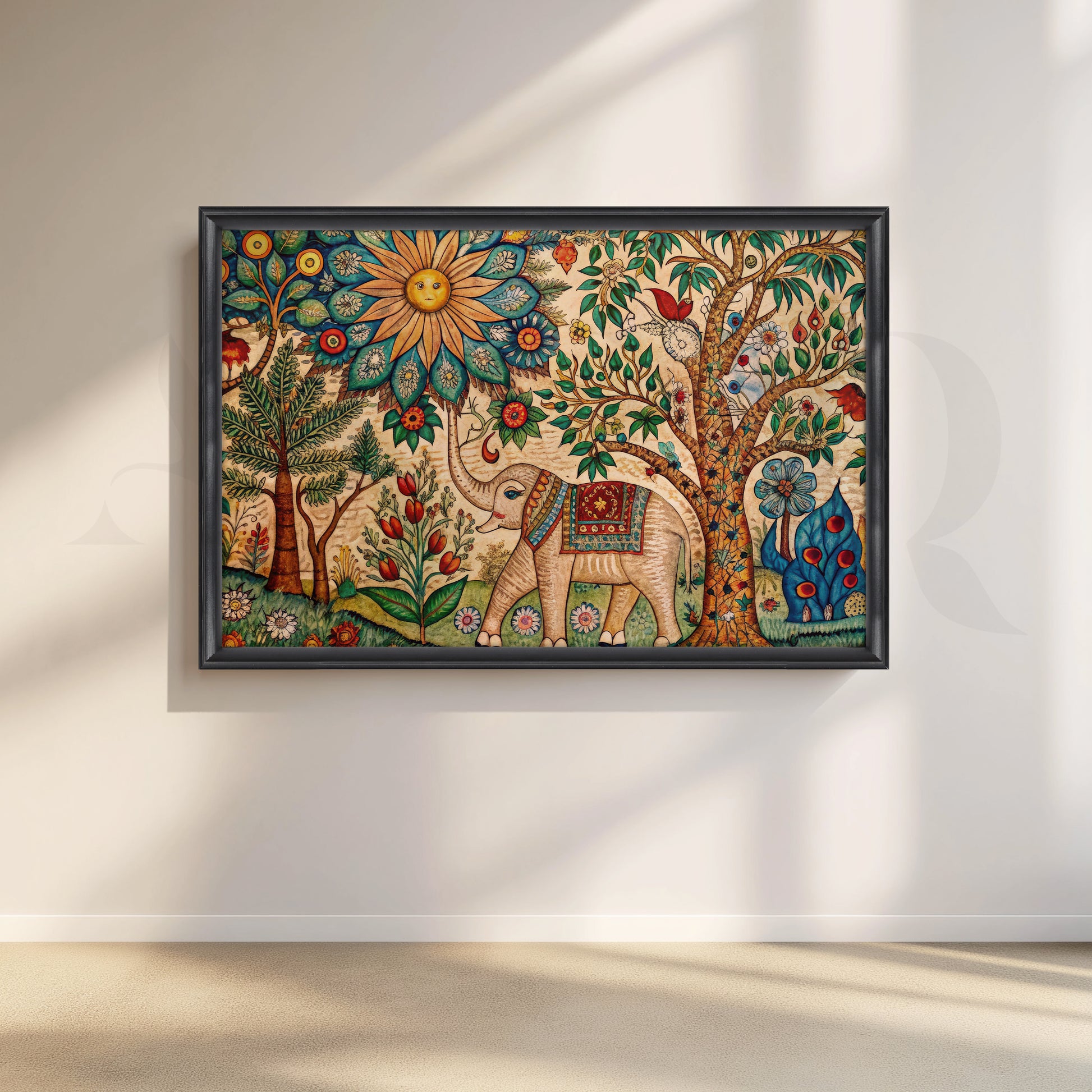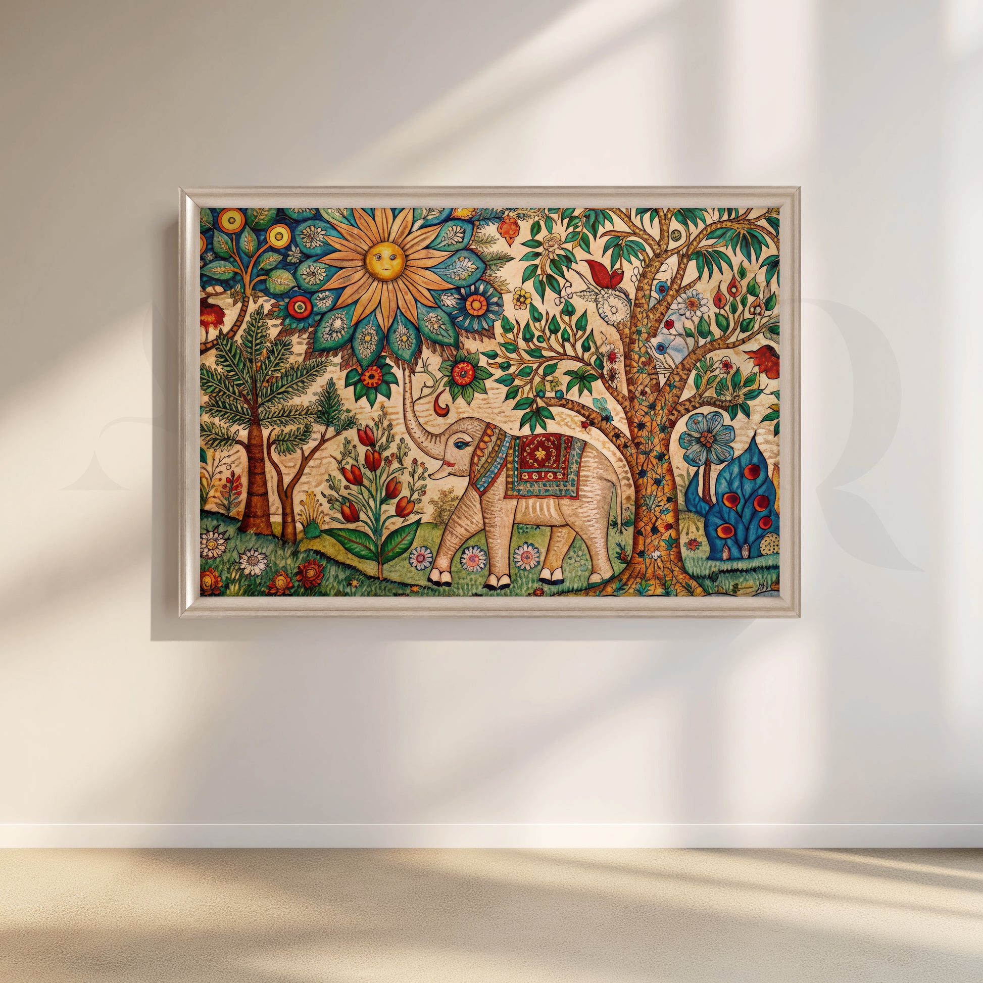Anciq’s “Enchanted Forest Elephant” canvas artwork brings a storybook woodland to your walls. A gentle elephant, adorned in folk patterns, wanders beneath a radiant flower-sun, surrounded by stylized trees, birds, and blossoms in earthy reds, greens, and blues. This richly detailed folk art elephant painting is perfect for a living room, study, creative studio, or reading nook, adding warmth and narrative charm.