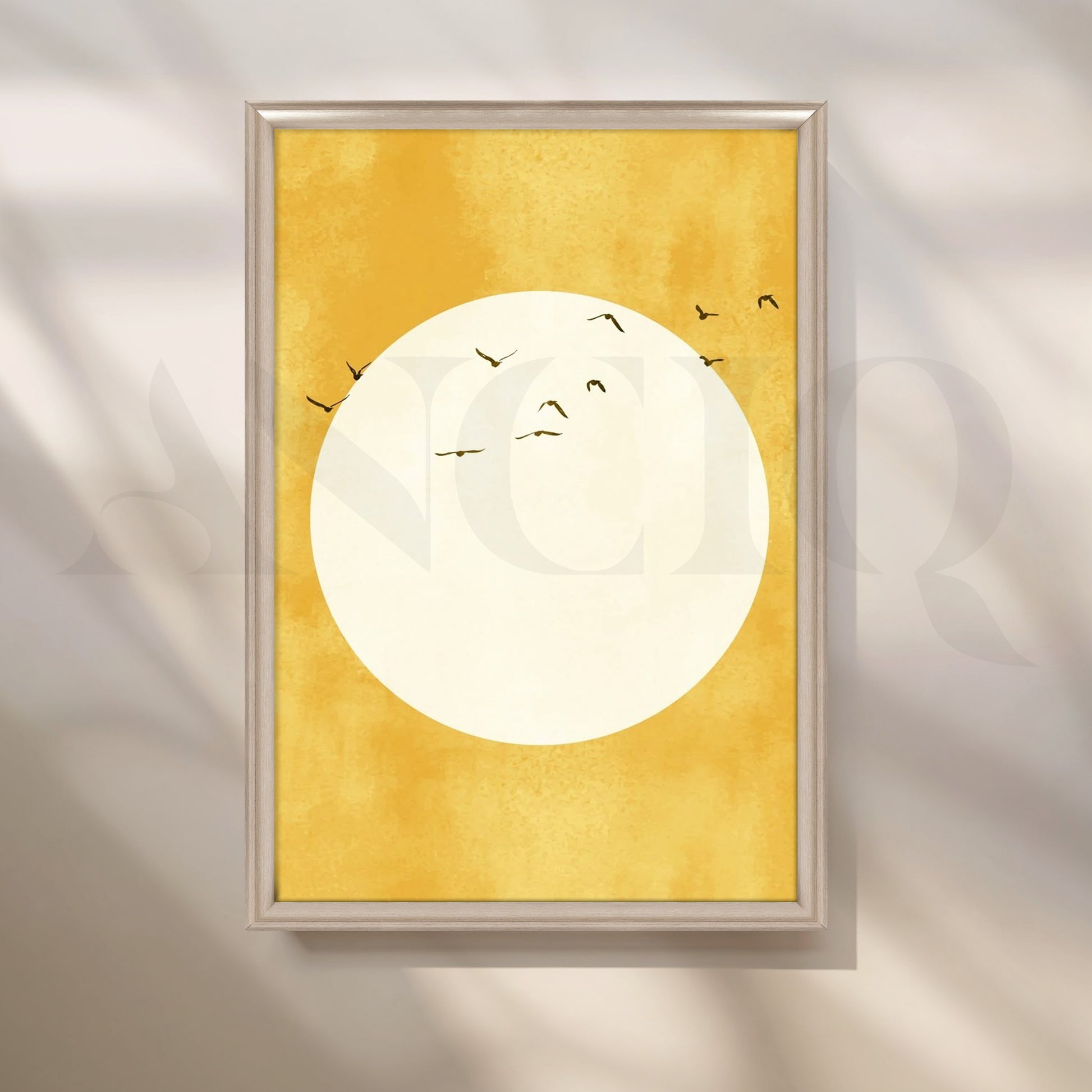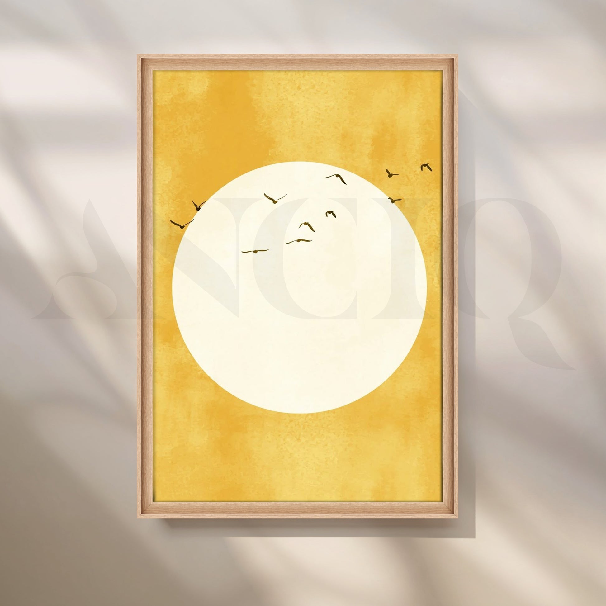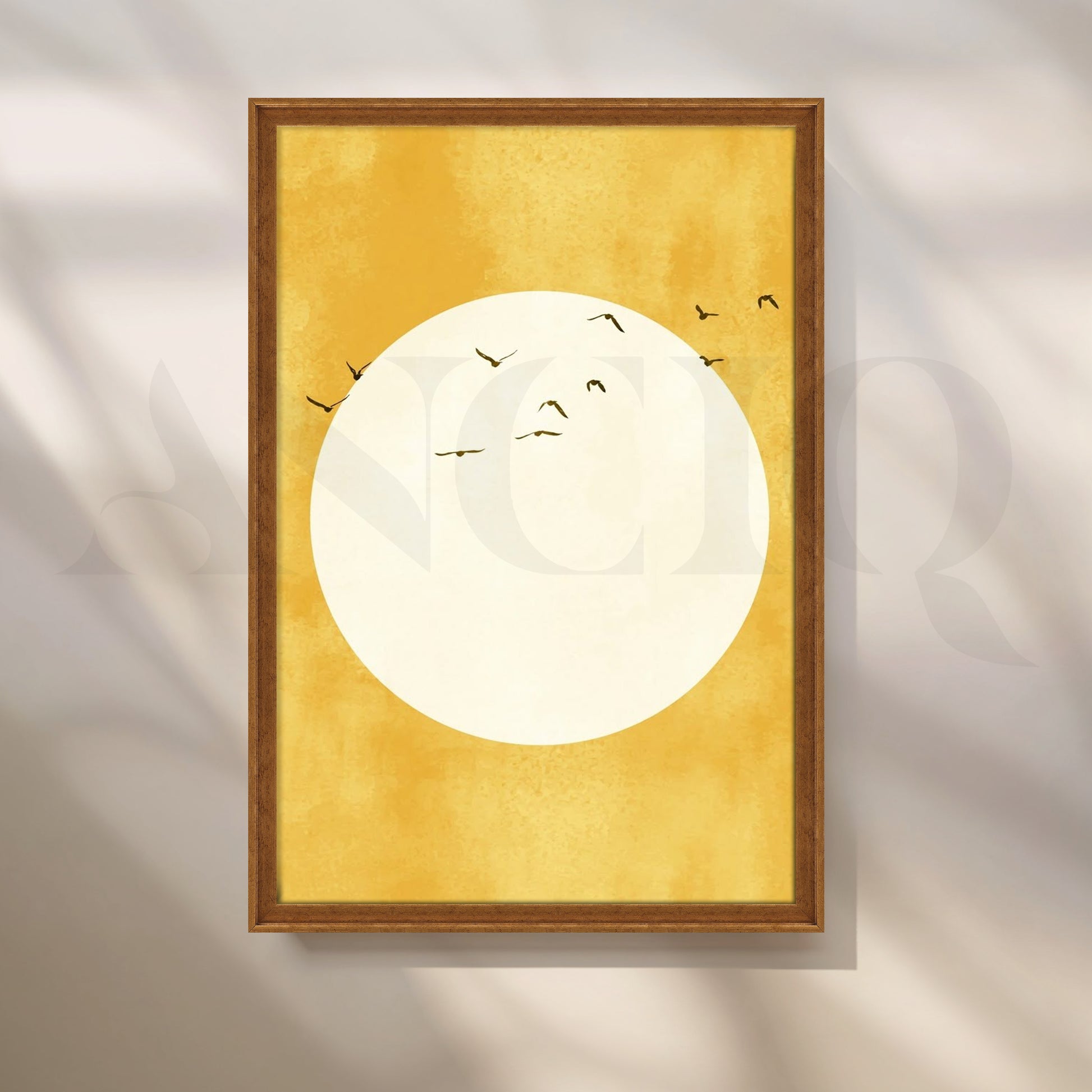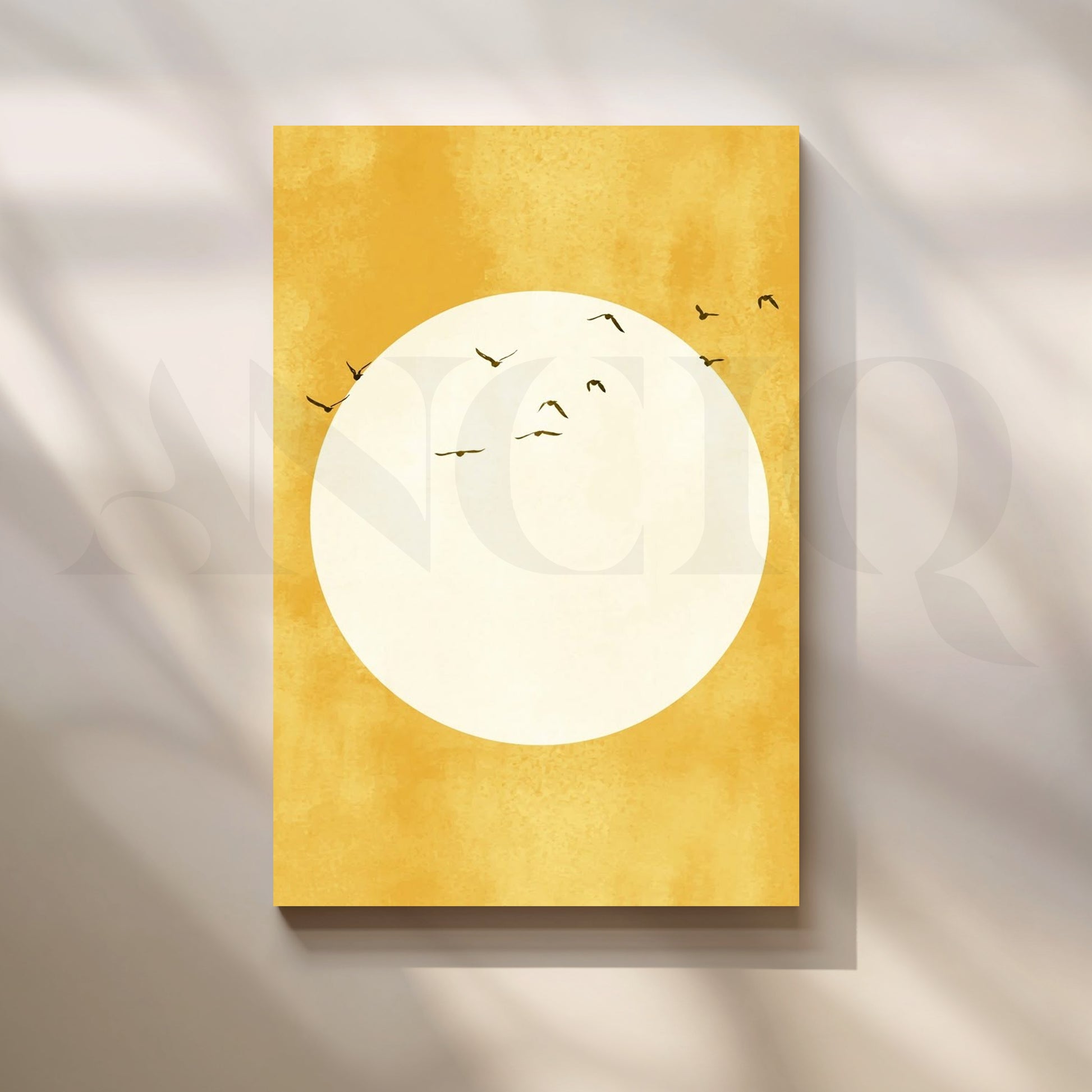 Anciq ‘Golden Horizon’ Canvas Painting brings warmth with its radiant sun orb and flying birds against a soft yellow backdrop. A serene blend of minimalism and motion—perfect for living rooms, cafés, or breakfast nooks. This artwork suits keywords like sun canvas art, yellow abstract painting, or minimal landscape canvas.