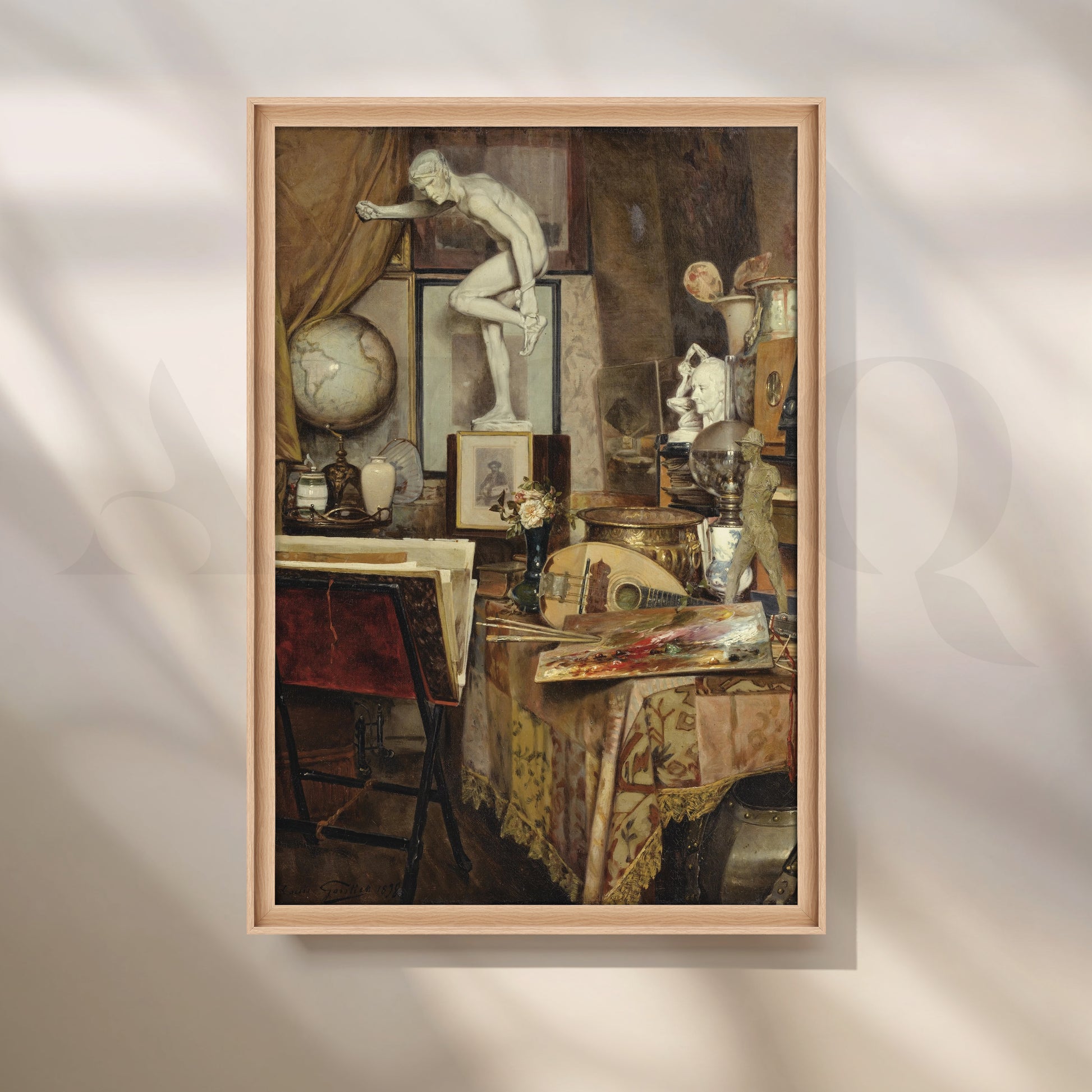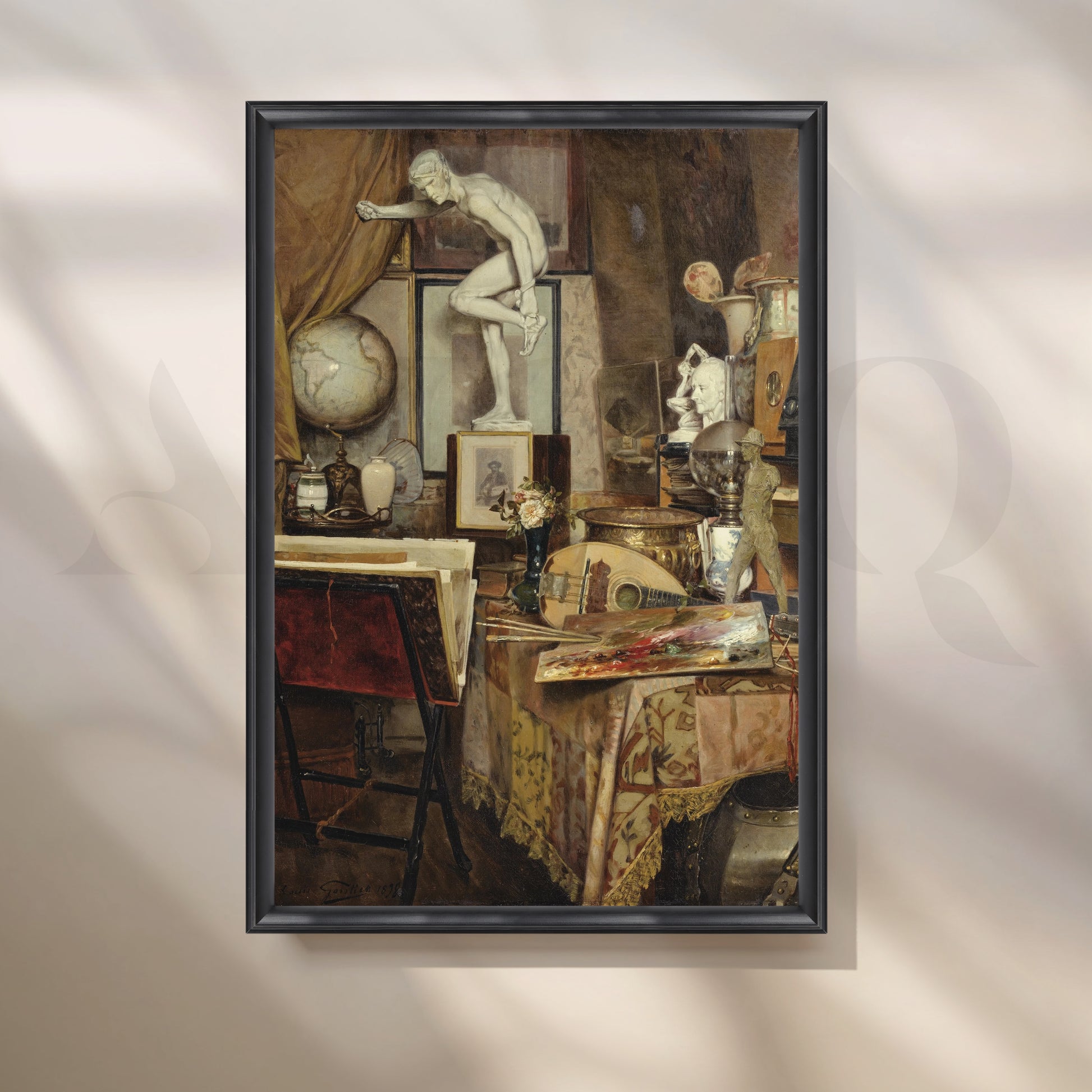 An intricate Anciq artwork depicting an artist’s studio filled with sculptures, palettes, and artifacts—symbolizing creativity and culture. Perfect for studies or creative workspaces. Keywords: artist studio painting, vintage interior art, classic decor wall canvas, artistic workspace decor, European fine art reproduction.