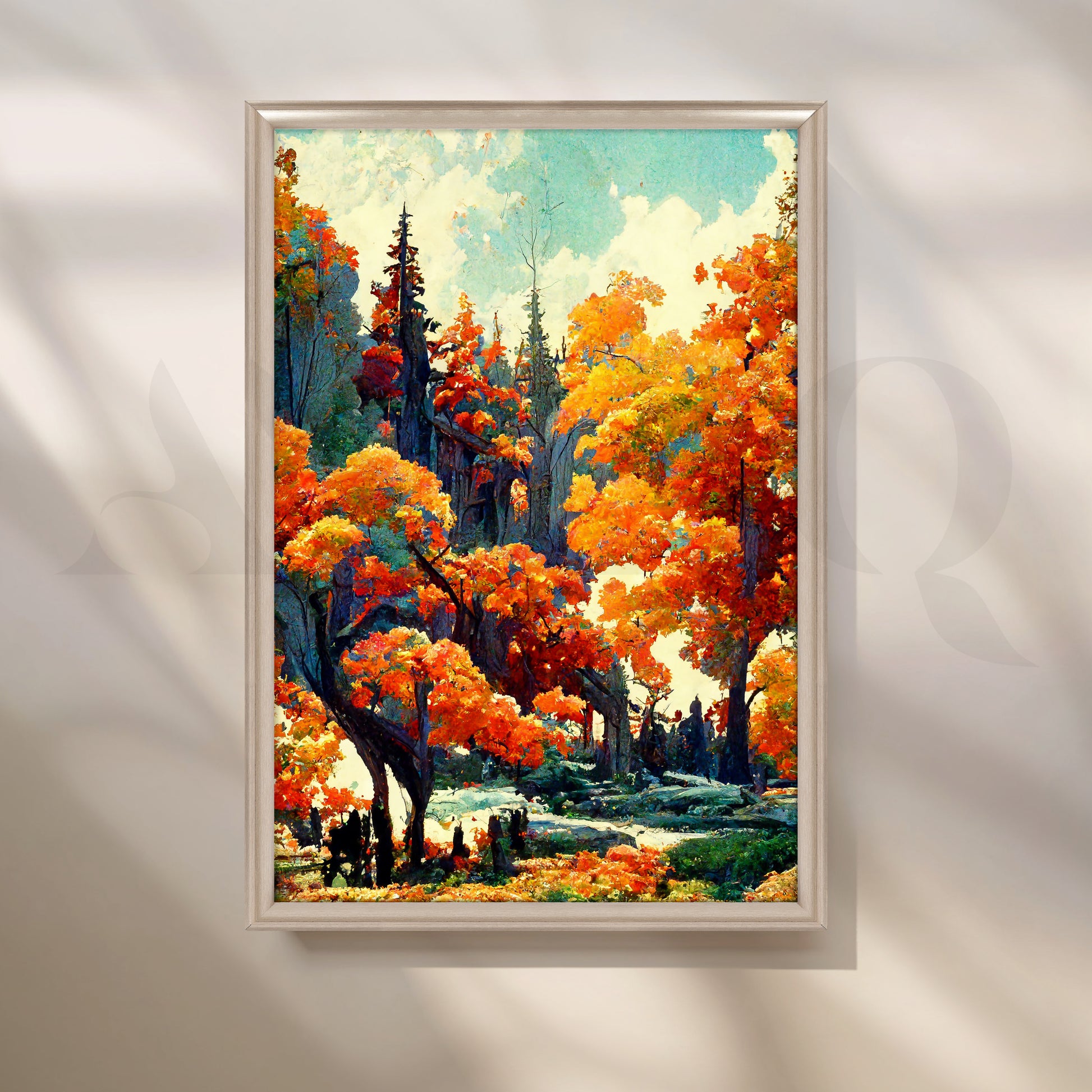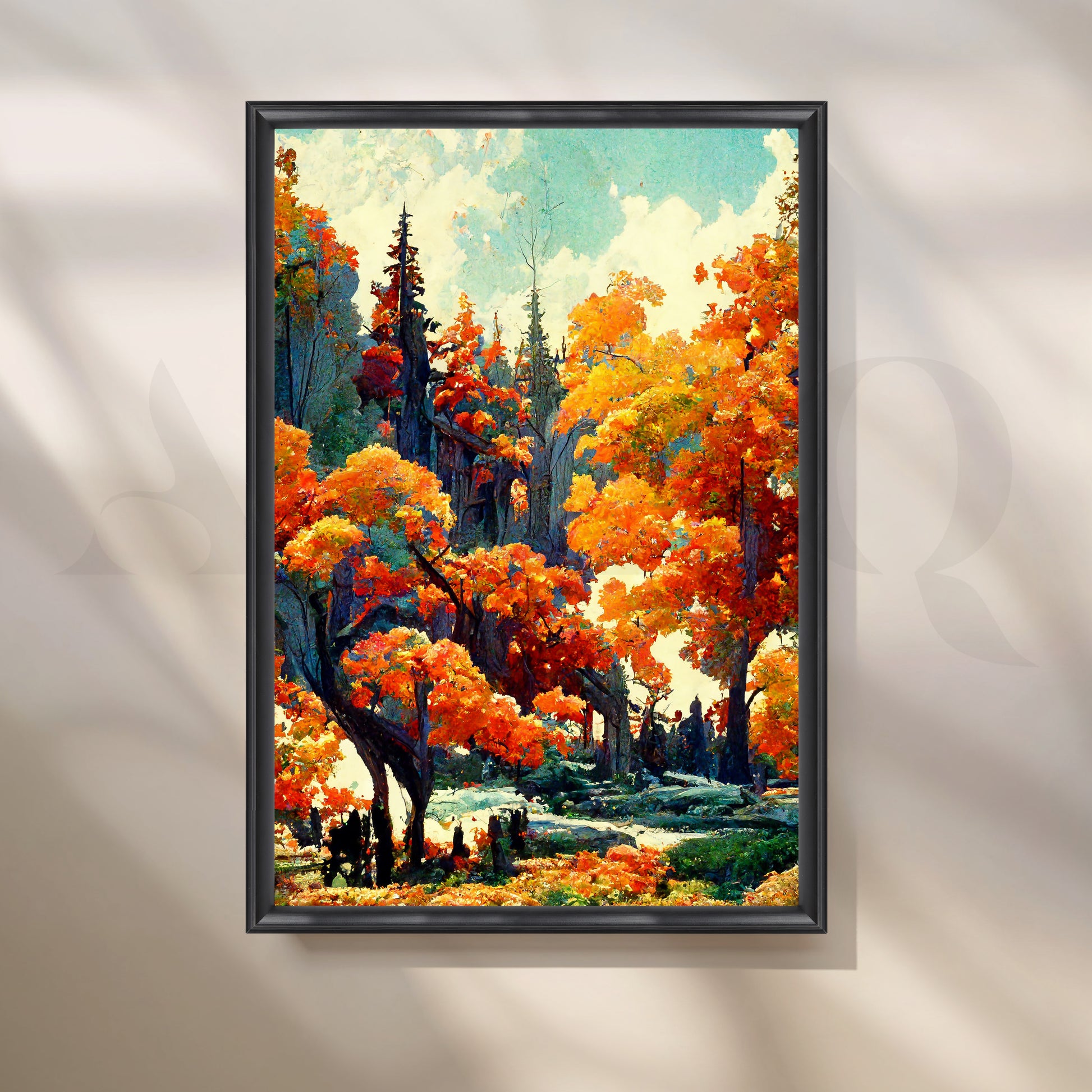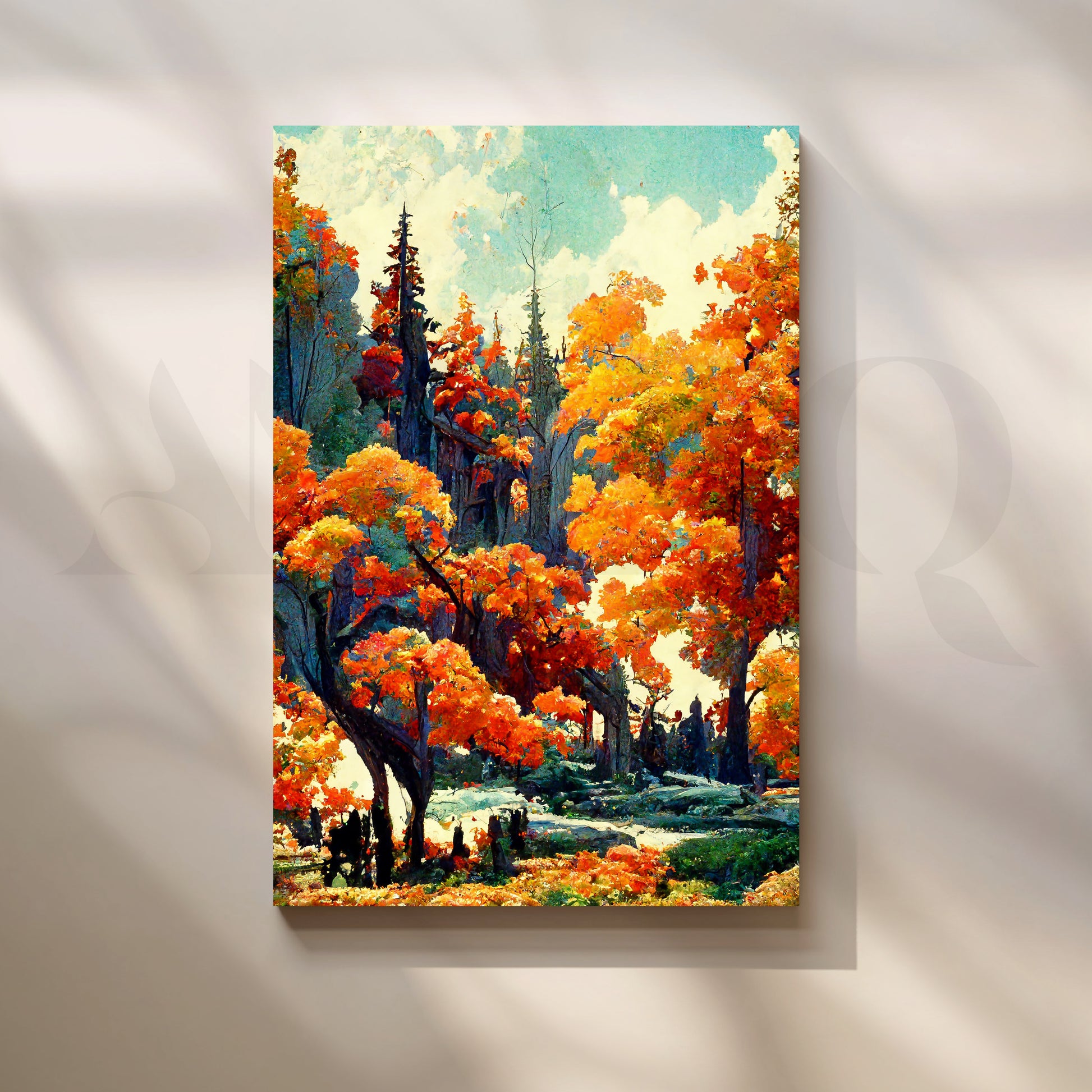 Bring the magic of fall indoors with Anciq’s Autumn Forest Glow canvas artwork. Vivid orange and golden trees frame a sunlit forest path, contrasted with deep teal shadows and a bright sky. Tiny figures at the base of the trees add a sense of scale and wonder, making this landscape painting feel immersive and alive.