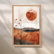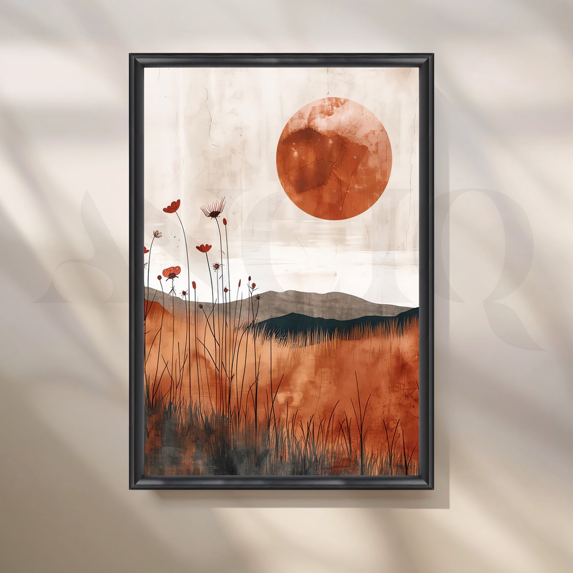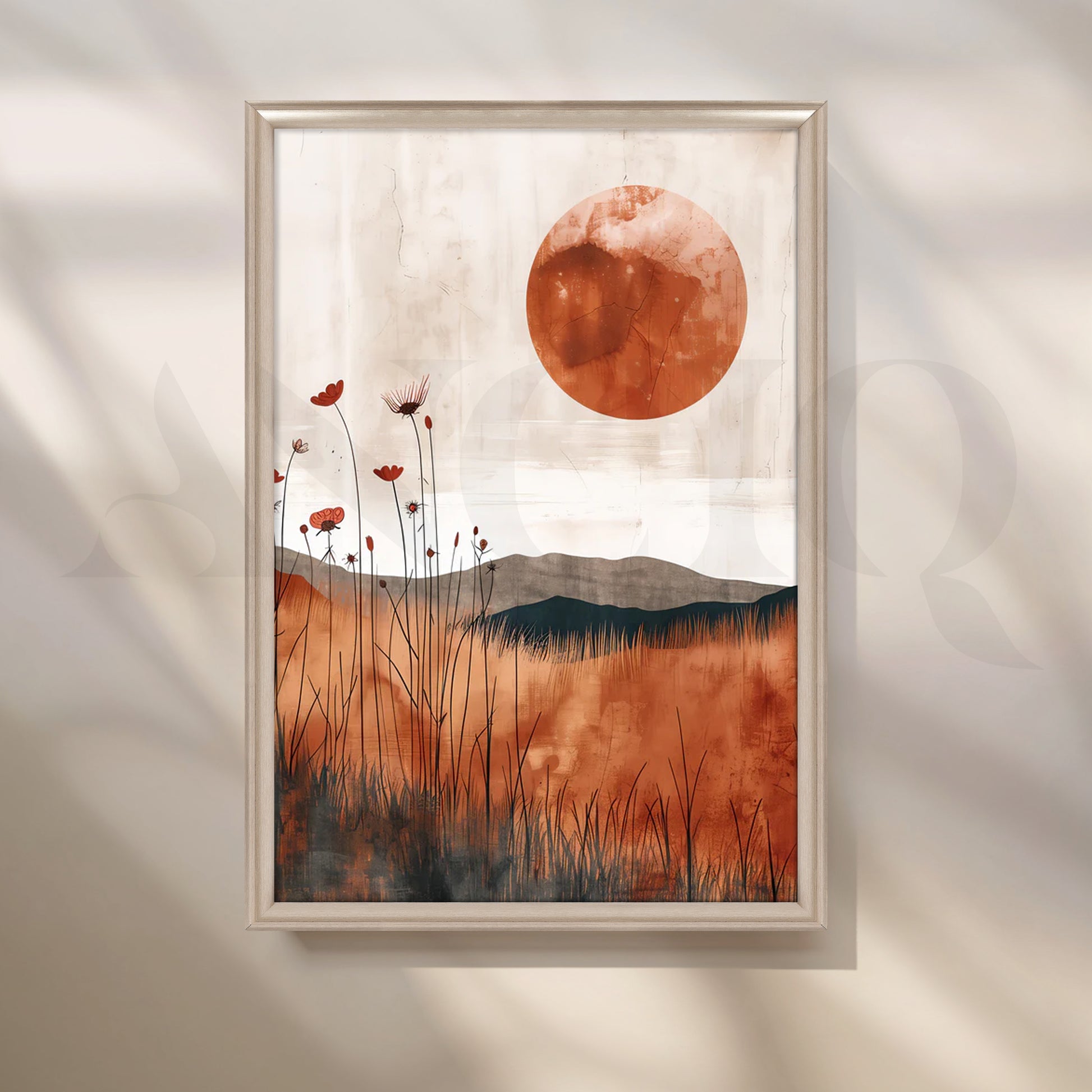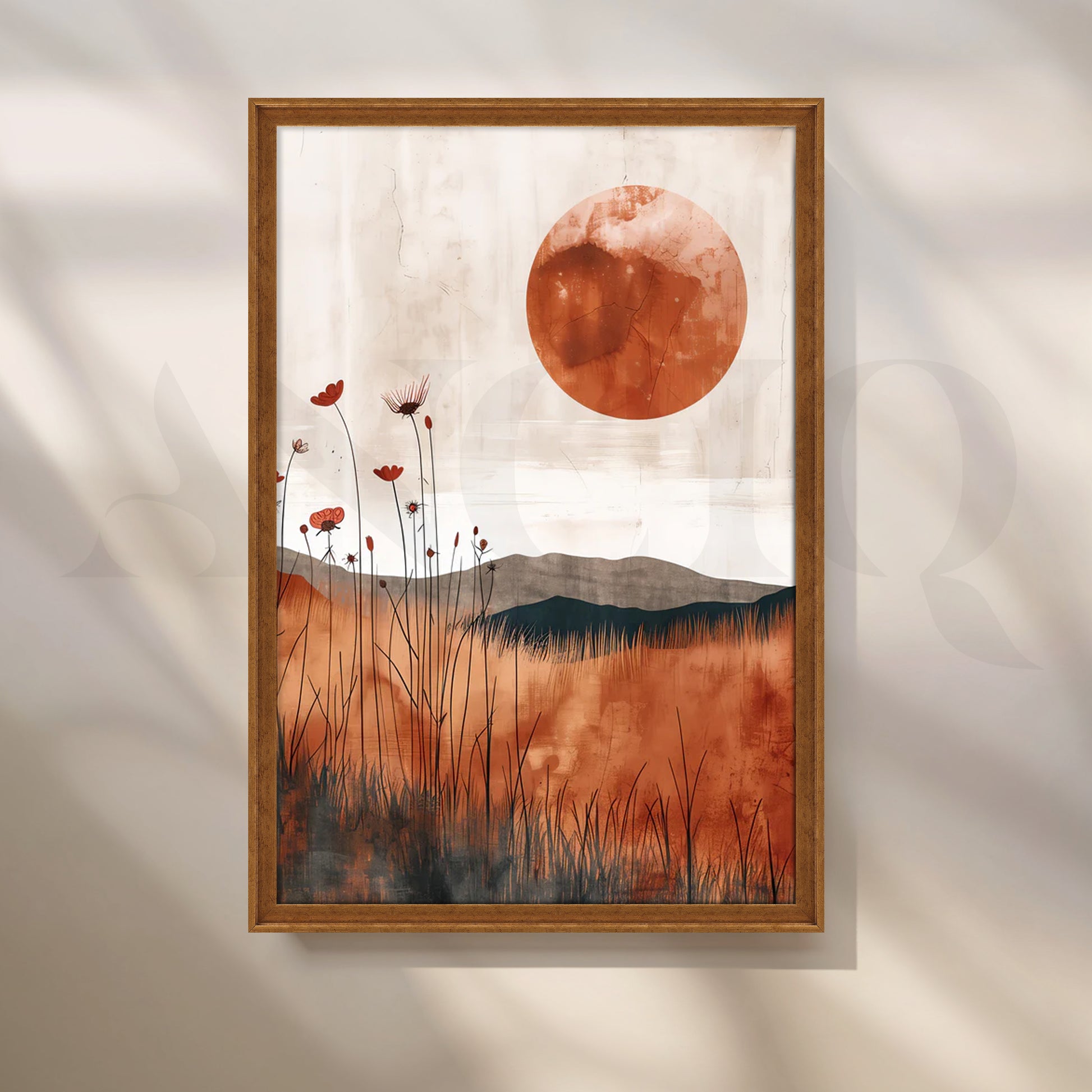 Bathe your space in warm earth tones with this minimalist landscape: a rust-terracotta sun hangs over soft sage and charcoal hills, while delicate wildflowers and grasses sway across a sandy, textured ground. This modern wall art blends abstract canvas painting with serene desert vibes—perfect for neutral home décor, Japandi or Scandinavian interiors, and boho bedroom décor. Its calm palette of terracotta, clay, sandstone, and deep ink pairs beautifully with natural woods and linen, making it standout “large living room art,” a soothing entryway focal point, or layered gallery-wall statement for contemporary homes.