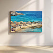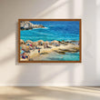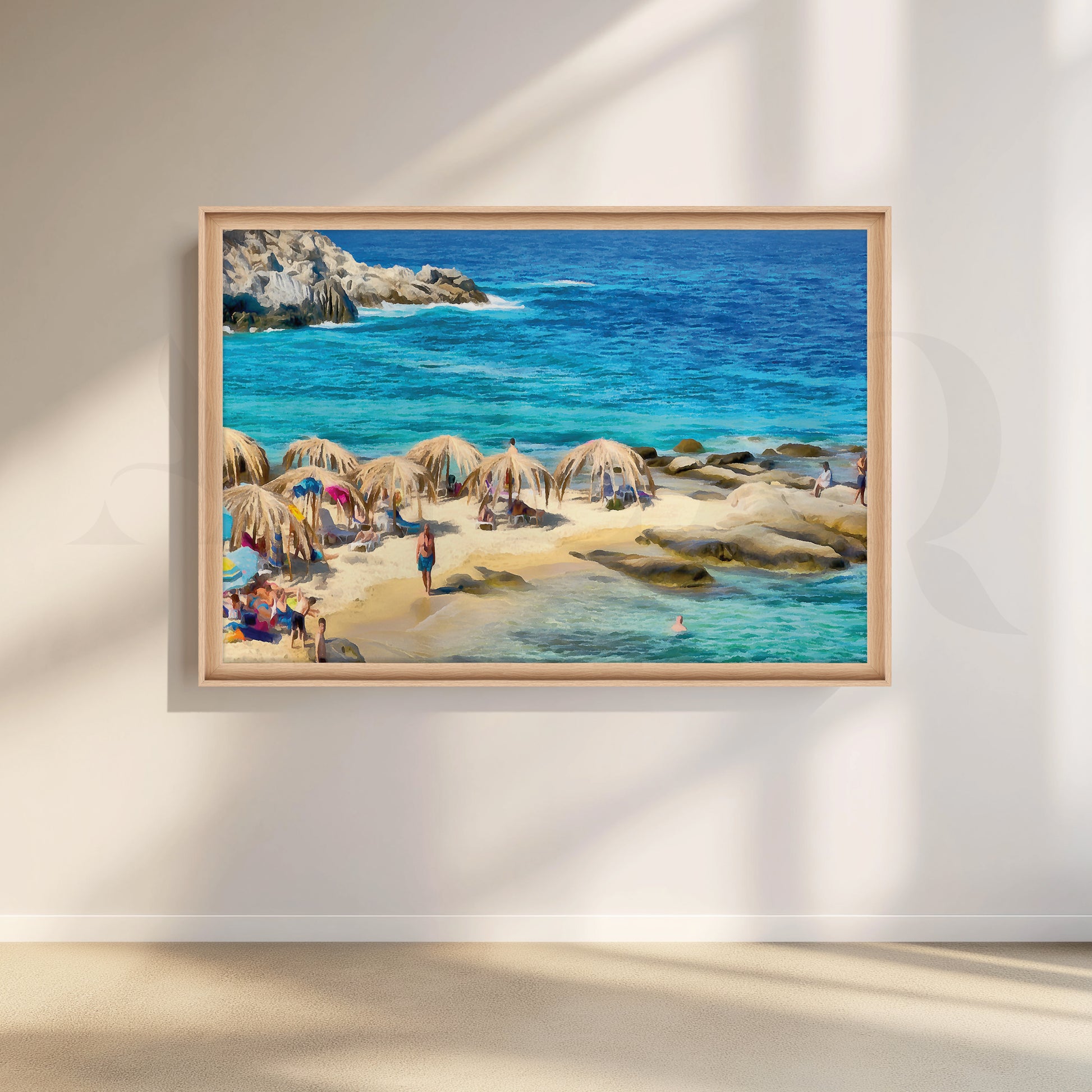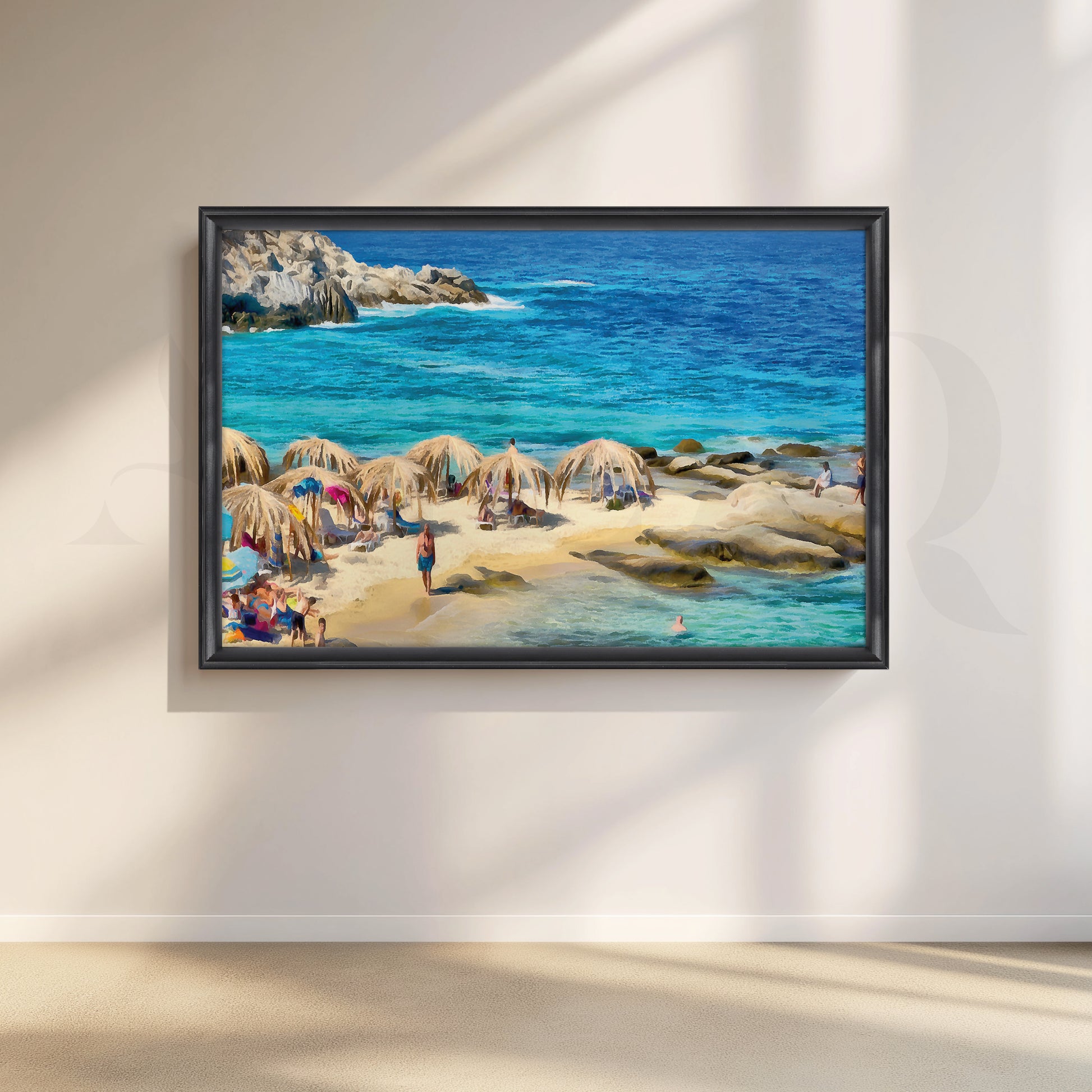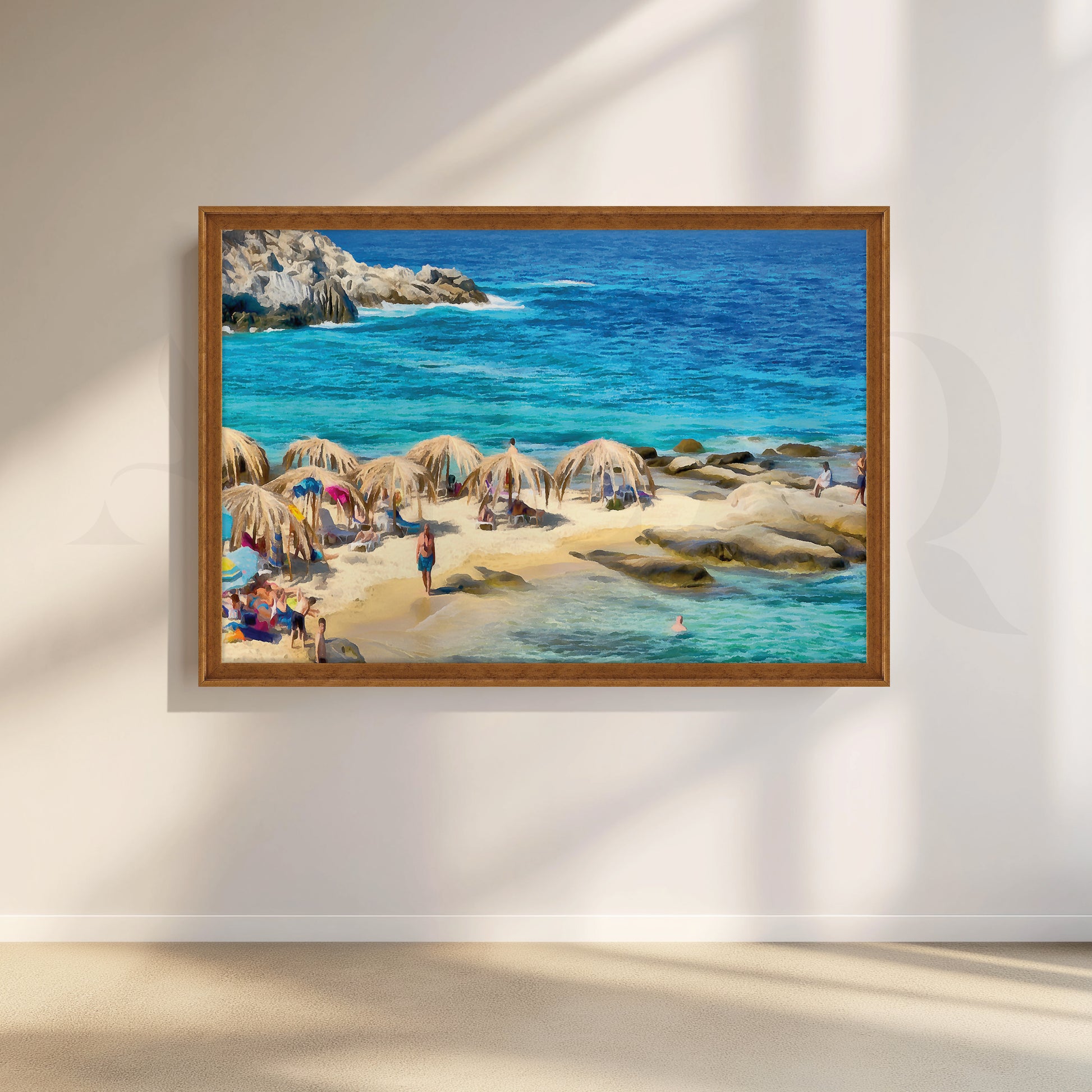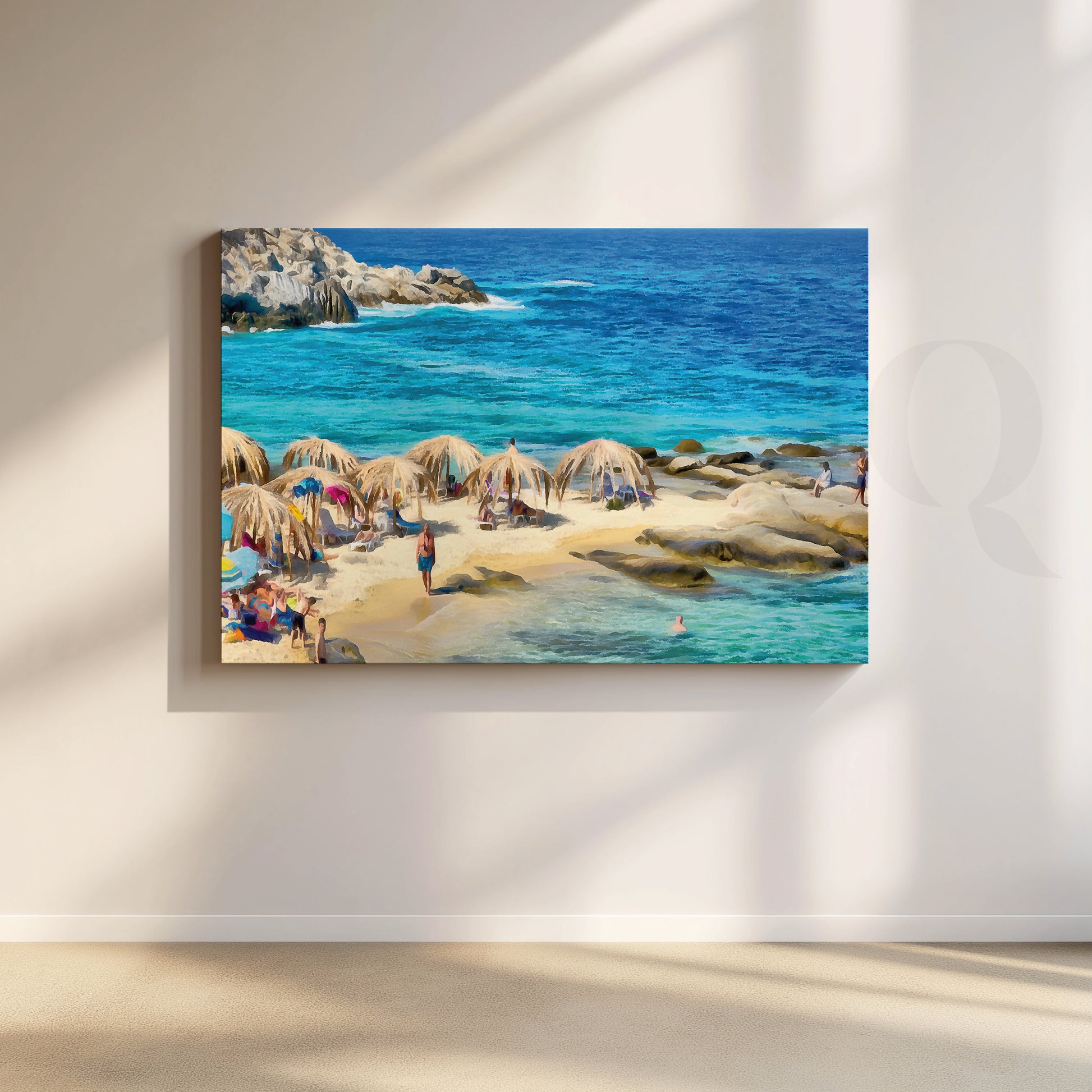 Escape to sun-drenched shores with this captivating beach painting. Turquoise waves dance towards a shore of shimmering sand, whispering promises of serenity. Hand-painted with high-quality pigments, this artwork brings the calming beauty of the coast directly to your walls. Perfect for any beach lover's home.