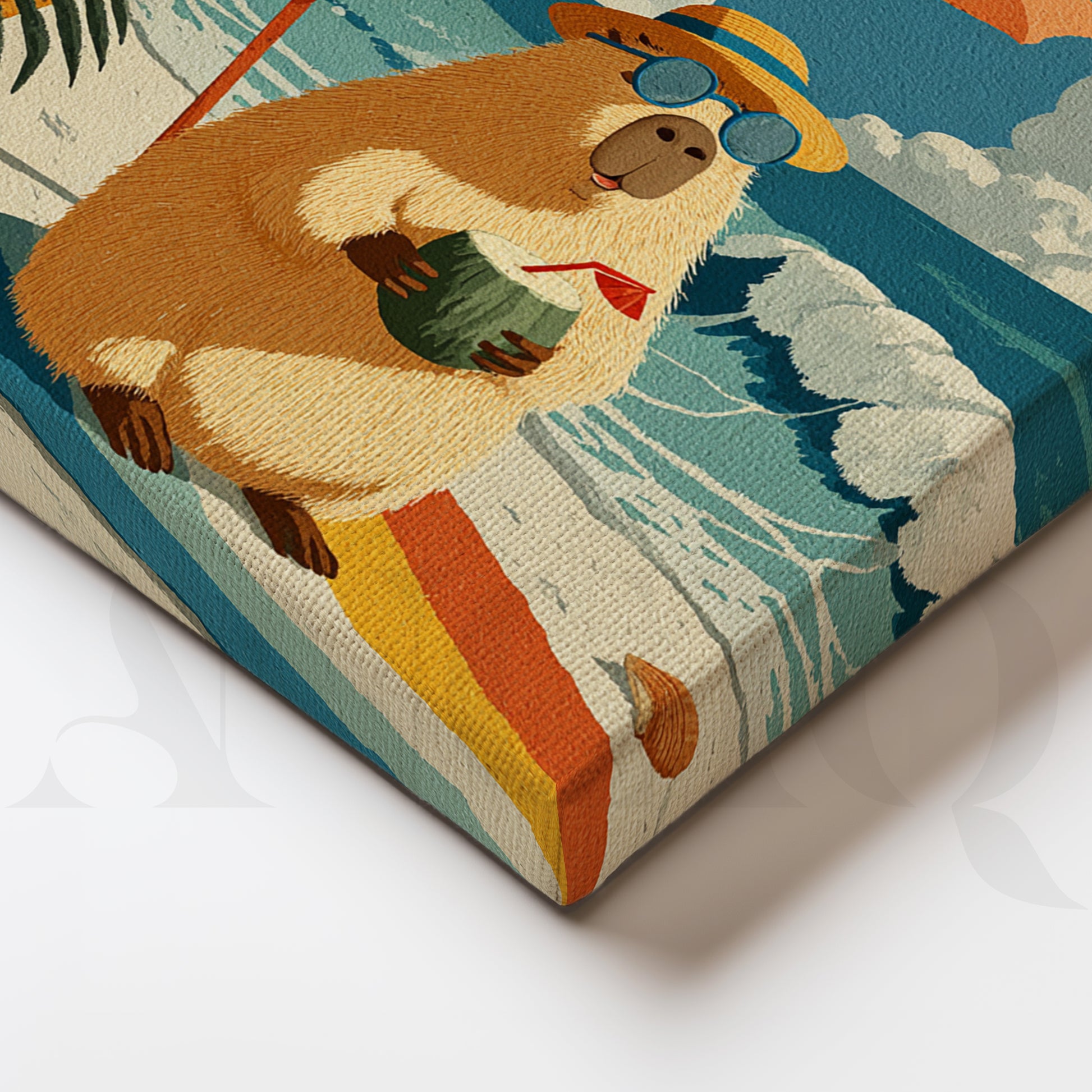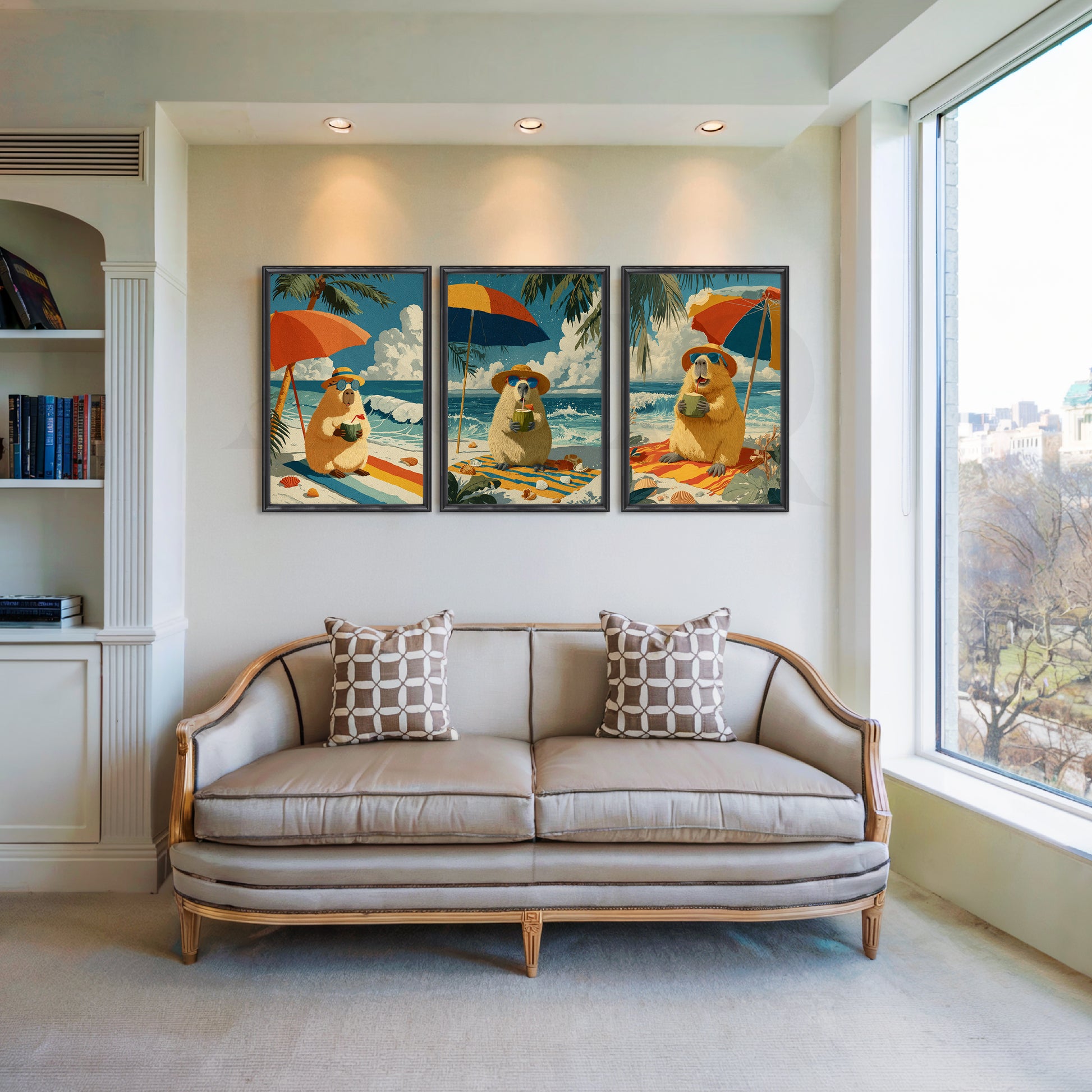 This quirky gallery wall features three chilled guinea pigs sipping drinks and sunbathing under umbrellas on a breezy beach. With its retro colour palette and playful pet theme, it’s perfect wall art for living rooms, kids’ rooms, playrooms, cafés, pet clinics and holiday homes. A fun conversation starter for anyone who loves animals and coastal décor.