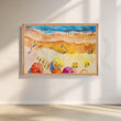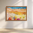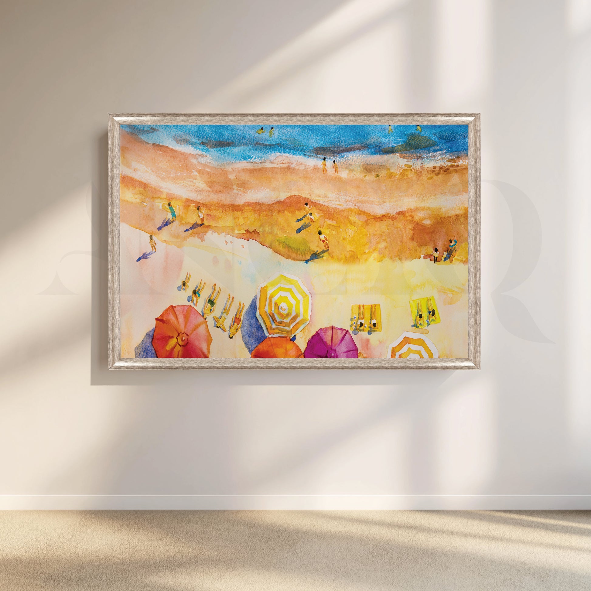 Escape to summer with this vibrant beach scene! A cloudless sky stretches above turquoise waves, dotted with colorful umbrellas. Sunbathers relax on the shore, while playful laughter dances on the breeze. This captivating painting brings the joy of a perfect beach day straight to your walls.
