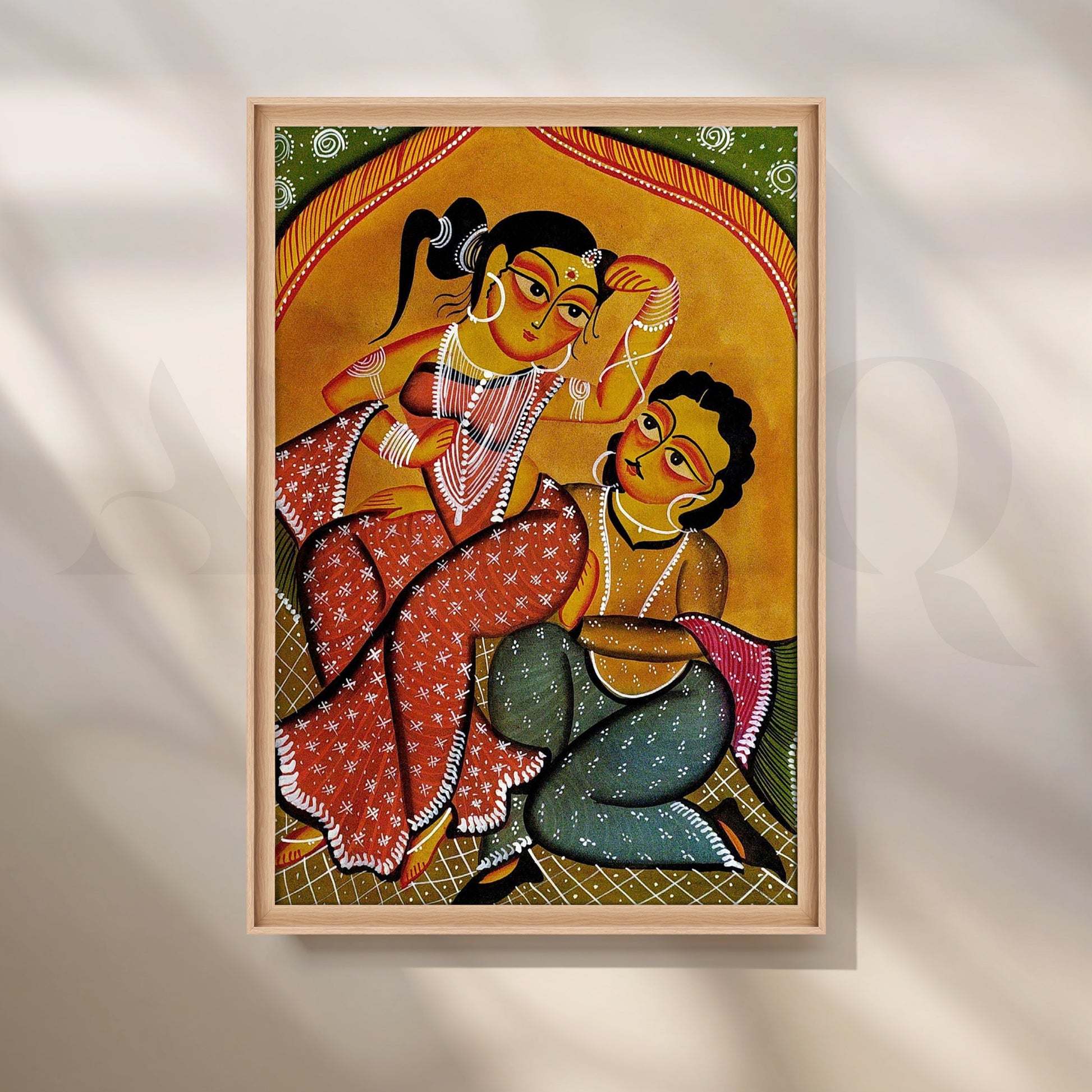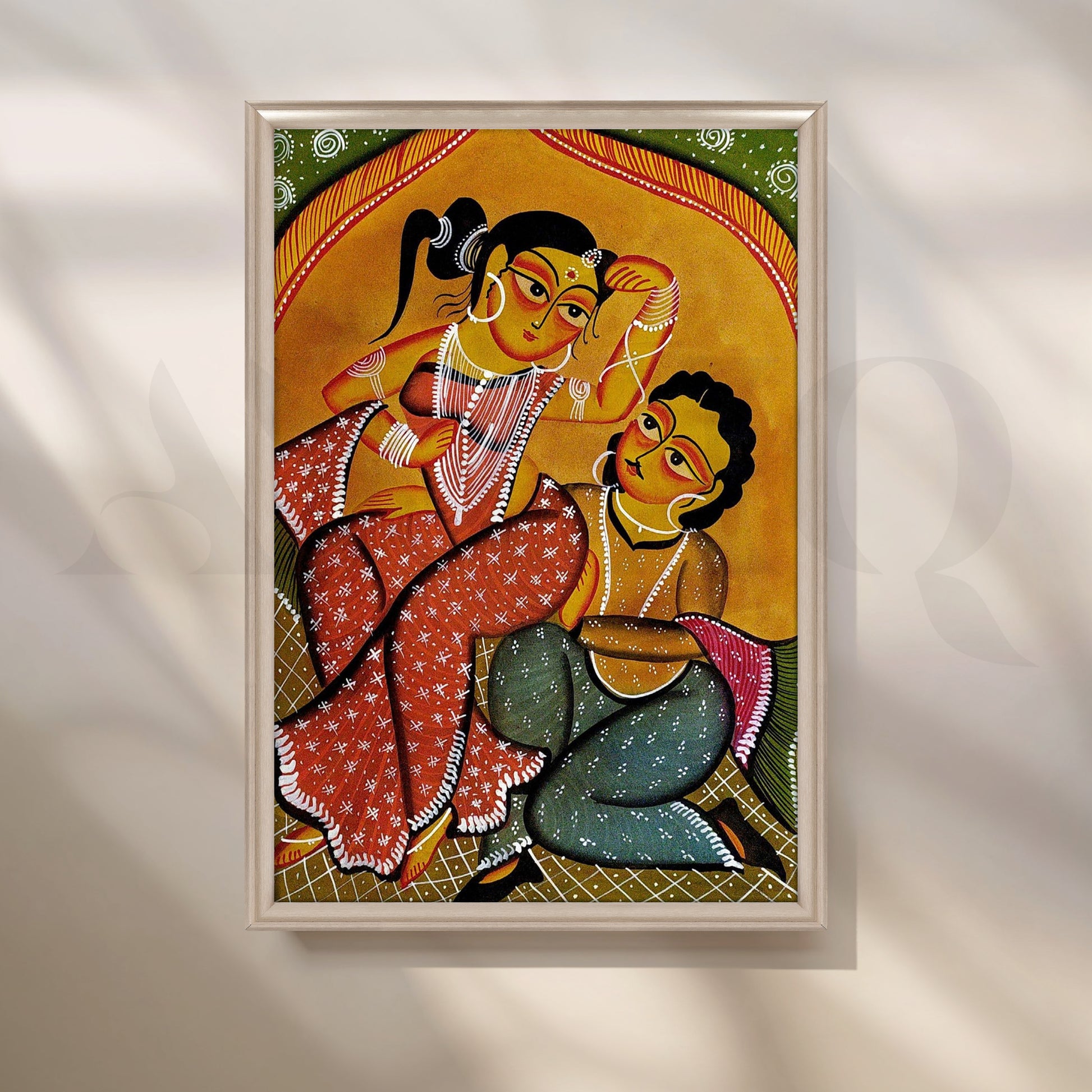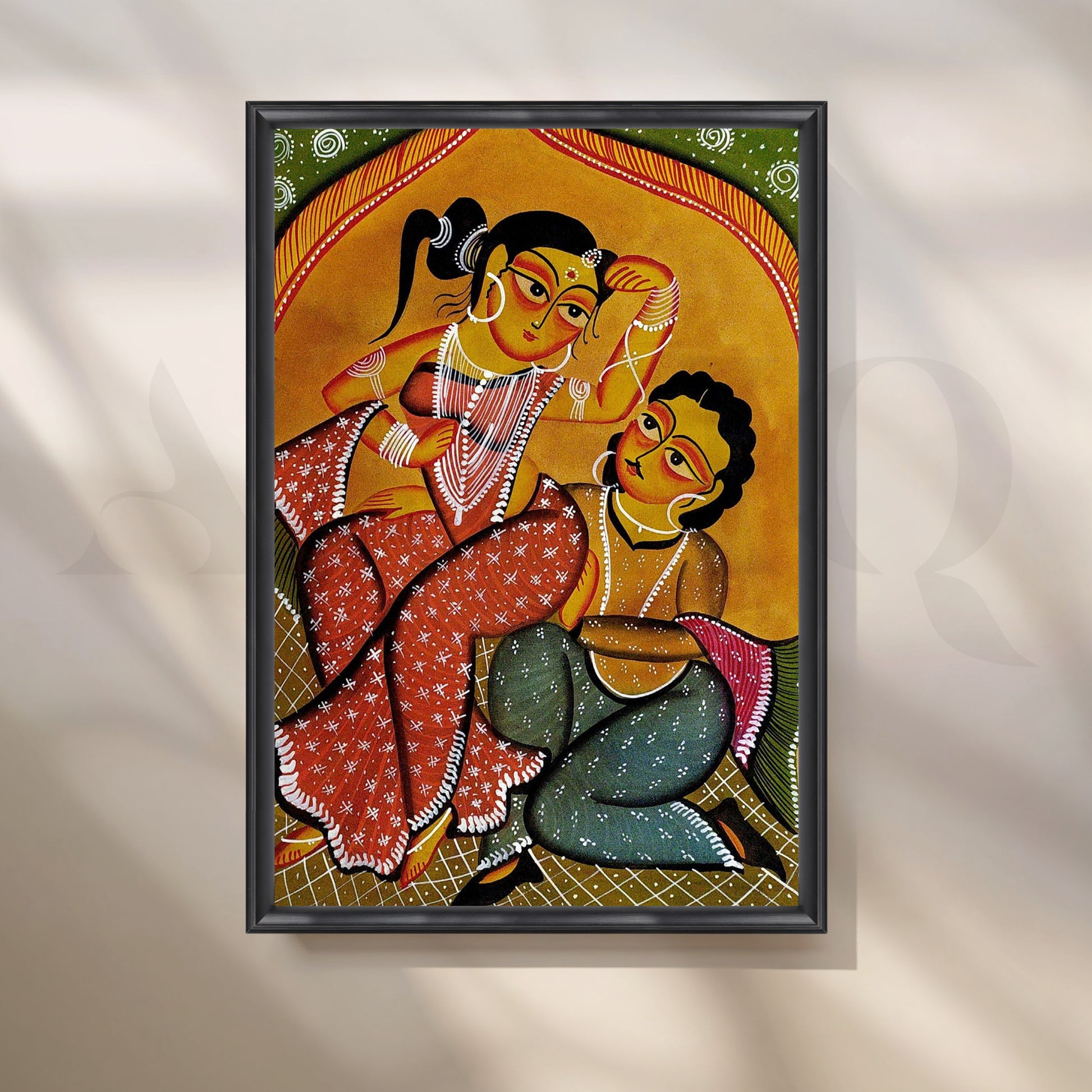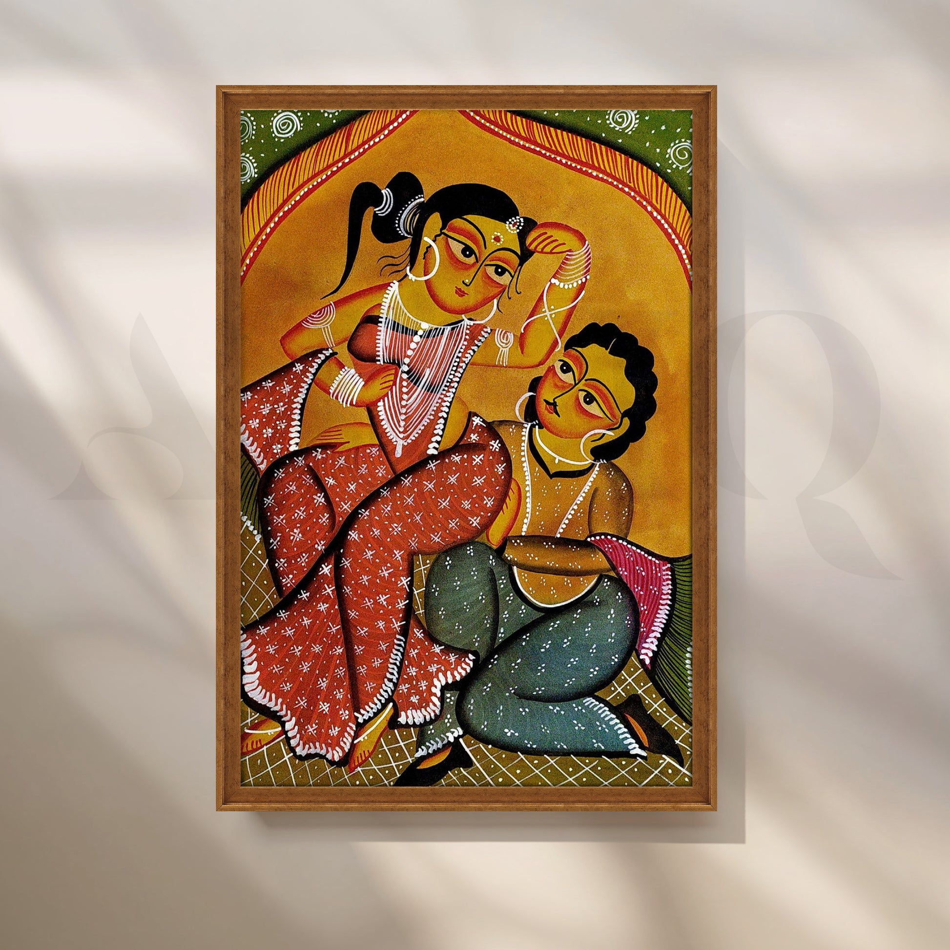 Inspired by Bengal’s folk-art traditions, this painting highlights a charming, intimate moment between two figures adorned in vibrant colors and intricate patterns. It adds warmth, storytelling, and cultural depth to any home. Perfect for those looking for Bengali folk art décor, traditional canvas paintings, and Indian heritage wall art.