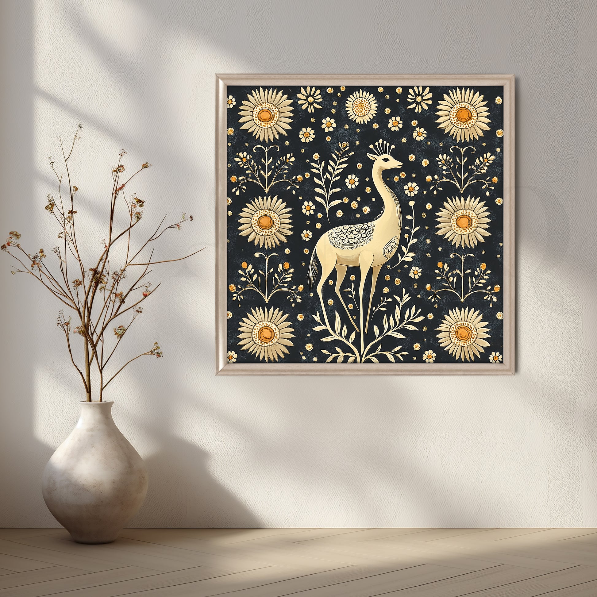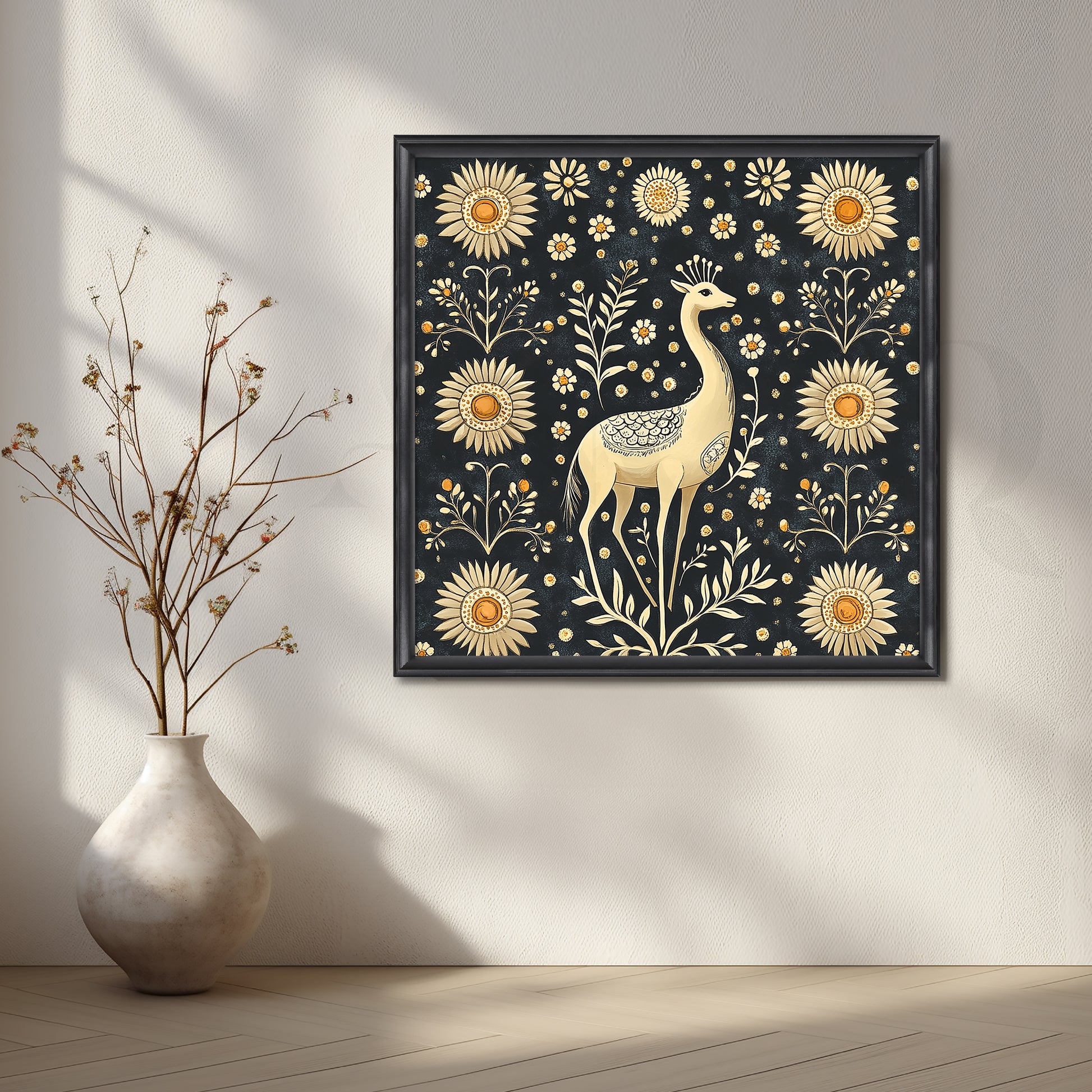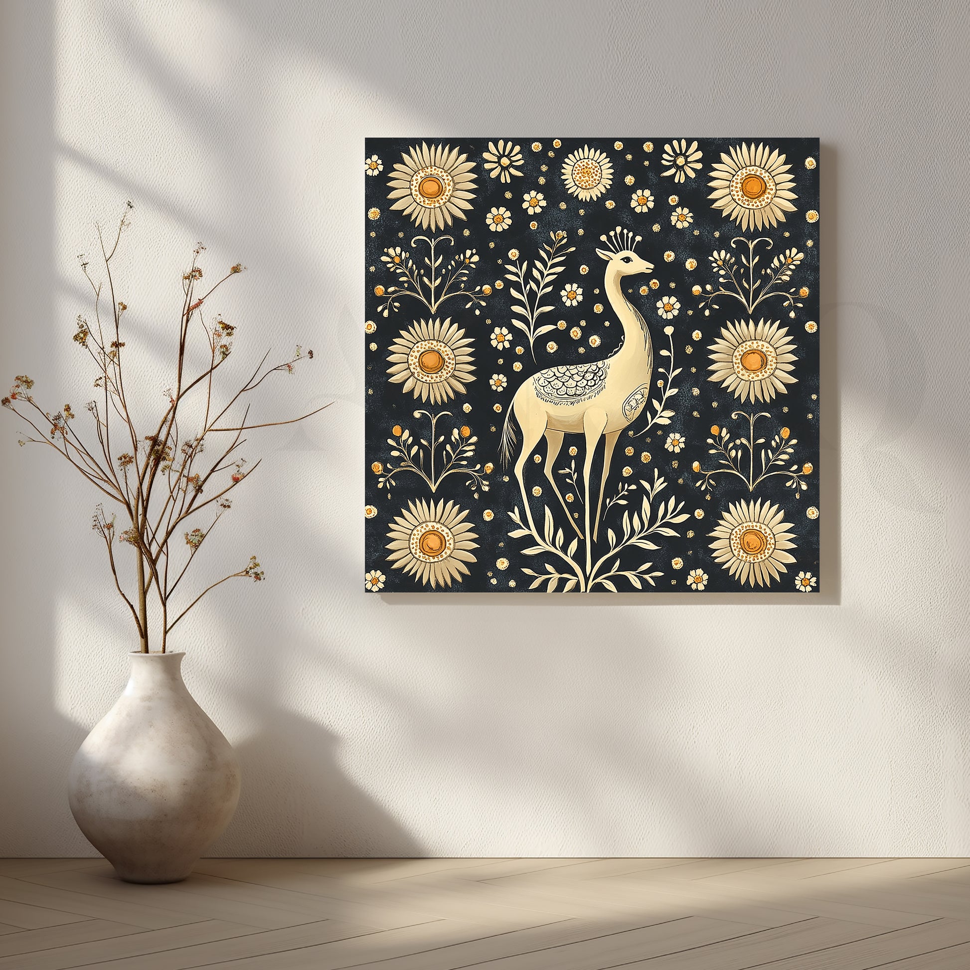 This Black Folk Deer with Golden Blossoms canvas features a stylised cream deer framed by symmetrical sunflower-style florals on a deep black background. The intricate folk art detailing makes it perfect for cozy corners, reading nooks or gallery walls needing elegant ethnic wall décor.