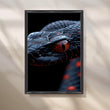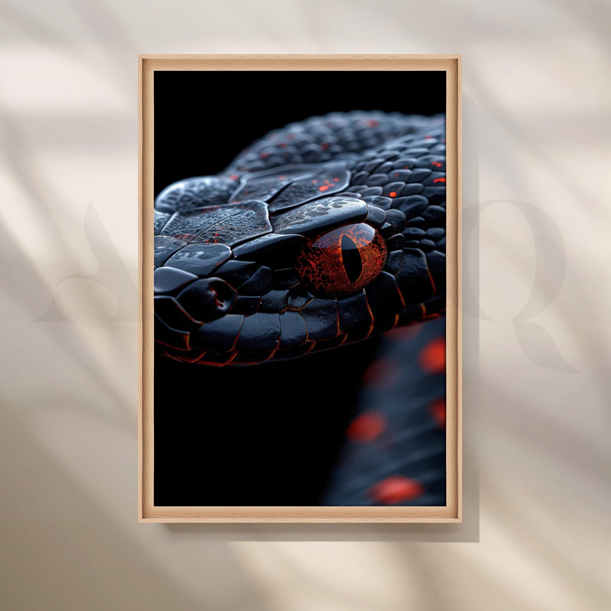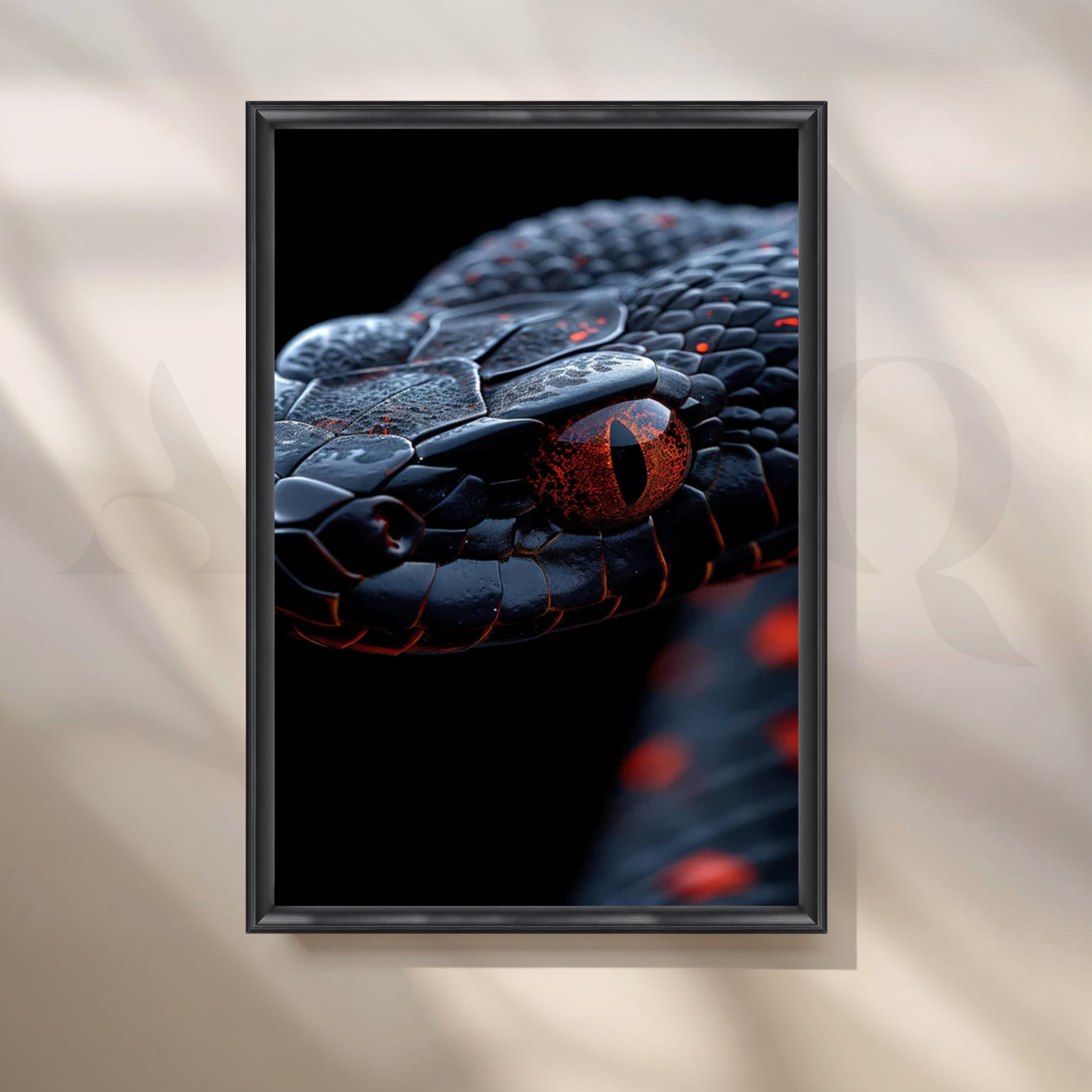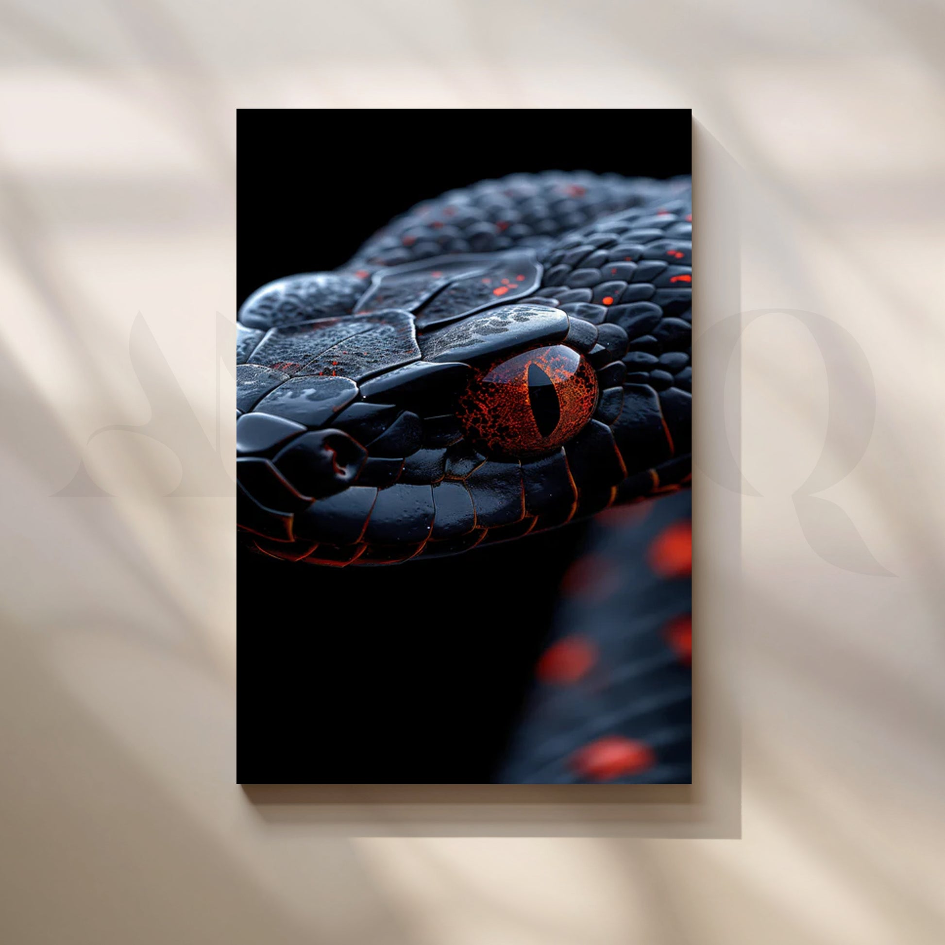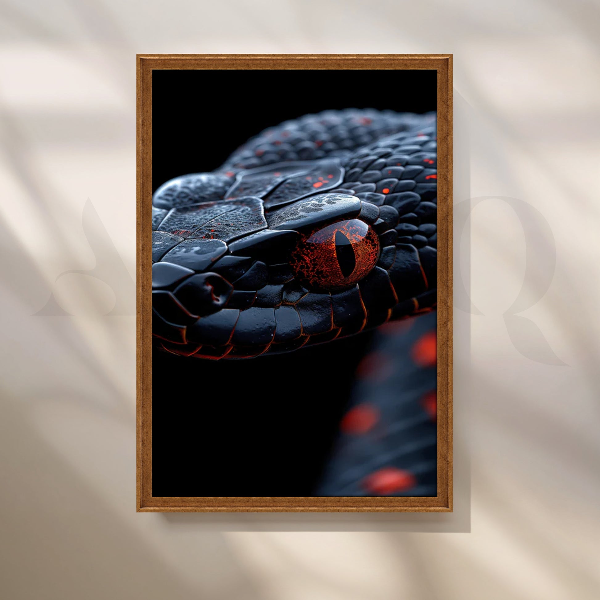 Hyper-detailed close-up of a black serpent with molten red eyes and scales—dramatic, high-contrast art that injects edge into modern spaces. Perfect statement piece for gaming setups and bachelor pads. Keywords: snake wall art, viper canvas painting, black and red artwork, reptile art print, macro animal portrait, dark aesthetic wall decor, gaming room art, modern office décor.