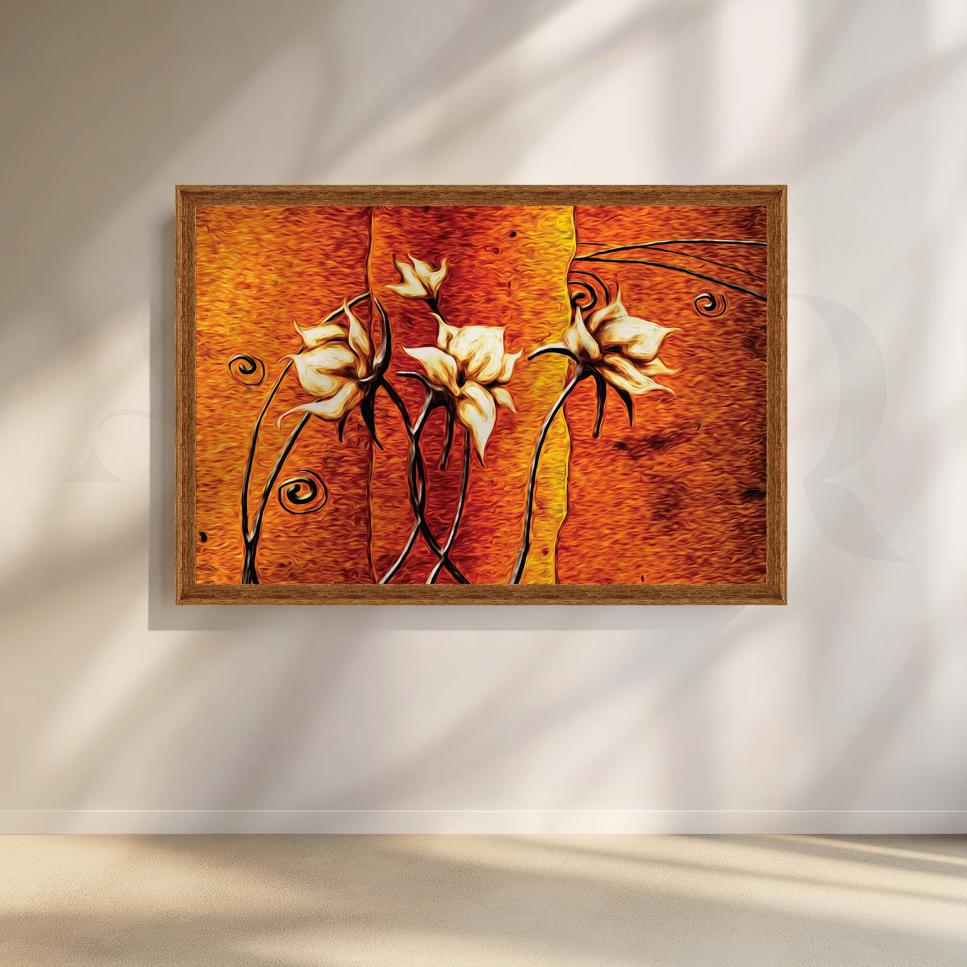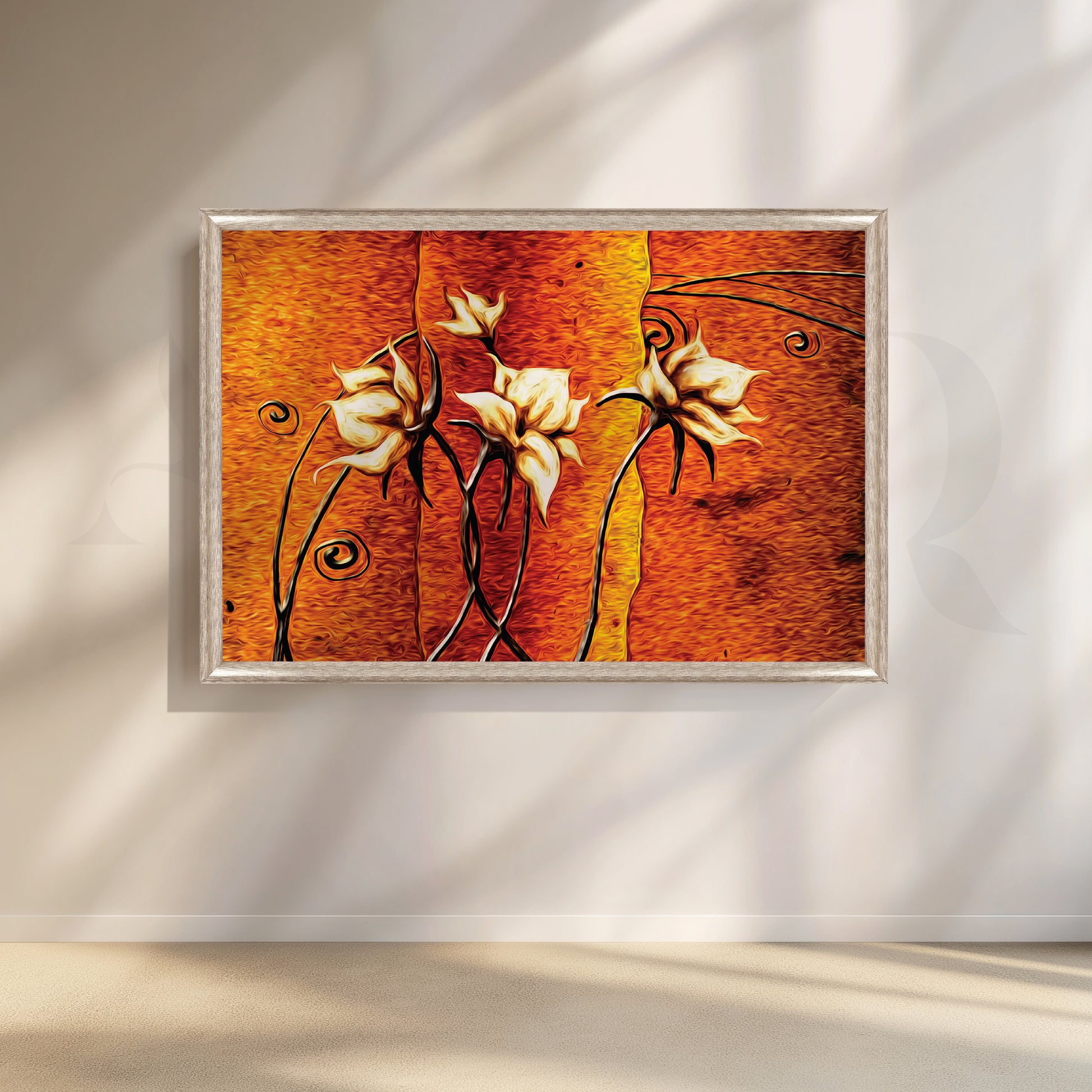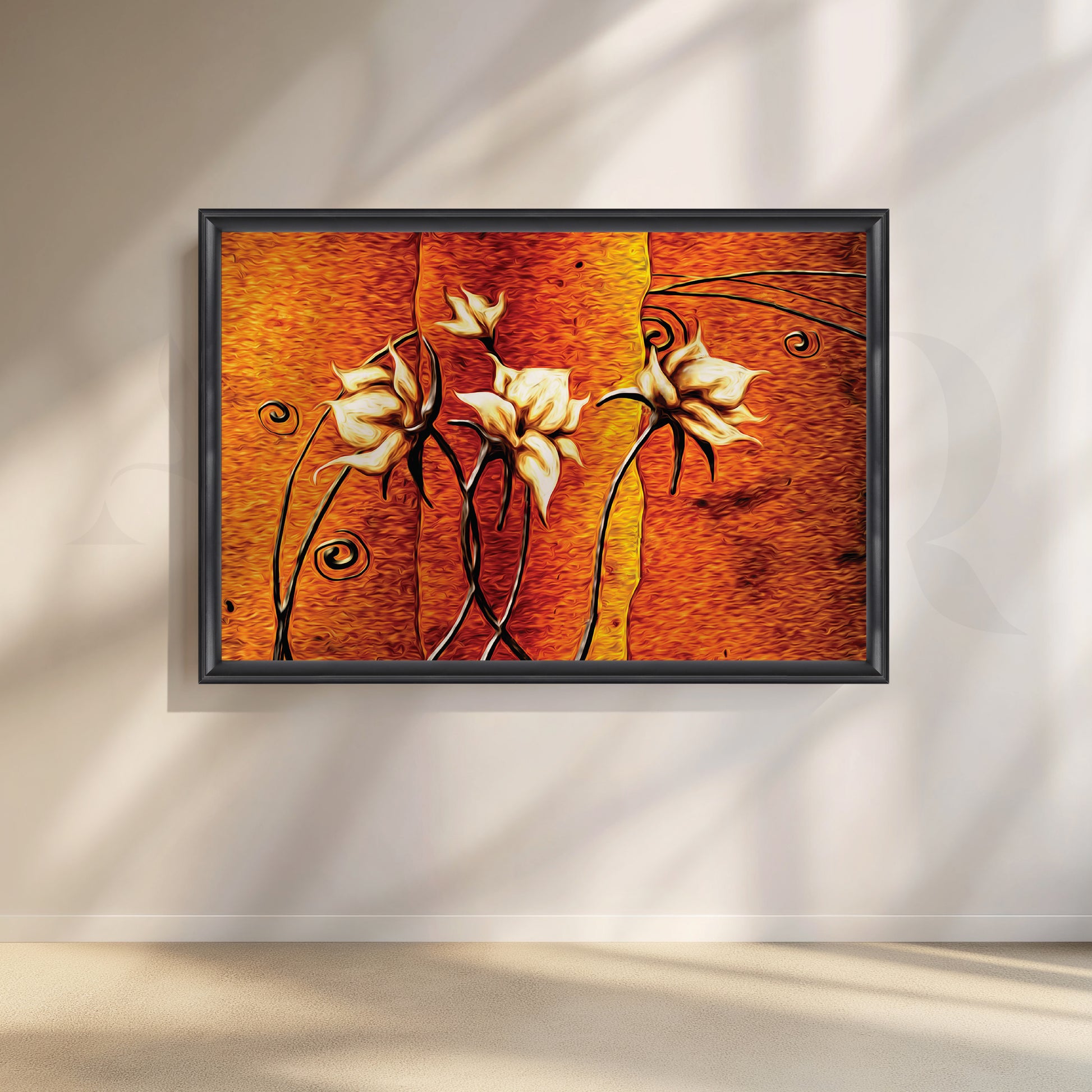 Bring a touch of vibrancy to your space with this captivating painting! Lush white flowers burst forth against a bold golden background, creating a stunning contrast. This piece is sure to be a conversation starter, adding a touch of elegance and drama to any room.