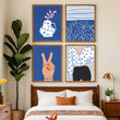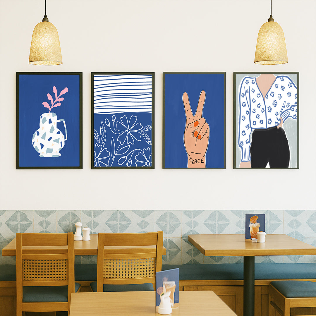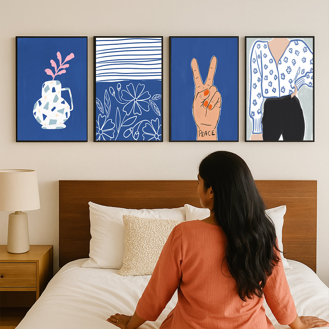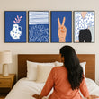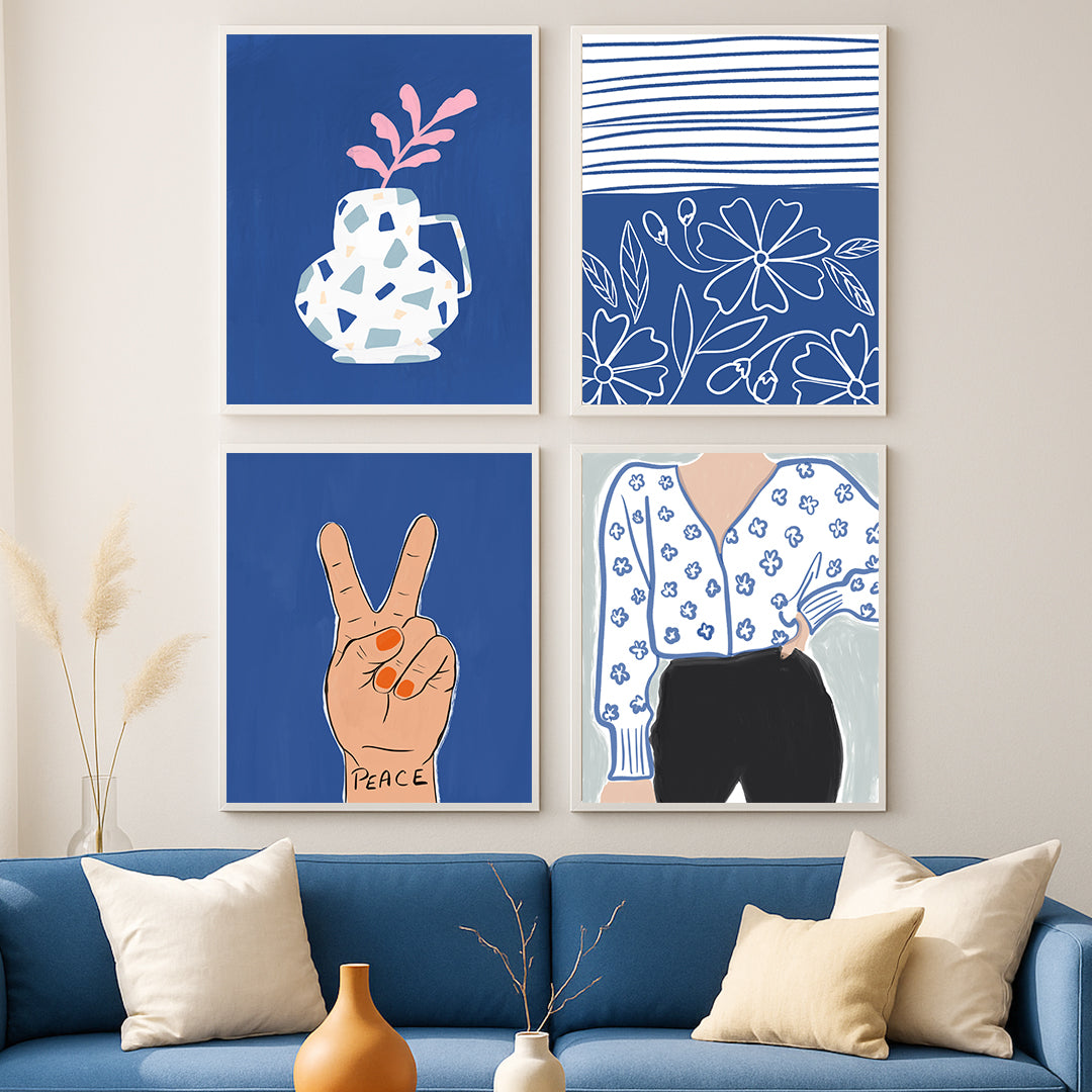 Blue Harmony Gallery Walls feature minimalist illustrations blending florals, fashion, and peace motifs in soothing blue and nude tones. Ideal for creating a calming yet expressive focal point in modern living spaces.