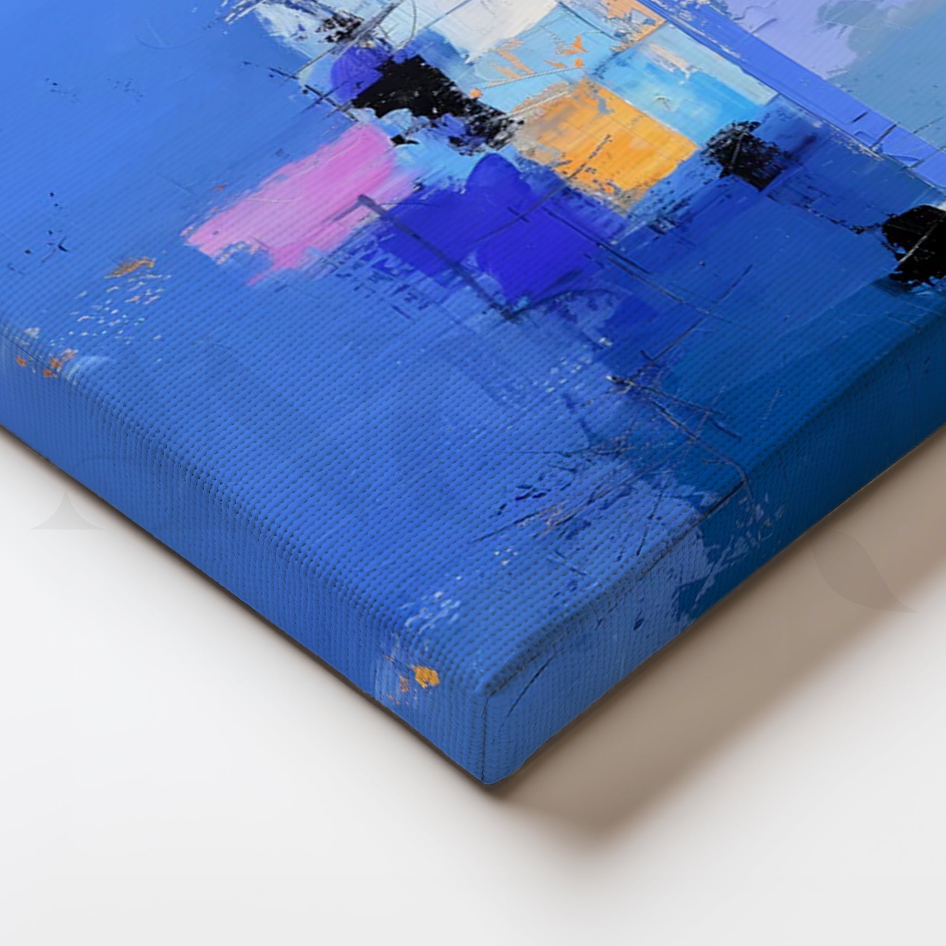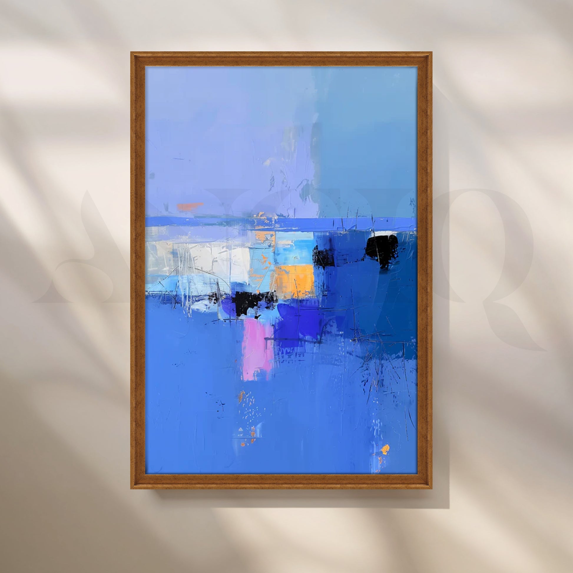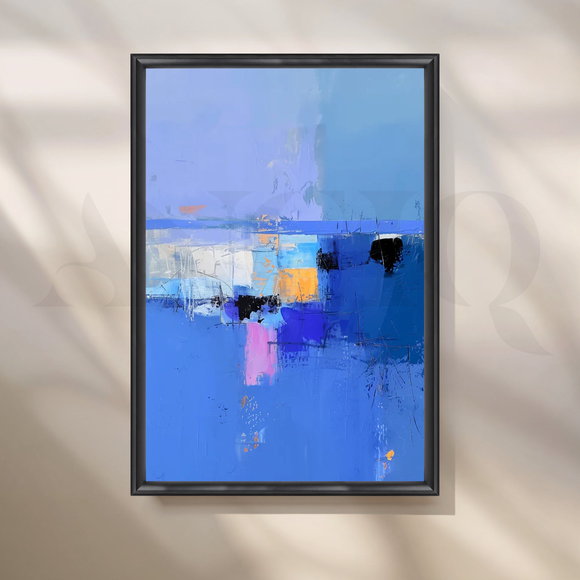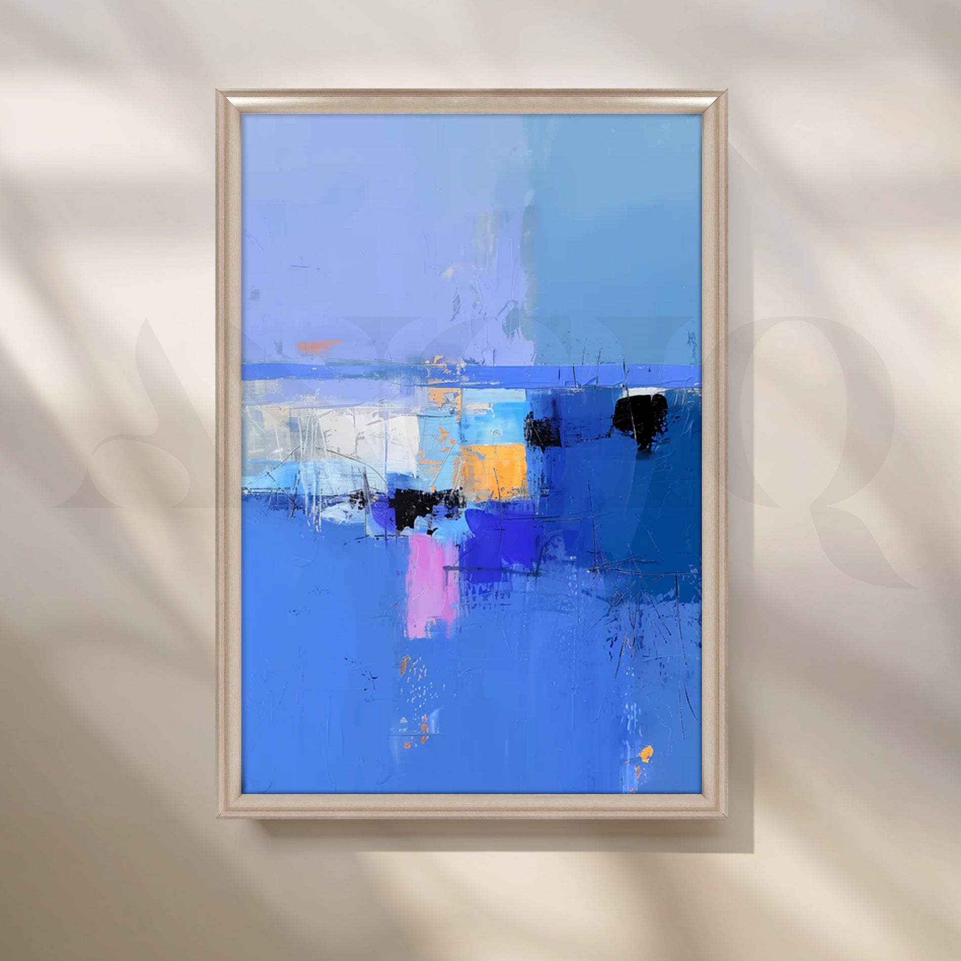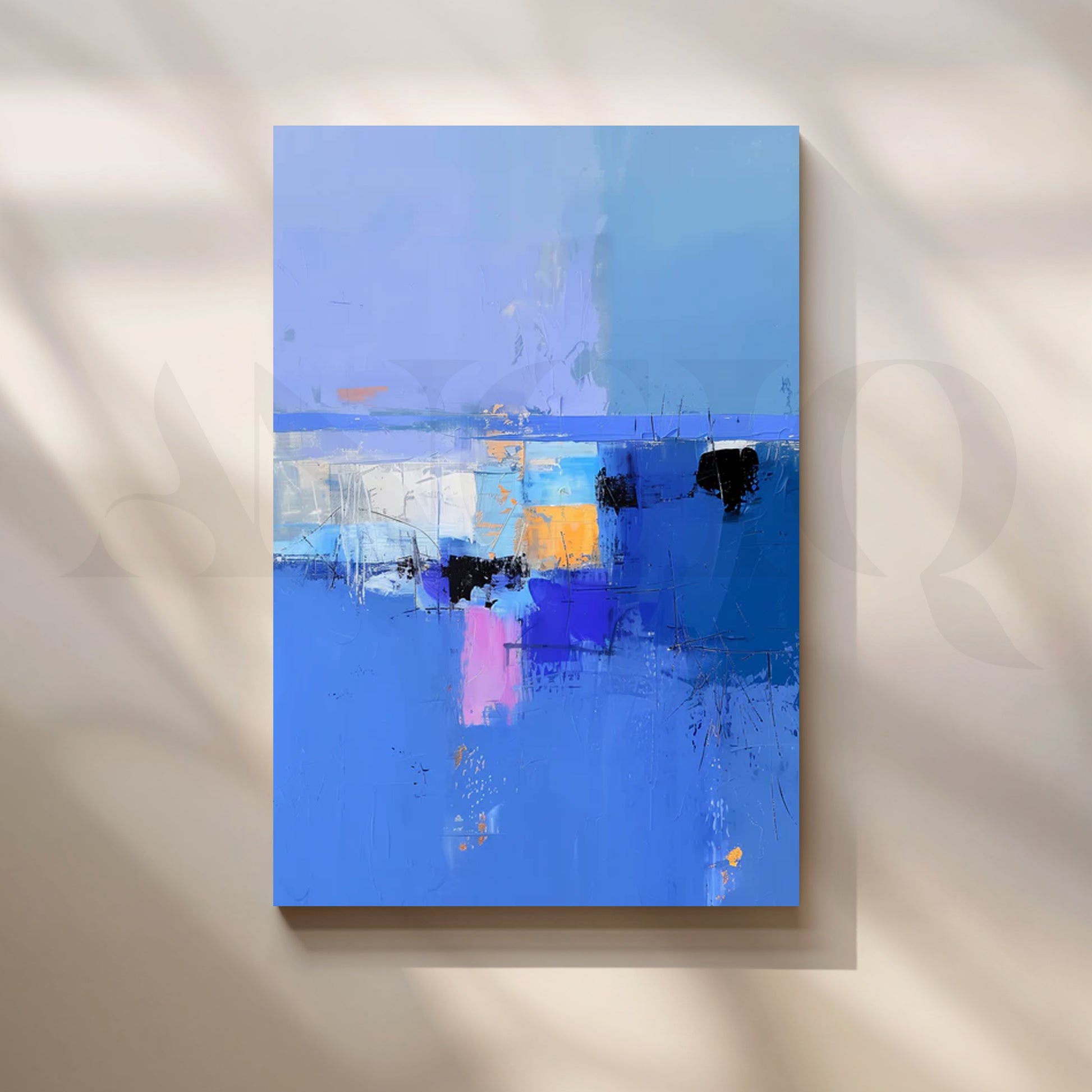 Soothing oceanic blues meet modern geometry in “Azure Horizon,” a textured abstract canvas painting built with palette-knife layers of cobalt, indigo, and sky tones, accented by soft white, lilac, blush pink, and pops of coral-orange and black. The serene, coastal palette and subtle horizon line evoke water and open air, creating calming modern wall art that elevates a coastal living room, bedroom, or home office. Perfect as blue abstract wall art, contemporary canvas print, minimalist décor, large living room art, or Scandinavian/boho coastal décor for bright, modern interiors.