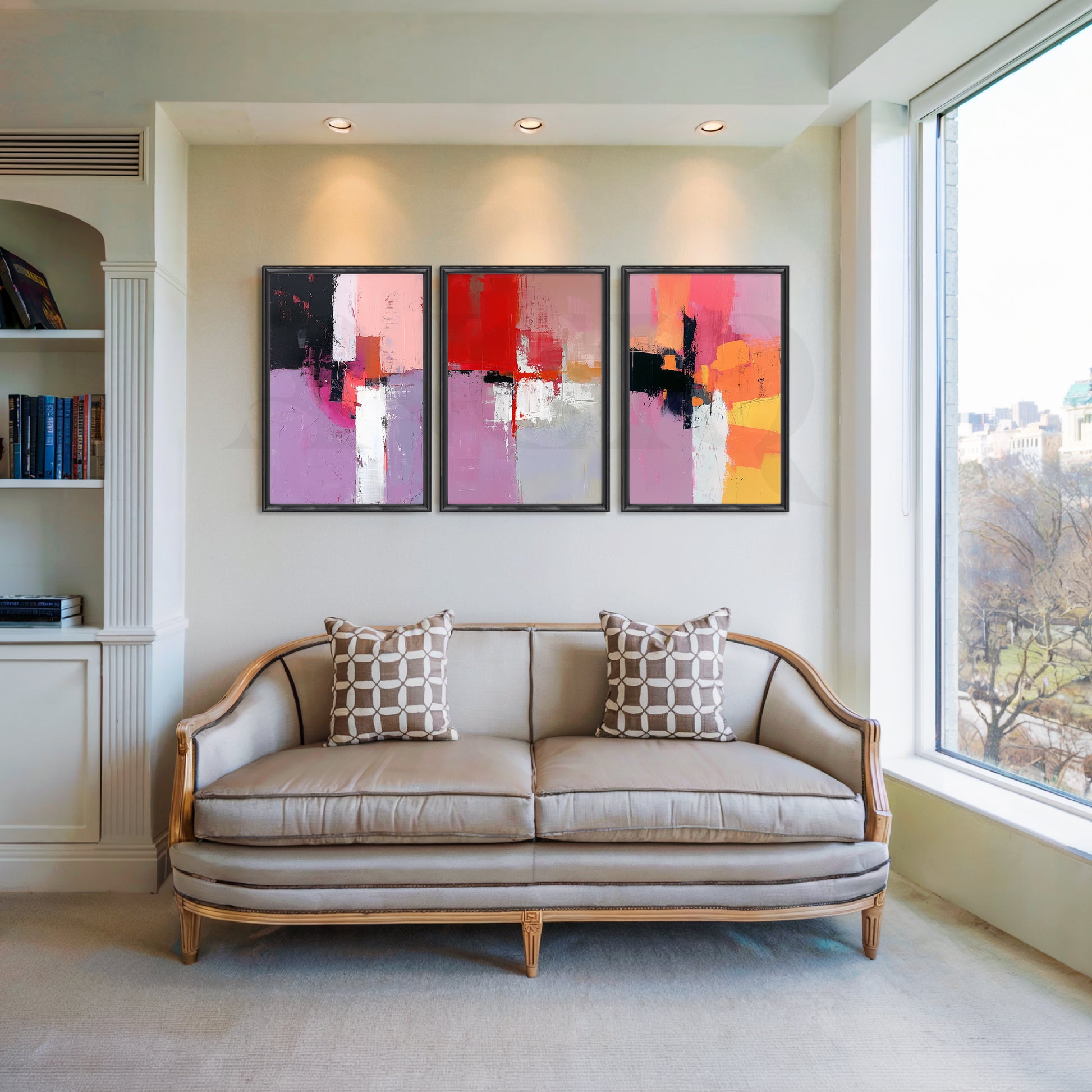 Anciq ‘Blush Abstract Blocks’ Gallery Wall features textured brushstrokes in soft pinks and bold reds, creating a modern, sophisticated focal point. Perfect for living rooms, bedrooms, or stylish office spaces, this 3-piece abstract set adds colour without overwhelming the room. Ideal for contemporary abstract wall art and minimalist décor lovers.