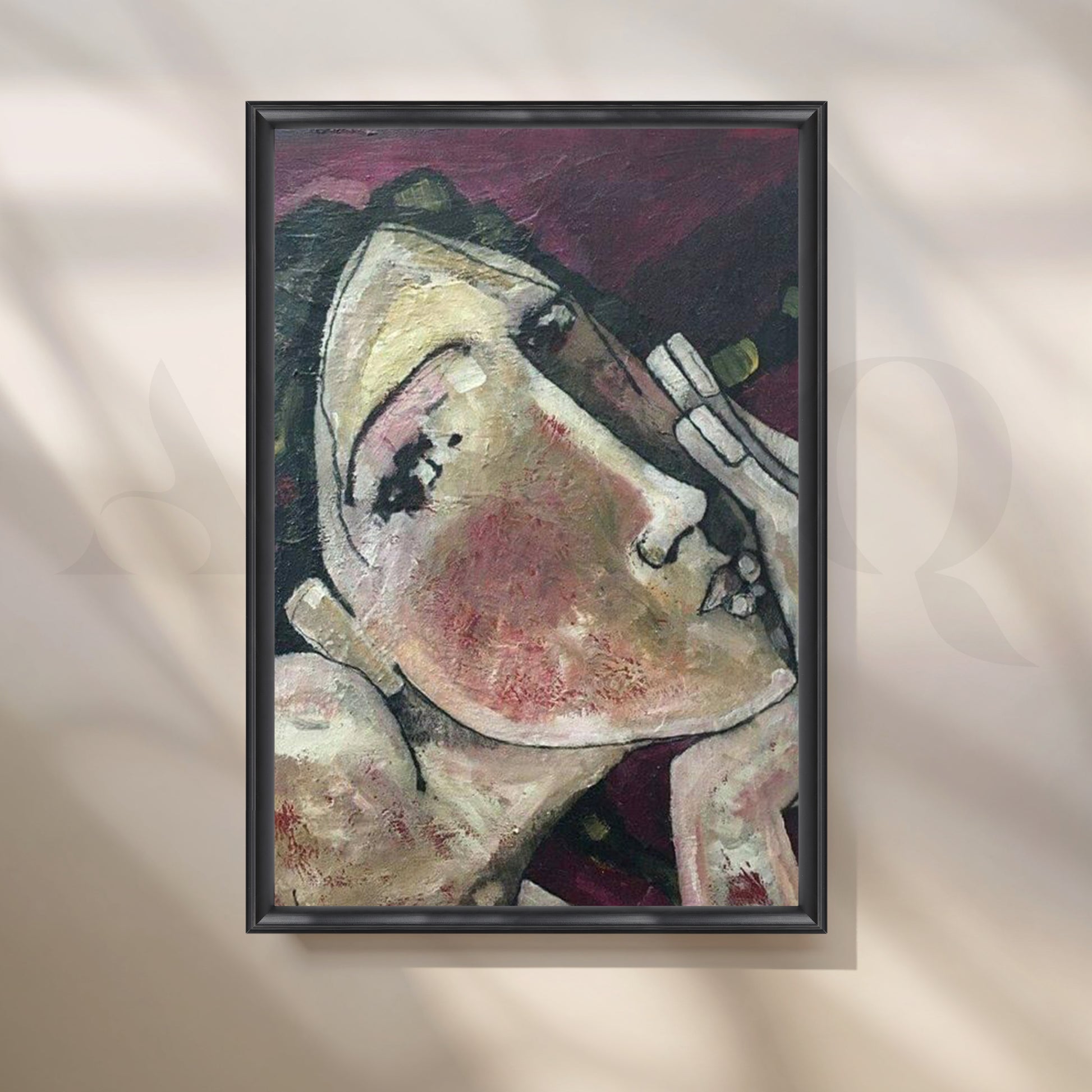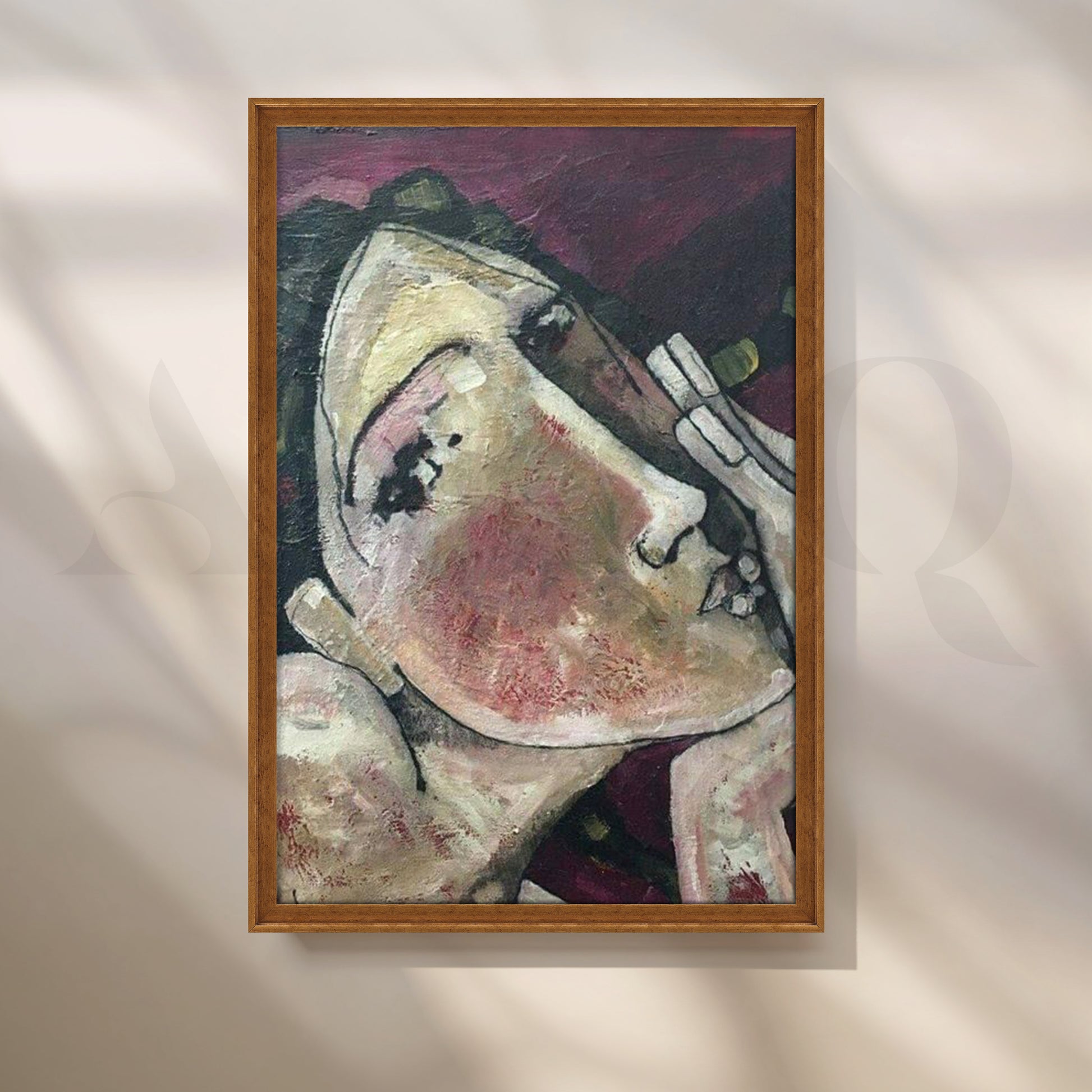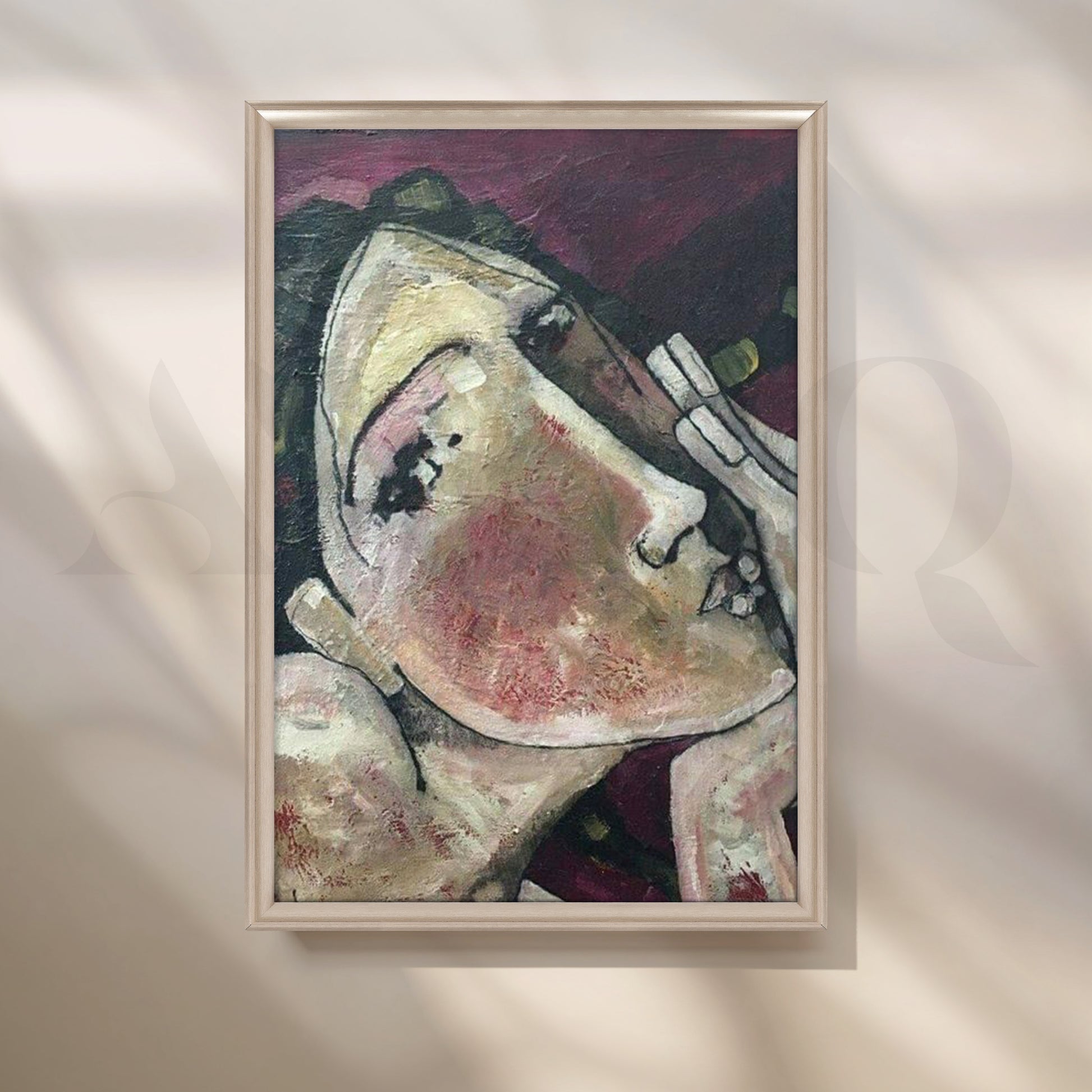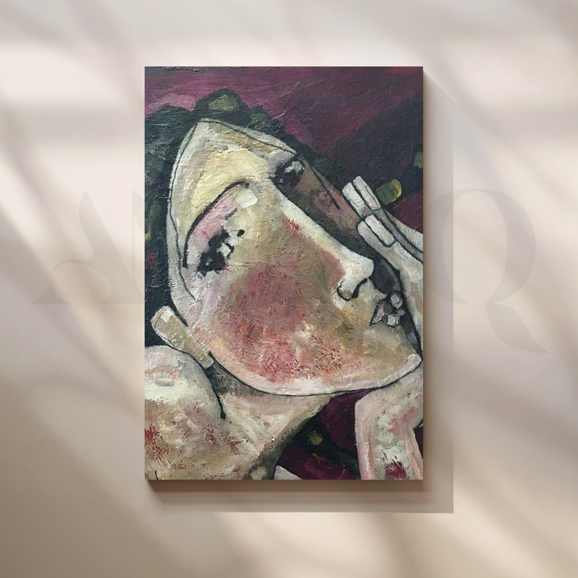 A tender, close-up portrait in warm blush, cream, and claret tones—eyes closed, head cradled—evokes calm and intimacy. Blush Reverie suits bedrooms, dressing areas, and vanity corners, adding a romantic, boho-lux touch. The painterly texture and soft color blocking pair beautifully with linen bedding, brass accents, and soft lighting. Keywords: romantic portrait art, feminine wall art, boho bedroom décor, soft color canvas, modern figurative painting, serene artwork for bedroom, contemporary canvas print.
