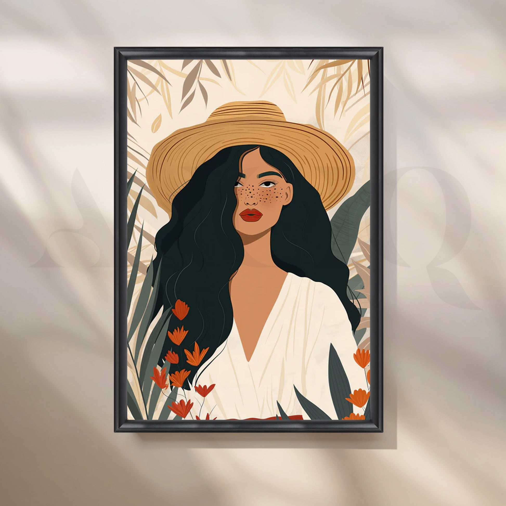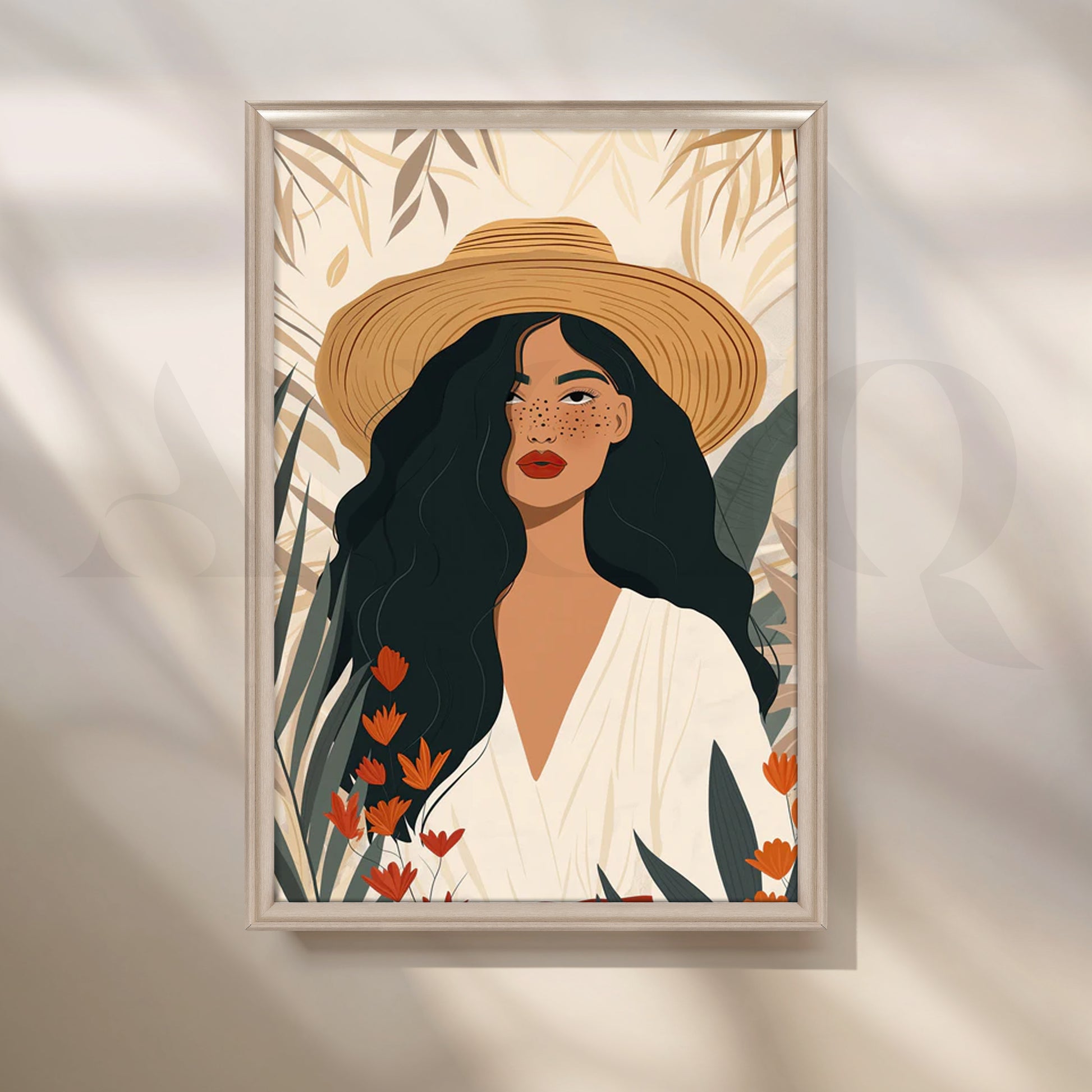 Celebrate effortless summer style with this modern wall art of a serene woman in a wide straw hat framed by warm florals and neutral leaves. Soft beige, terracotta, and sage tones create a calming palette that complements boho décor, coastal farmhouse accents, and minimalist spaces. Printed on gallery-wrapped canvas, this contemporary portrait adds warmth and texture as large living room art, hallway statement décor, or bedroom wall art—perfect for creating a relaxed, sun-kissed vibe.