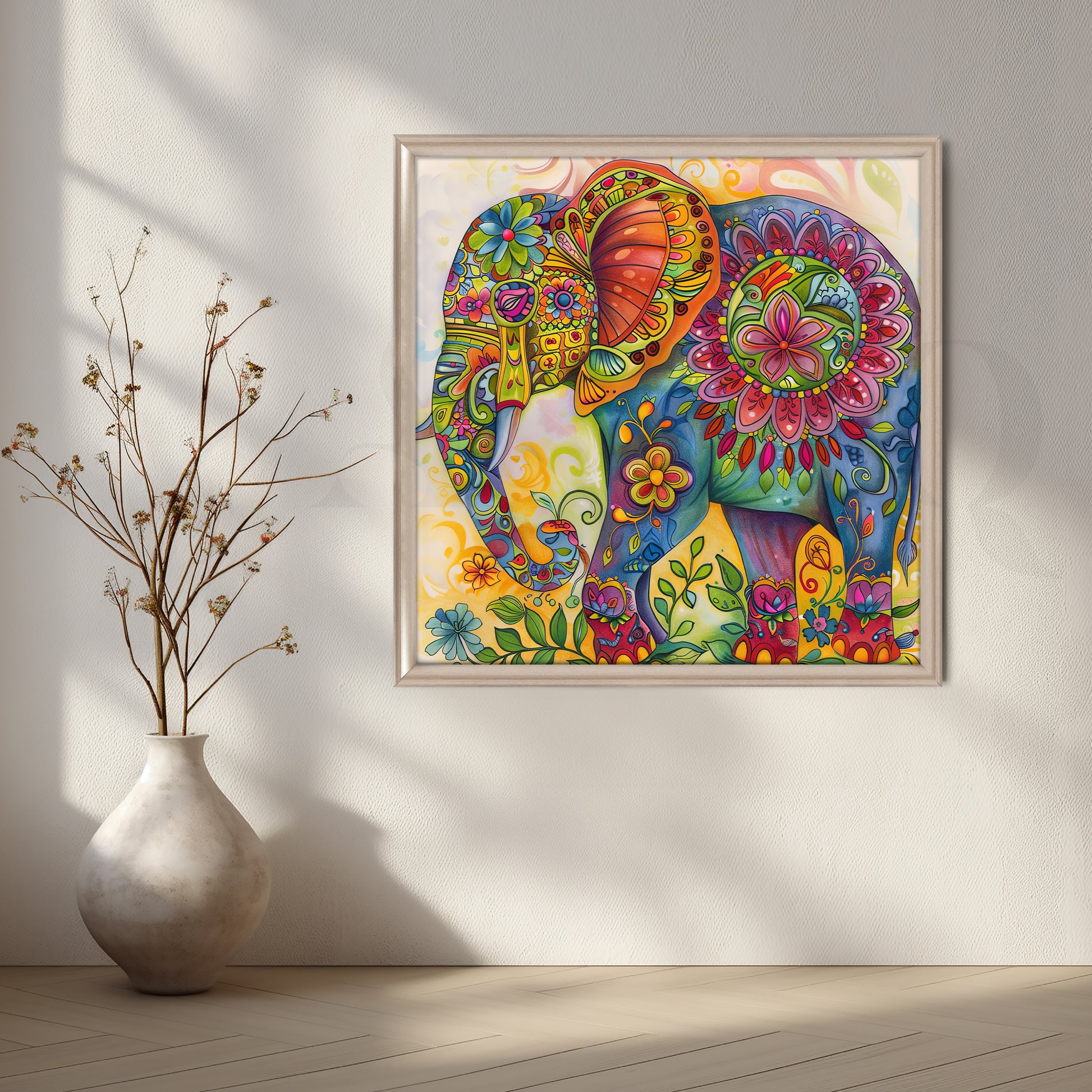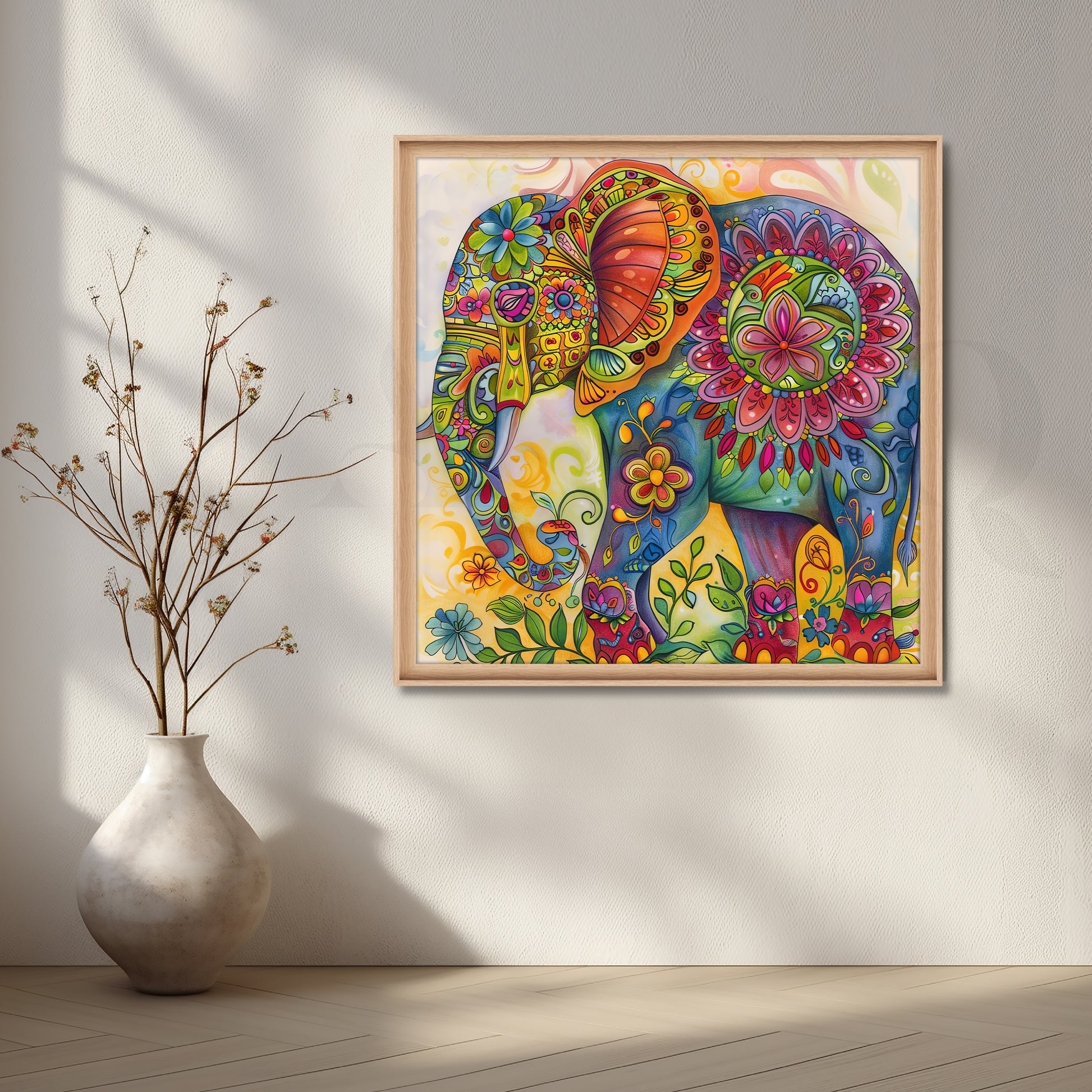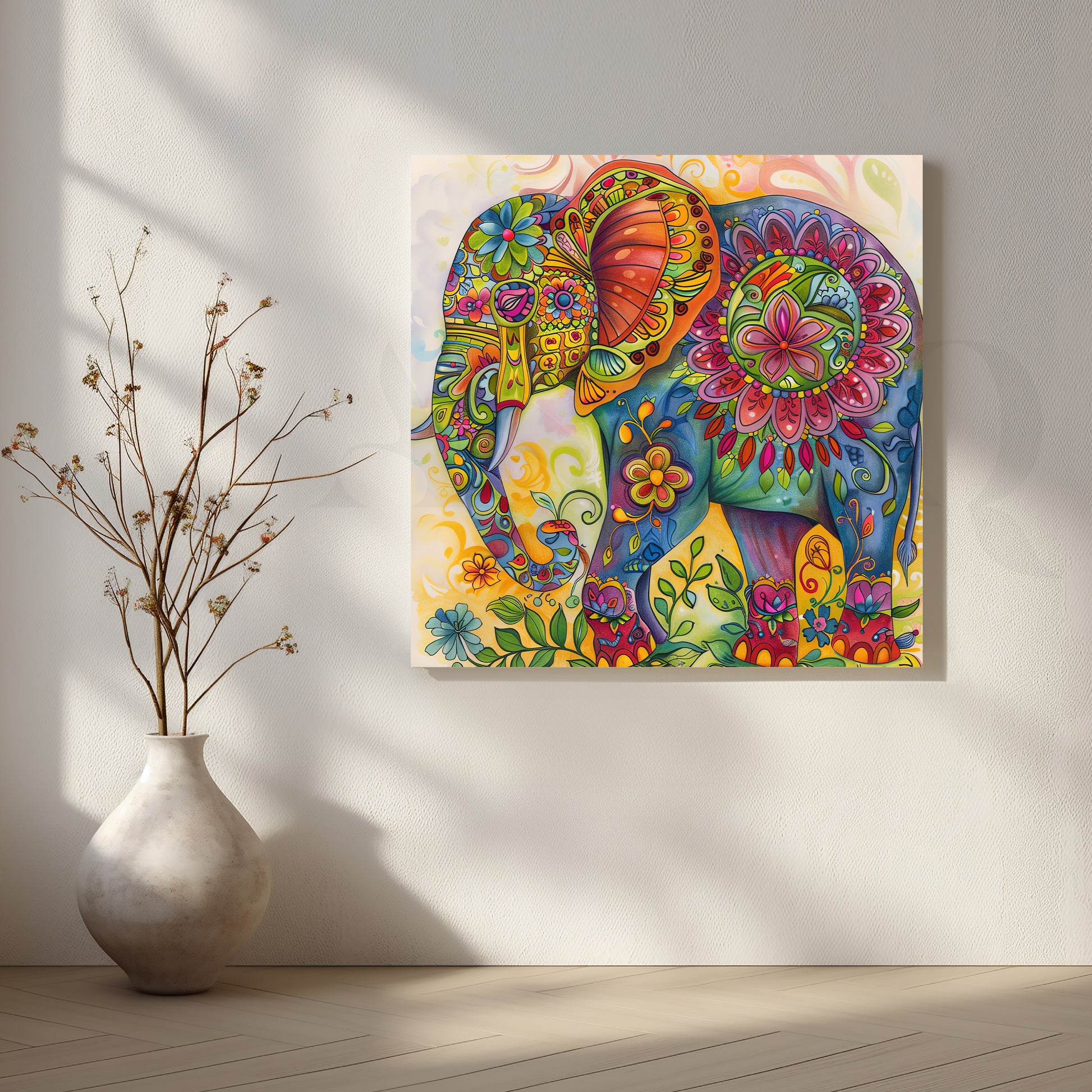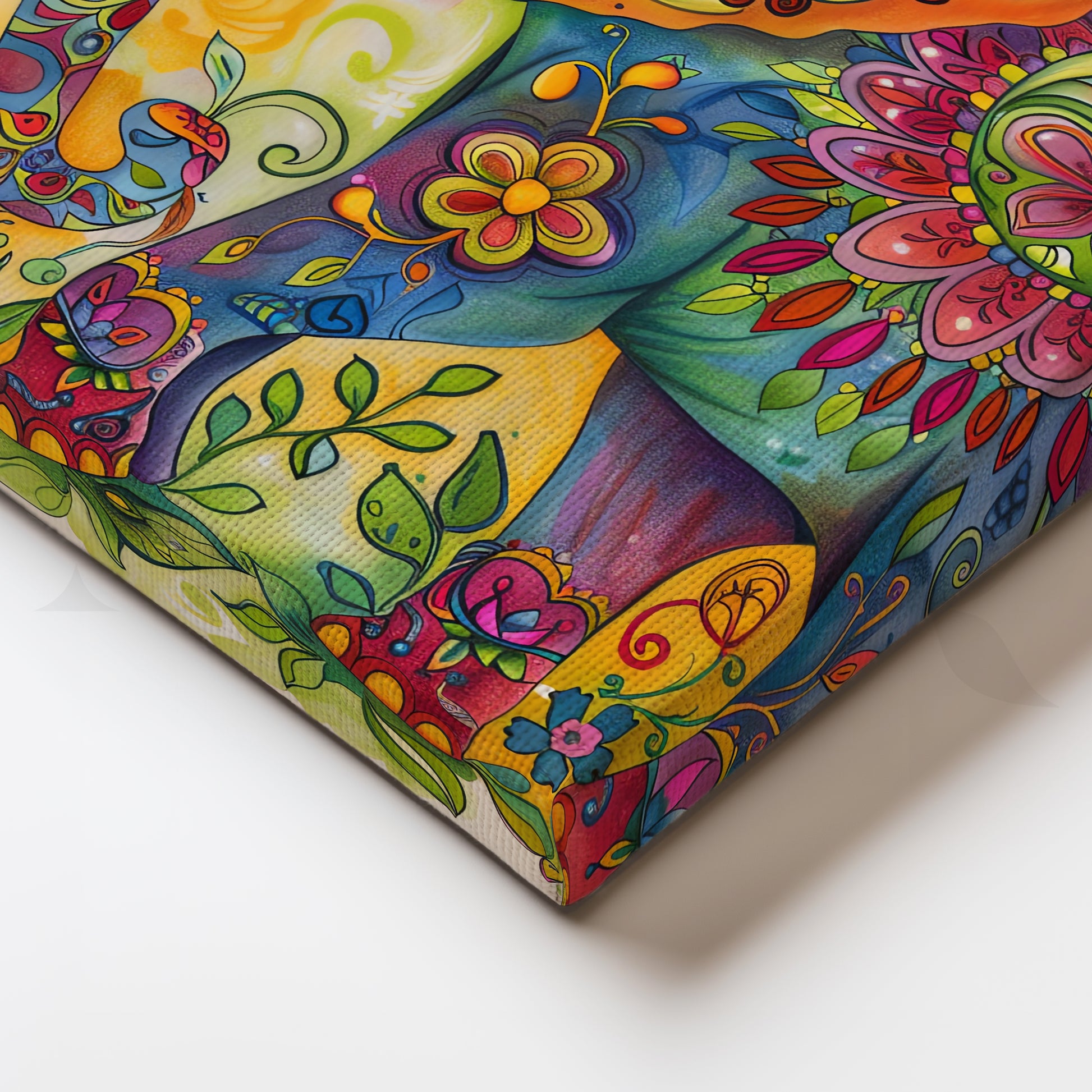 Add a burst of colour and joy to your home with Anciq’s “Boho Festival Elephant” canvas artwork. This vibrant piece showcases a richly patterned Indian elephant filled with mandalas, florals and psychedelic motifs in bright blues, pinks, yellows and greens. Set against a dreamy pastel background, it instantly energises any space as boho wall art, kids’ room décor, playroom art, or eclectic living room statement piece.