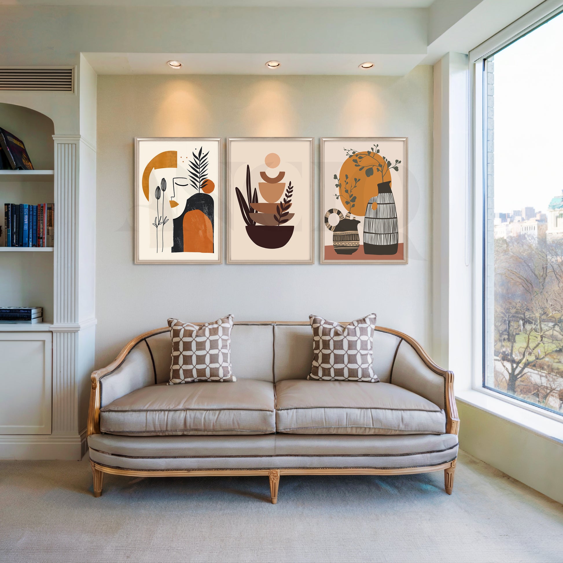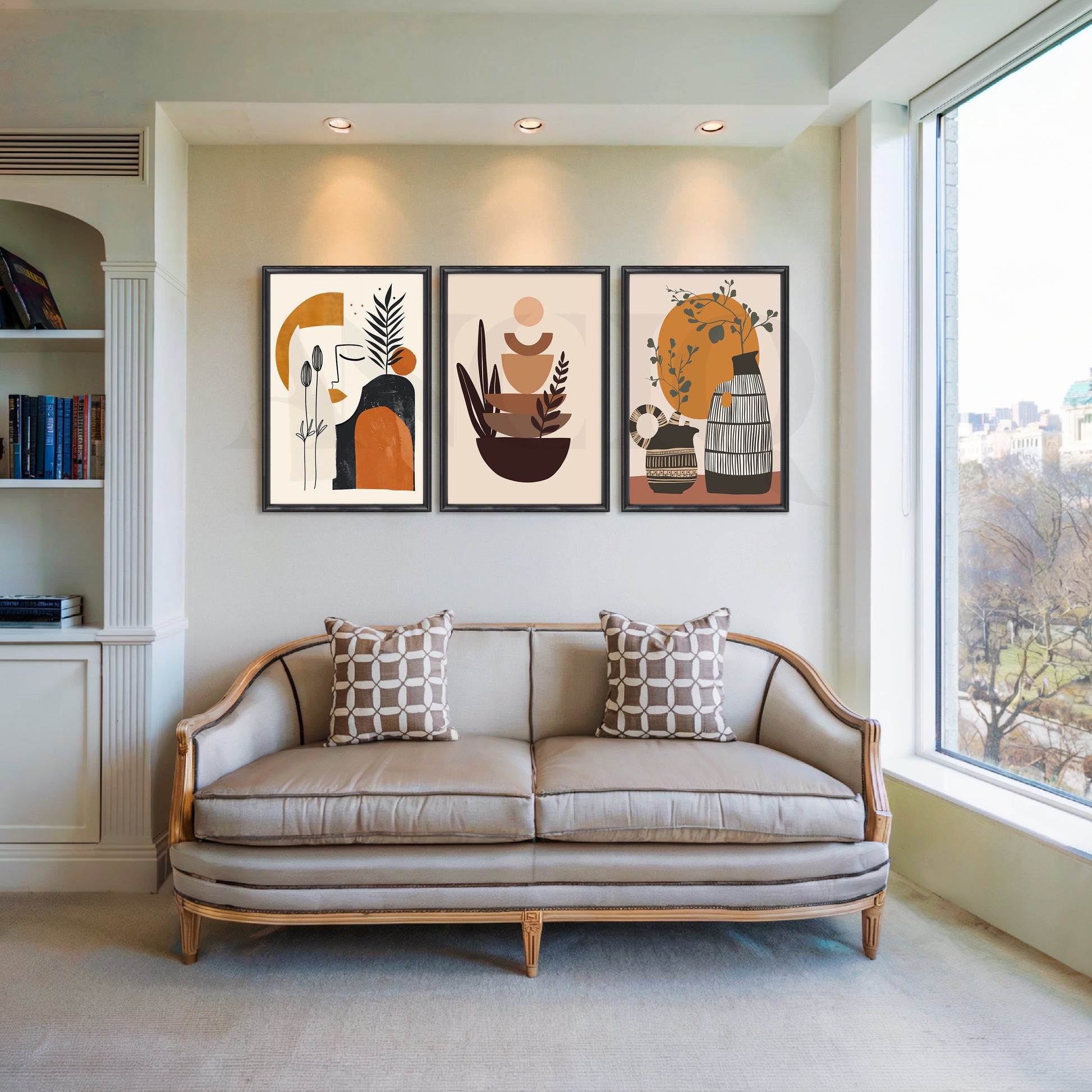 Anciq ‘Boho Terra Muse’ Gallery Wall combines abstract faces, stacked shapes, and rustic vases in warm earthy tones. Perfect for living rooms, dining areas, entryways, or cozy studio apartments, this 3-piece bohemian set brings a calm, contemporary feel to your walls. Ideal for boho wall art, neutral décor, and modern minimal interiors.