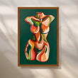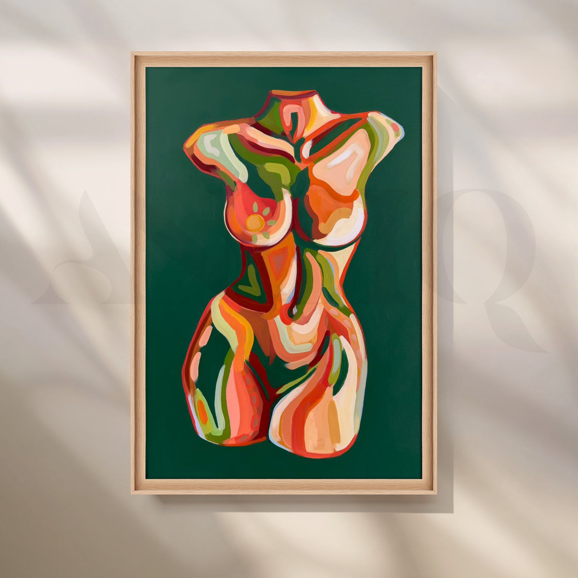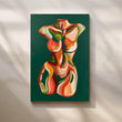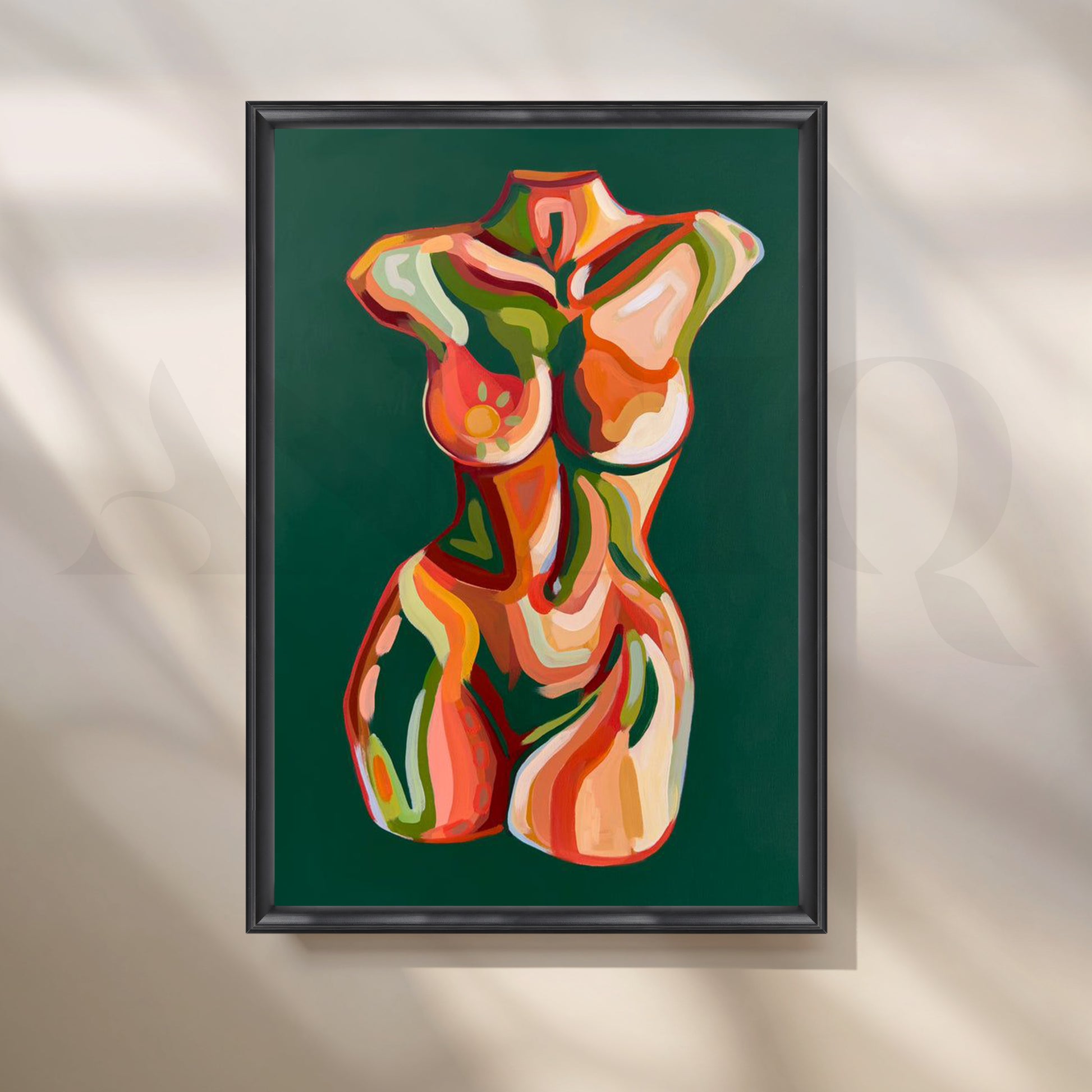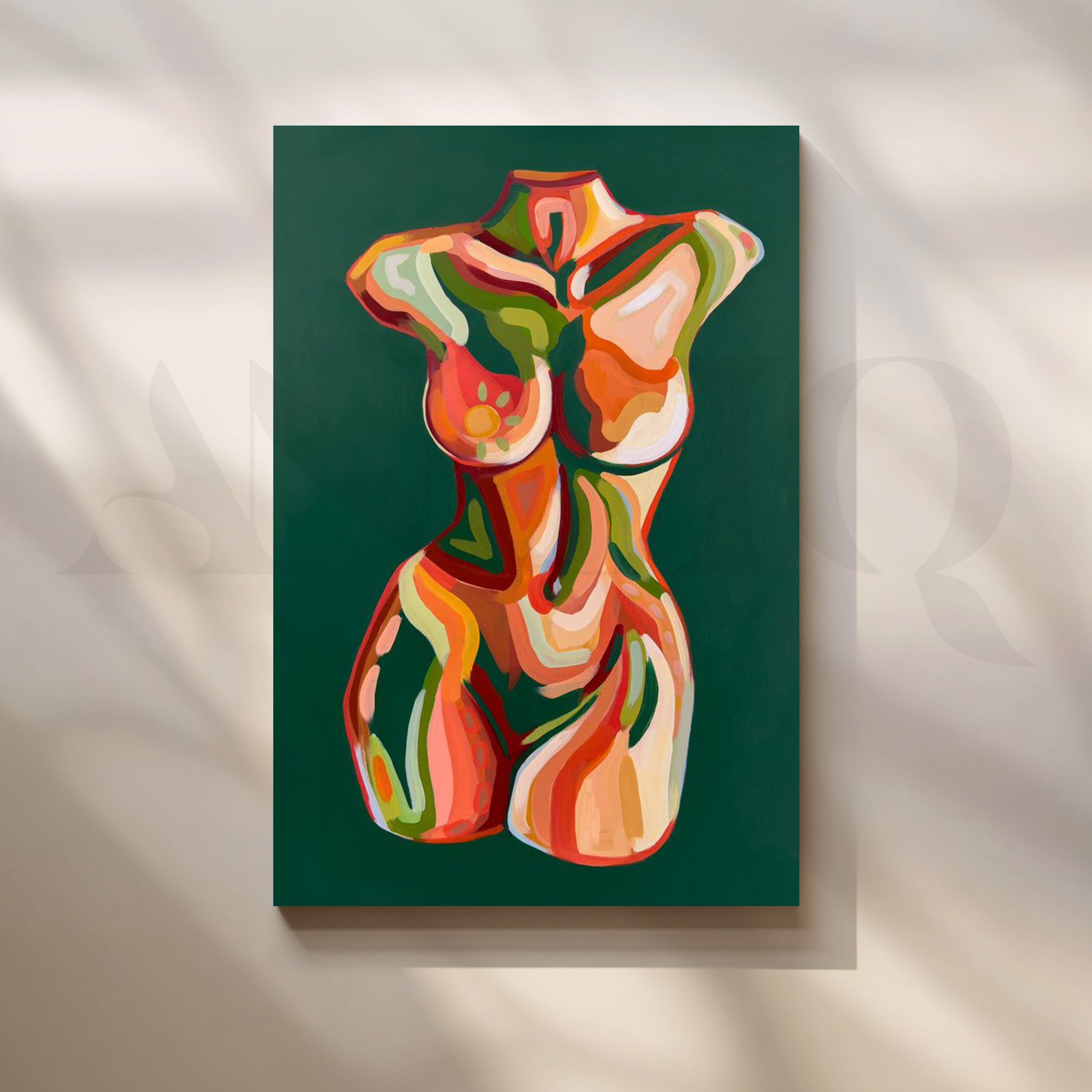 This canvas painting features a vivid, abstract female torso against a deep green backdrop—ideal for modern bedrooms or creative studios. Its fluid lines and multicolor strokes add a pop-art touch, appealing to collectors of feminine figure art and bold wall décor.