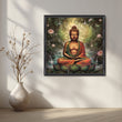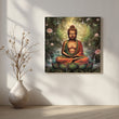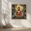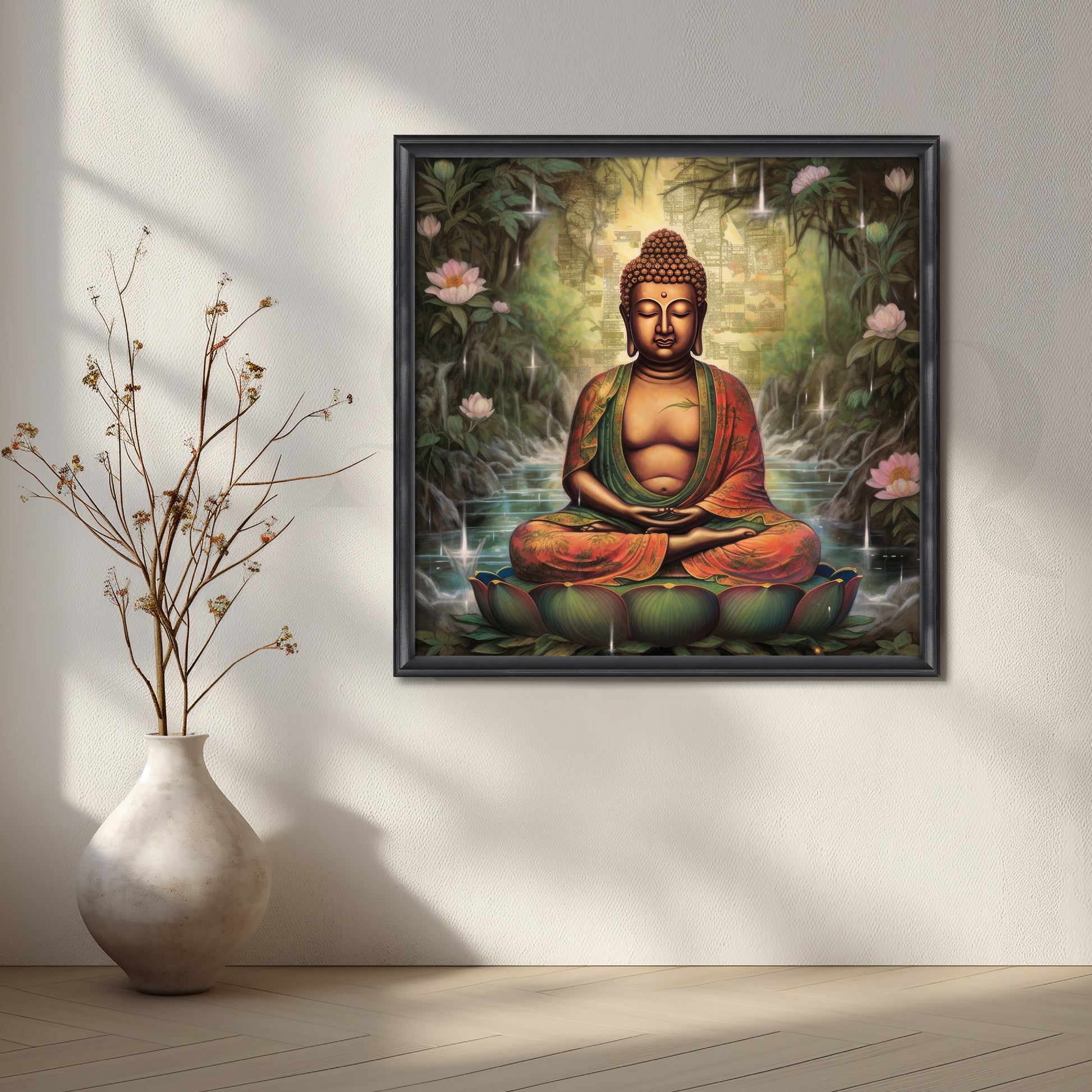 This canvas painting features Gautam buddha artwork in a peaceful meditation, seated on a vibrant lotus surrounded by serene water and blooming lotuses. The lush greenery and cascading waterfalls create a tranquil atmosphere, blending nature's beauty with spiritual calm. The soft glow of light filters through the trees, enhancing the serenity of the scene, and inviting reflection on harmony and inner peace. The backdrop of abstract patterns adds a subtle depth to the spiritual ambiance.