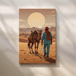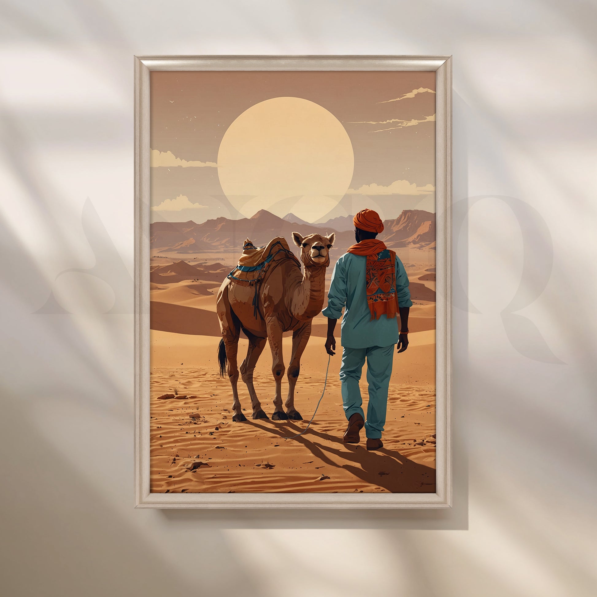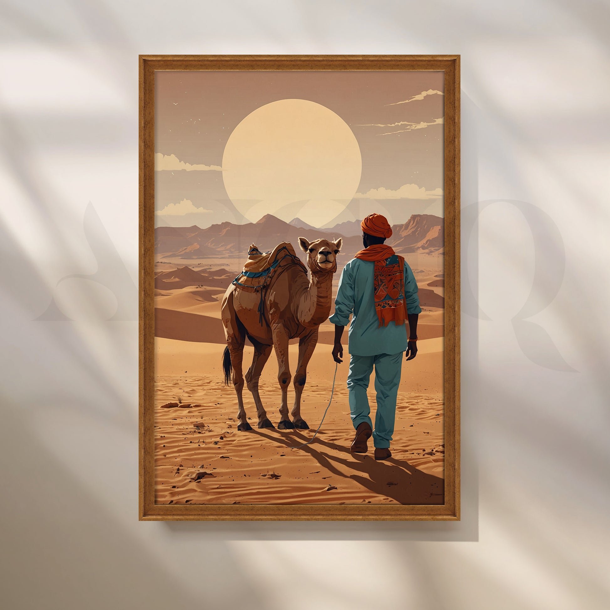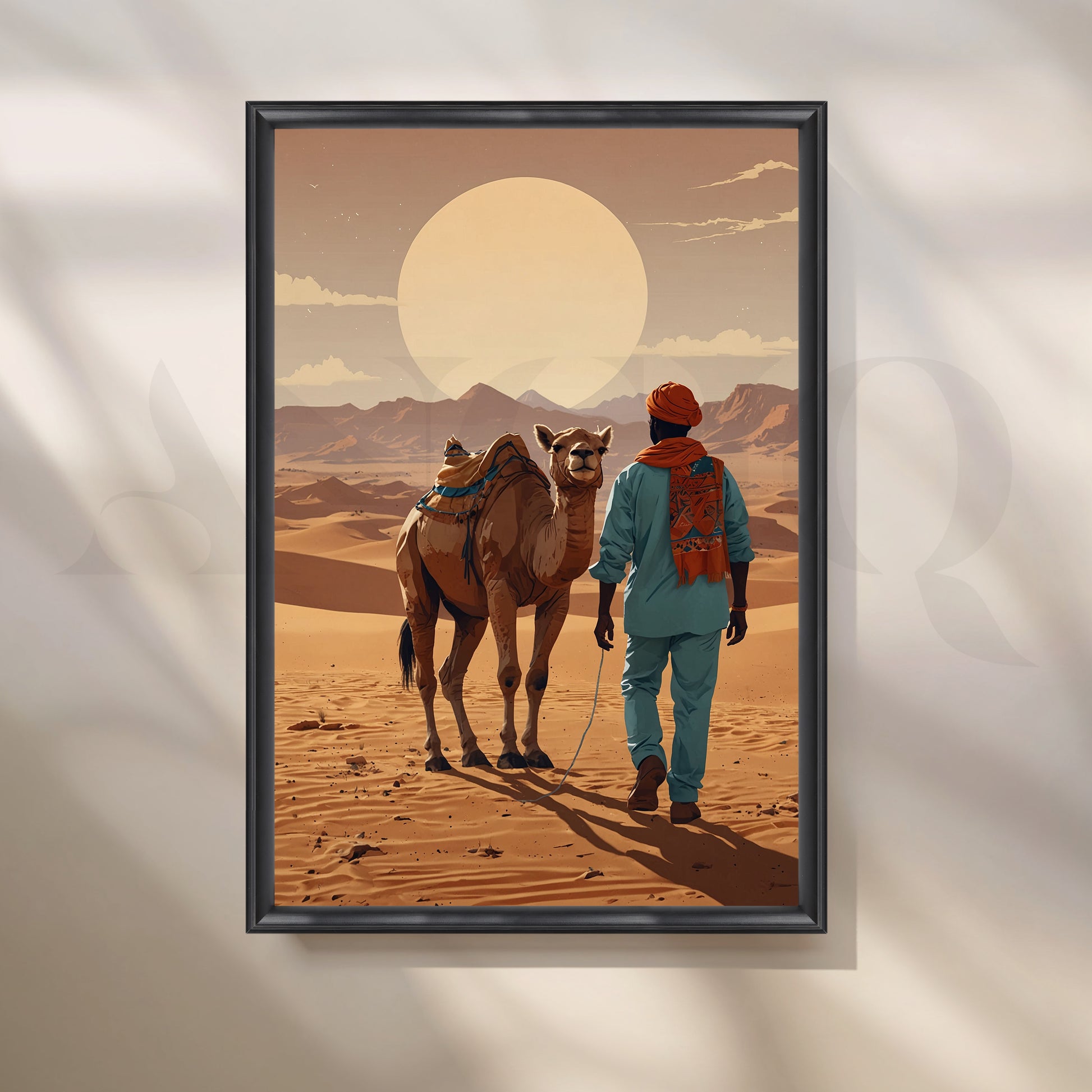 This striking canvas artwork shows a Rajasthani traveller walking beside his camel across endless dunes under a soft golden sun. Earthy tones and detailed attire celebrate desert life and Indian culture. Ideal Rajasthani wall art for study rooms, hallways and living spaces seeking calm, travel-inspired ethnic décor.