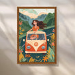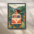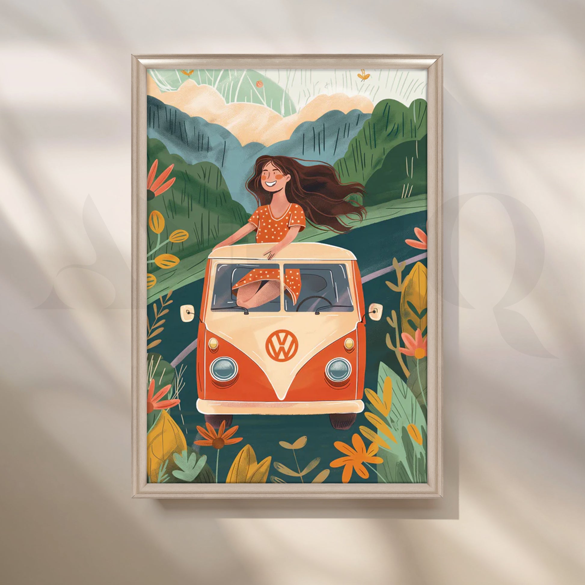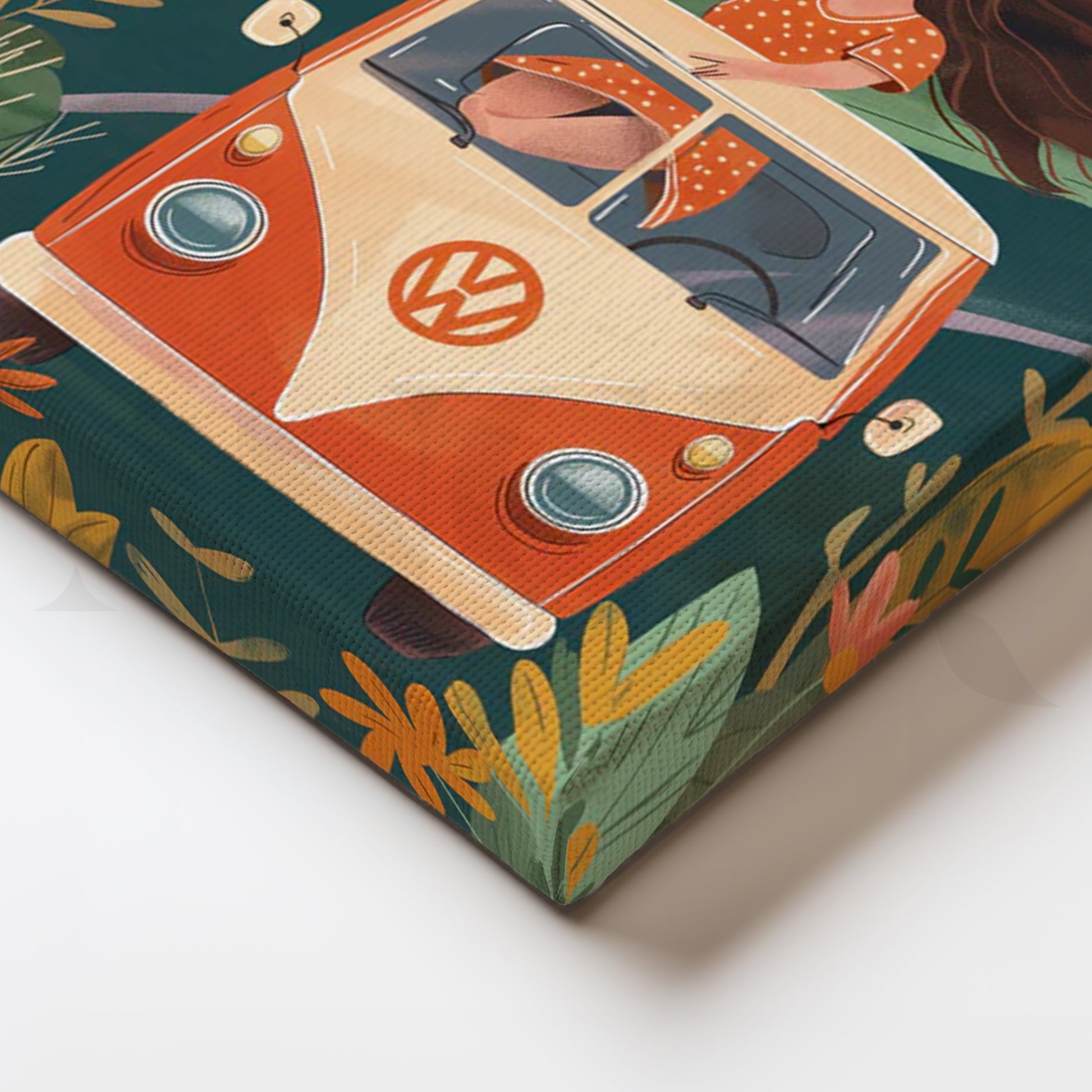 Whimsical travel scene of a joyful girl in a retro van cruising through lush, floral hills—painted in warm oranges and leafy greens. This cheerful canvas brightens a living room, hallway, or kid’s playroom with boho wall décor and vintage nostalgia. A vibrant, modern canvas painting for wanderlust homes seeking colorful large living room art and feel-good vibes.
