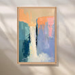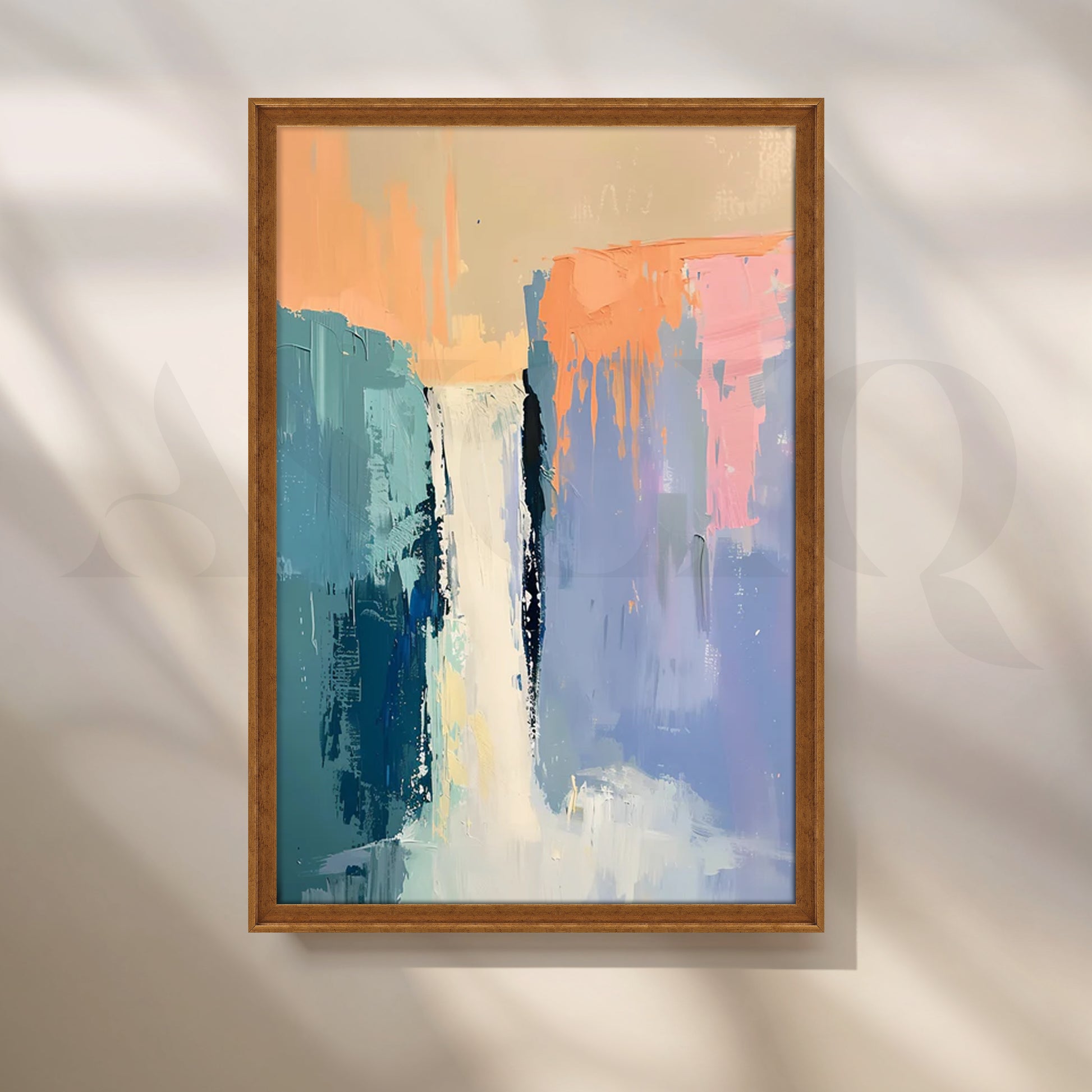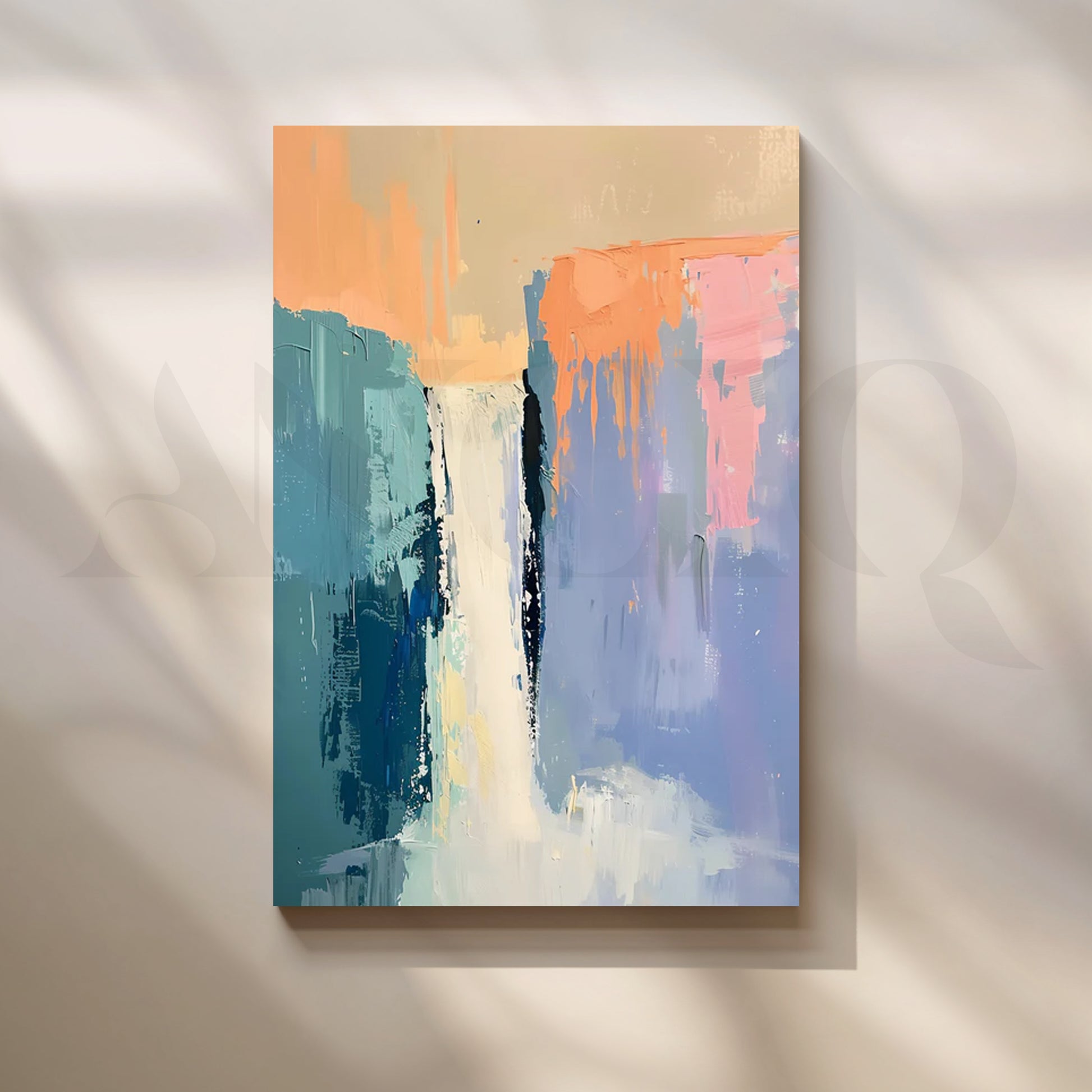 Serene and airy, this abstract waterfall canvas painting blends ocean teal, soft periwinkle, blush pink, and warm peach with palette-knife texture to suggest a luminous cascade. The soothing, pastel color palette and modern, minimalist composition make it perfect as spa bathroom wall art, while also elevating a calm living room or bedroom. Styled for contemporary interiors, this modern wall art doubles as an abstract canvas painting for coastal décor, boho bedroom décor, or Scandinavian spaces—ideal keywords for shoppers seeking large bathroom art, pastel wall art, and tranquil home décor.