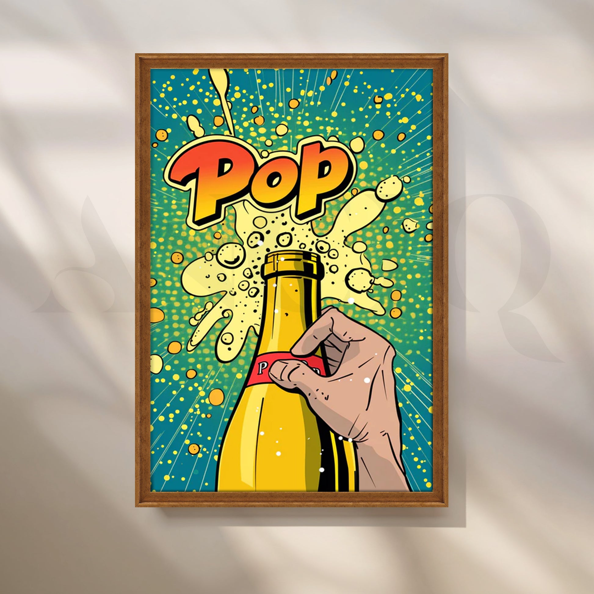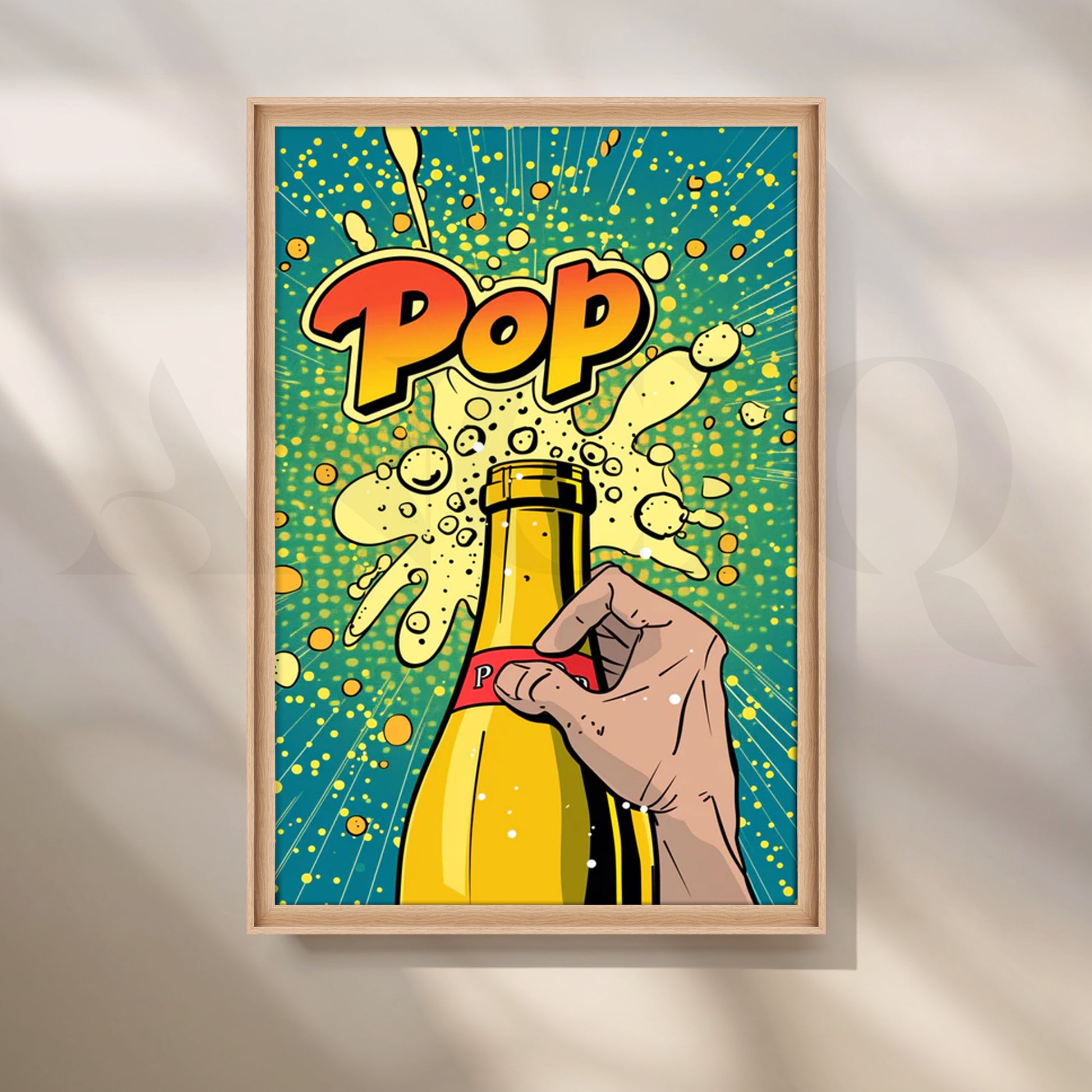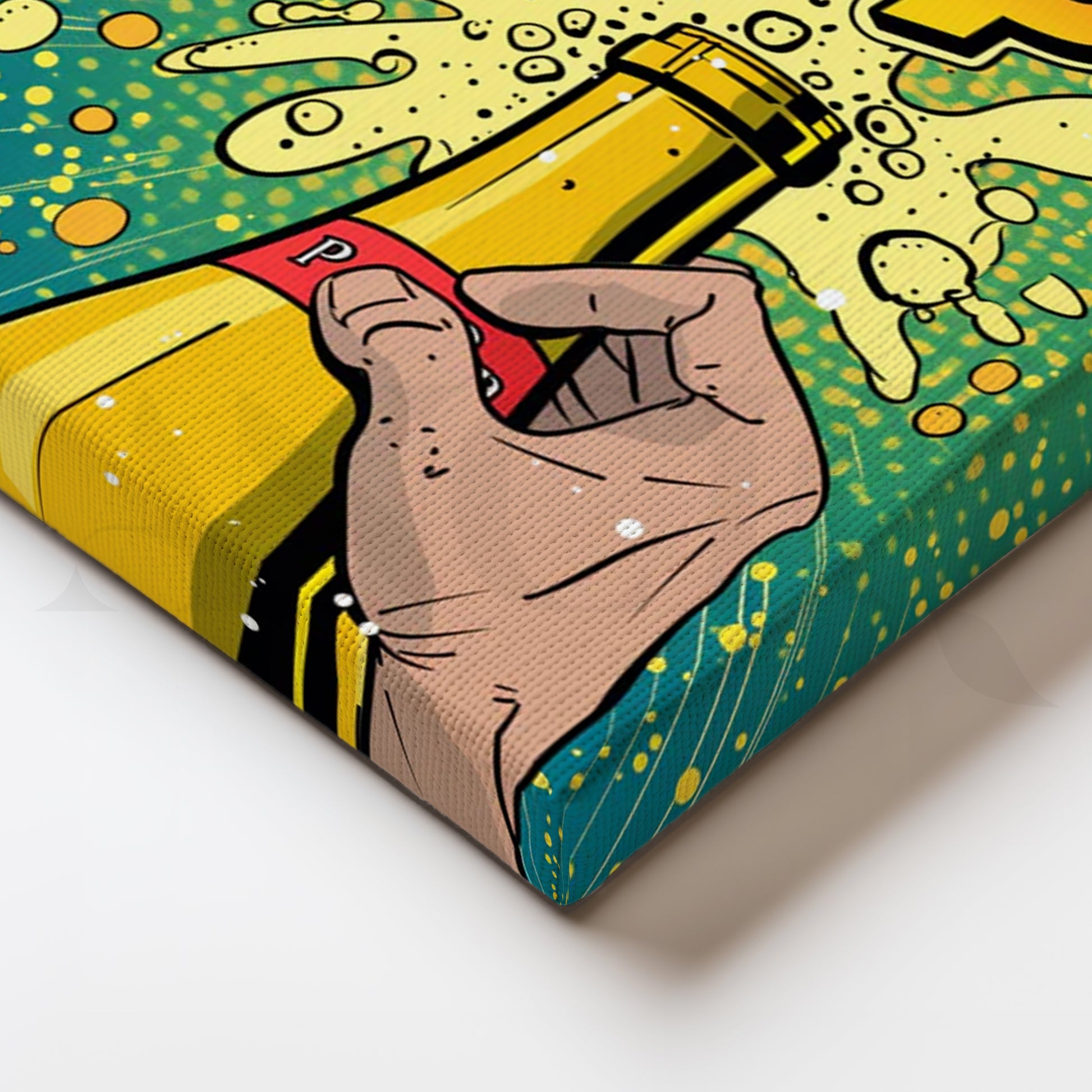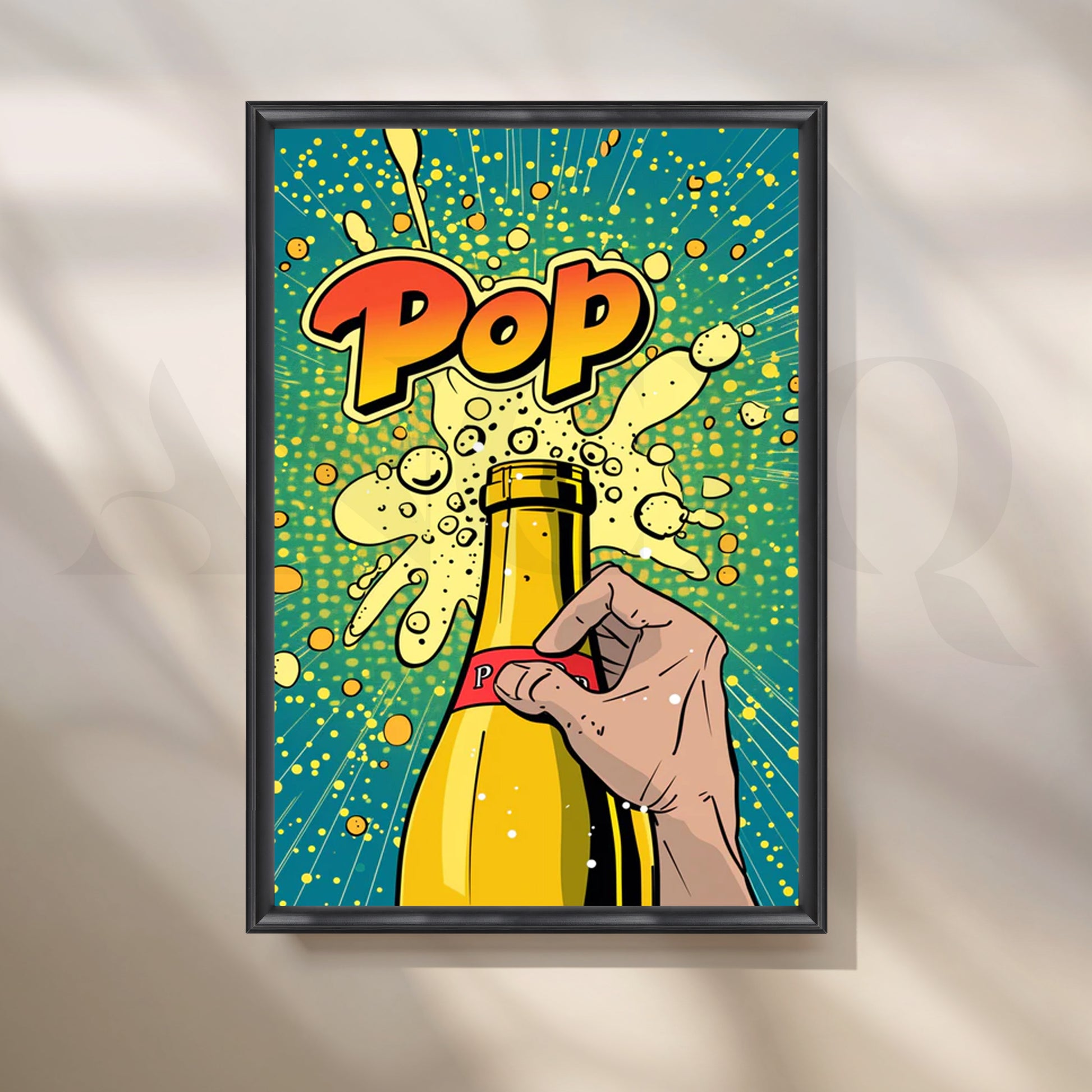 Champagne Pop Art Wall Poster bursts with energy, featuring a dynamic comic-style explosion of a champagne bottle being uncorked. This wall poster captures the excitement of celebration with bold colors, halftone details, and retro pop art vibes. Perfect for adding a festive and lively touch to any space, making it a standout decor piece for party lovers and art enthusiasts.
