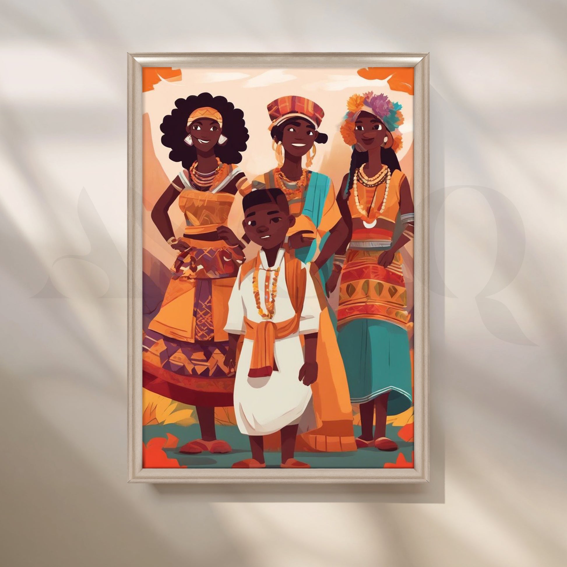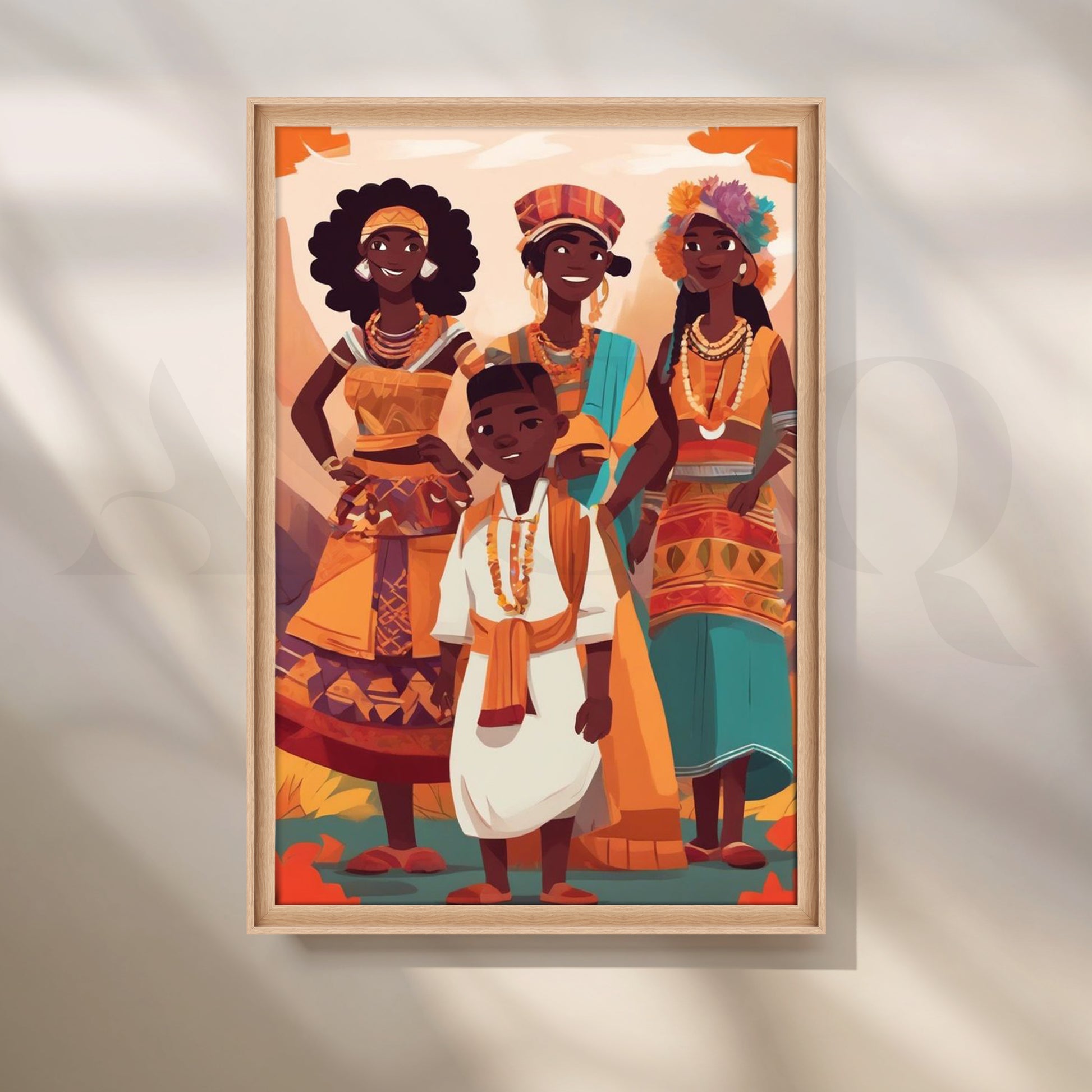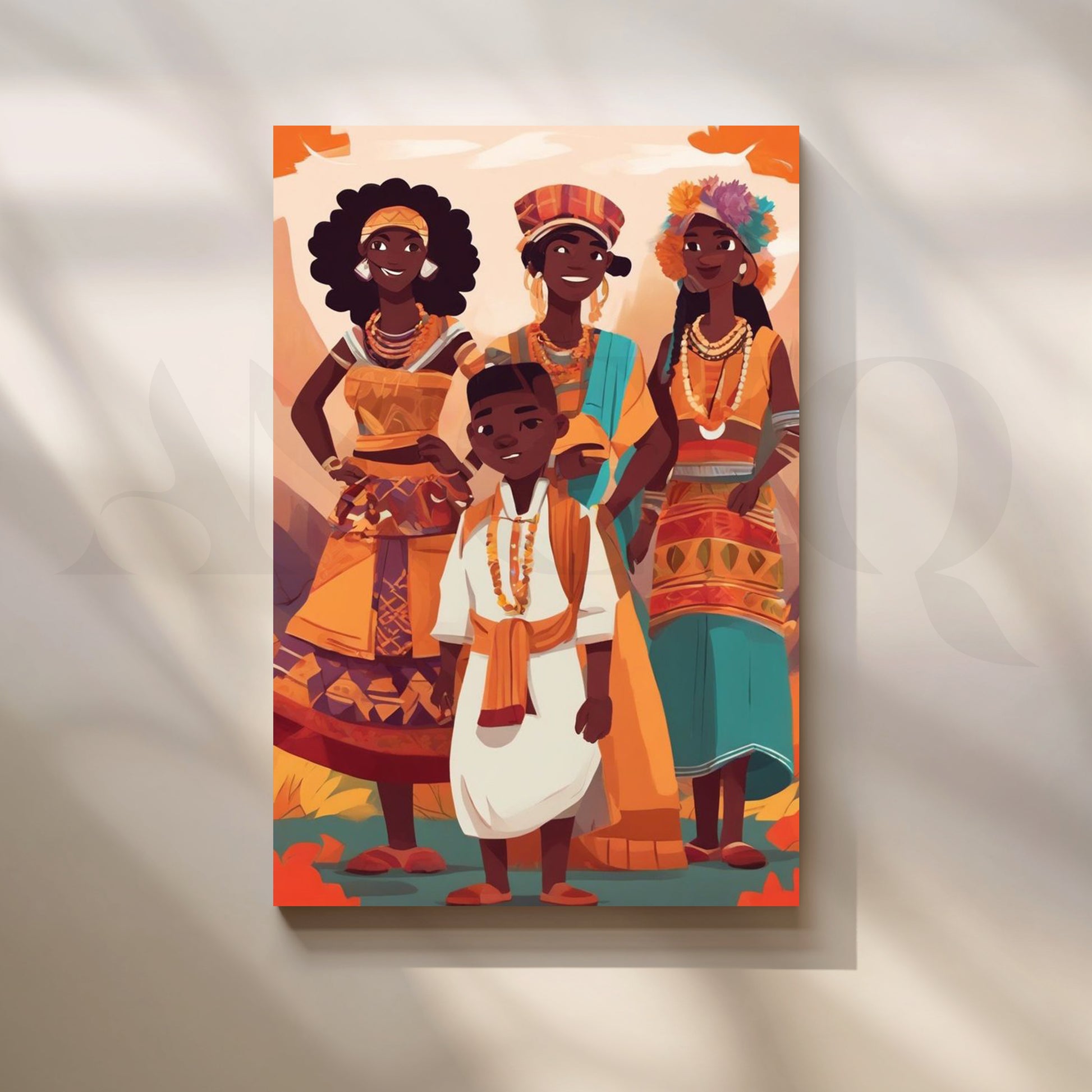 This vibrant African family portrait canvas art celebrates culture, colour and togetherness. Rich ethnic outfits, bold patterns and warm earthy tones make this canvas painting perfect for living rooms, kids’ rooms and creative studios. Add this joyful wall décor to bring storytelling, global culture and a happy, welcoming vibe into your home.