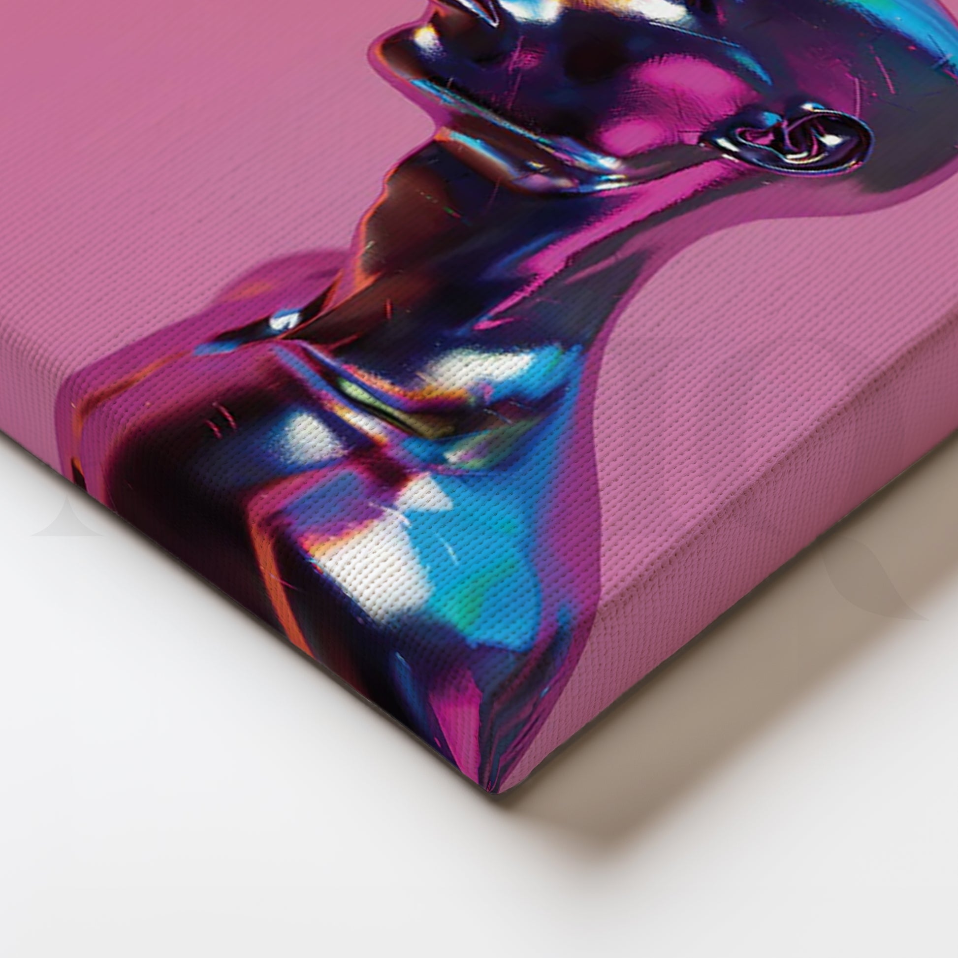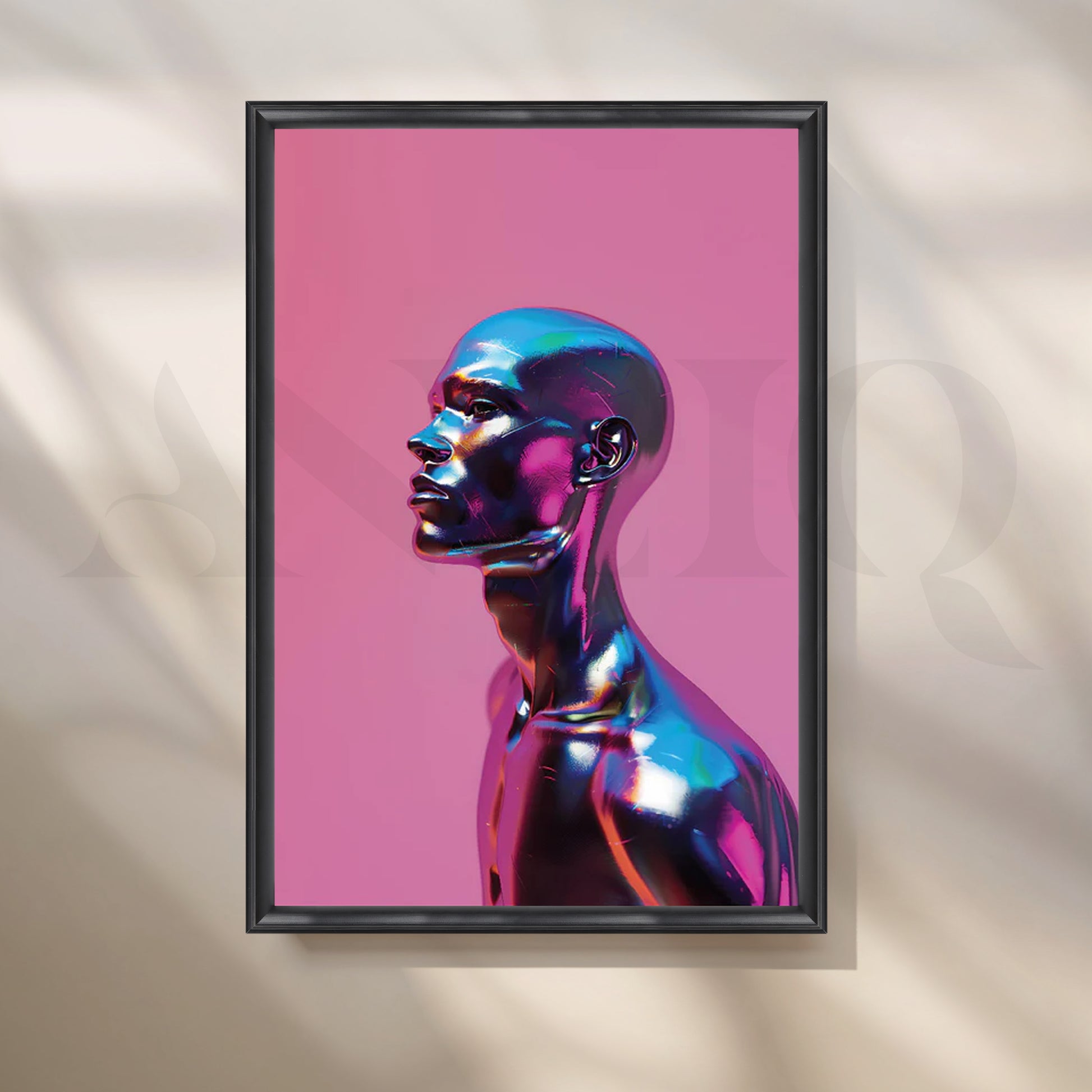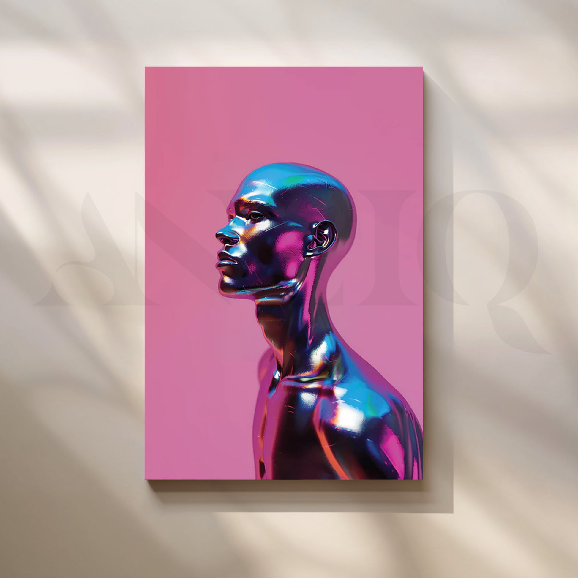 Make a fearless statement with this futuristic portrait: a sleek, chrome-like figure rendered in iridescent blues, magentas, and teal highlights against a bold hot-pink backdrop. The glossy, cyberpunk finish and minimalist profile create modern wall art that pops in a living room, office, or creative studio. Perfect for buyers searching “abstract canvas painting,” “pop art portrait,” “neon wall art,” “futuristic decor,” and “large contemporary wall art,” this gallery-wrapped canvas delivers high-impact color, edgy style, and instant conversation-piece energy.